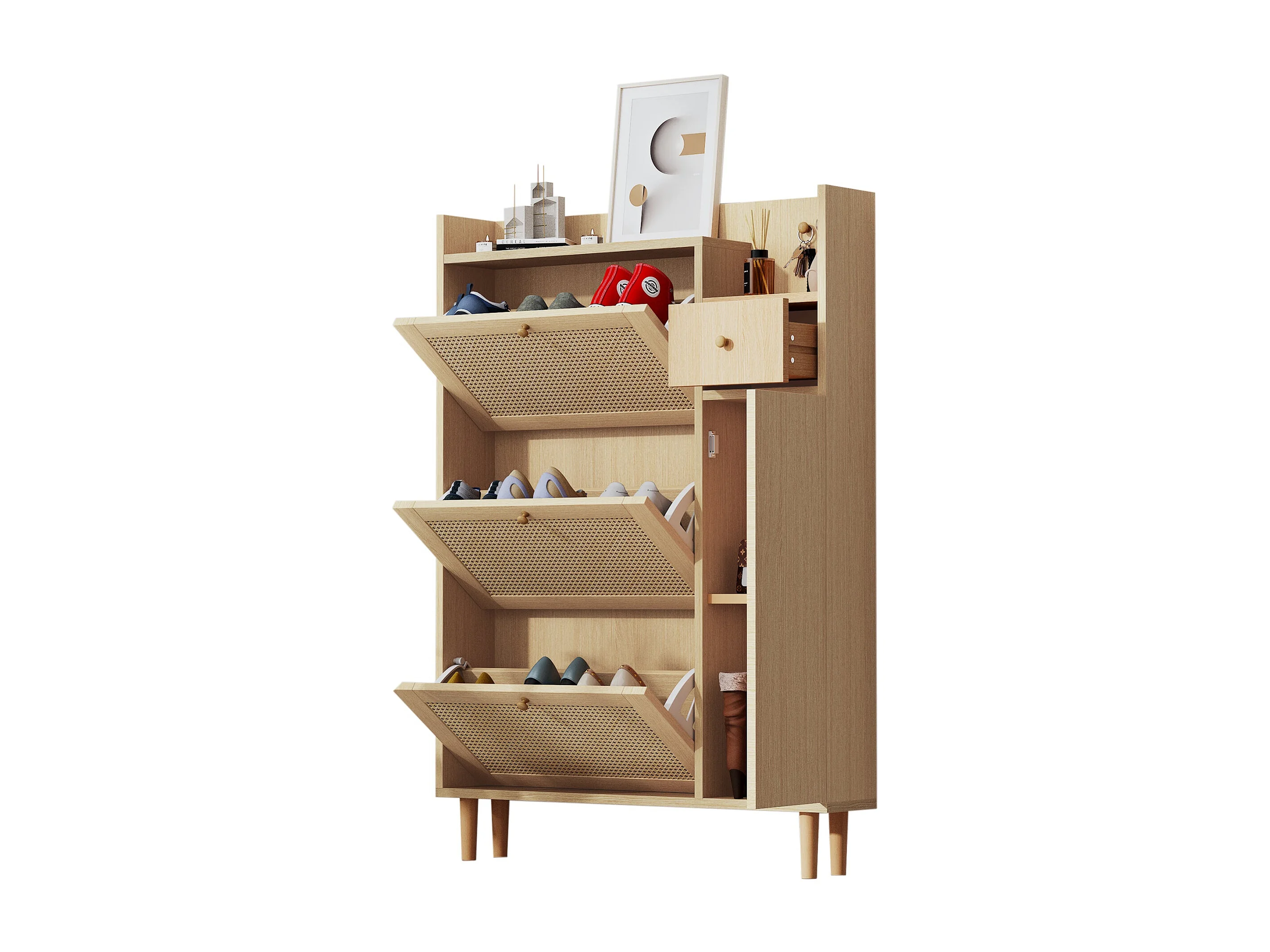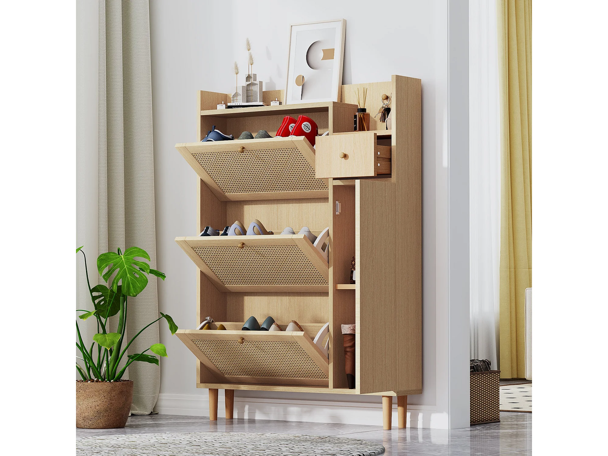 Meuble à chaussures en rotin avec 3 portes basculantes,d90cm×h125cm