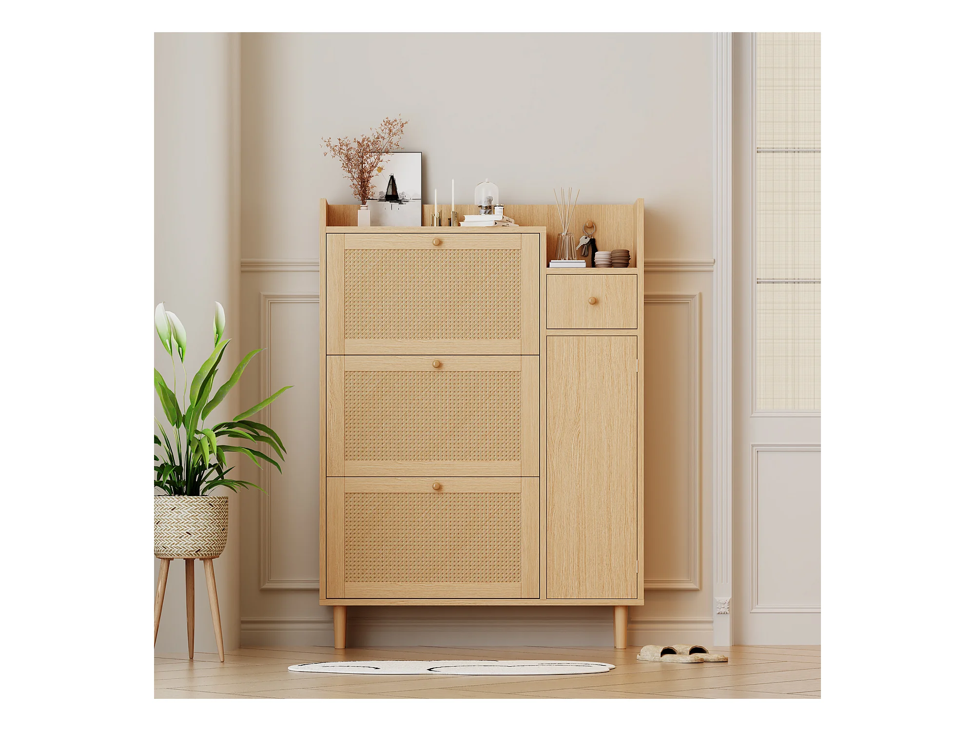 Meuble à chaussures en rotin avec 4 portes et 1 tiroir, pieds et poignées en bois