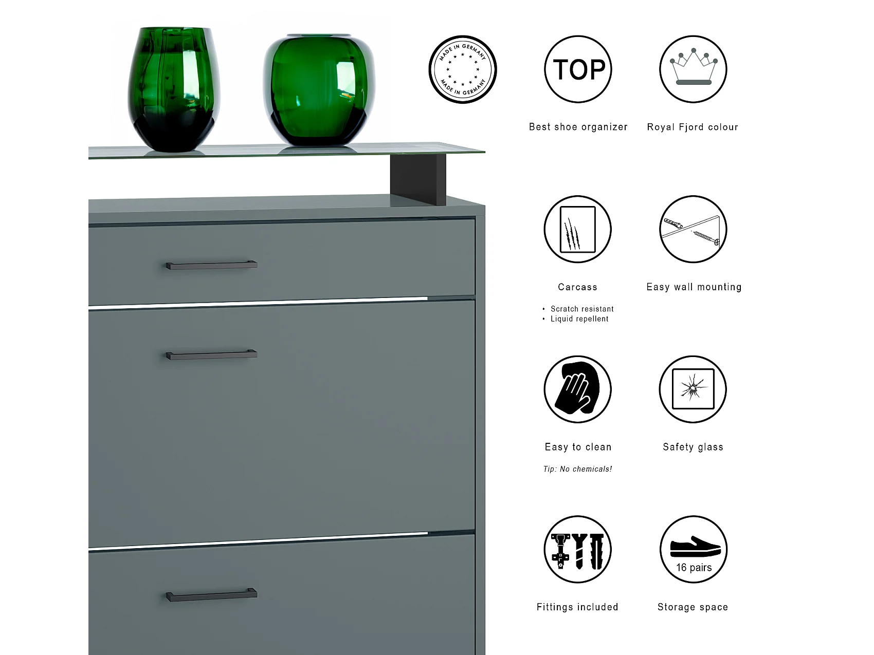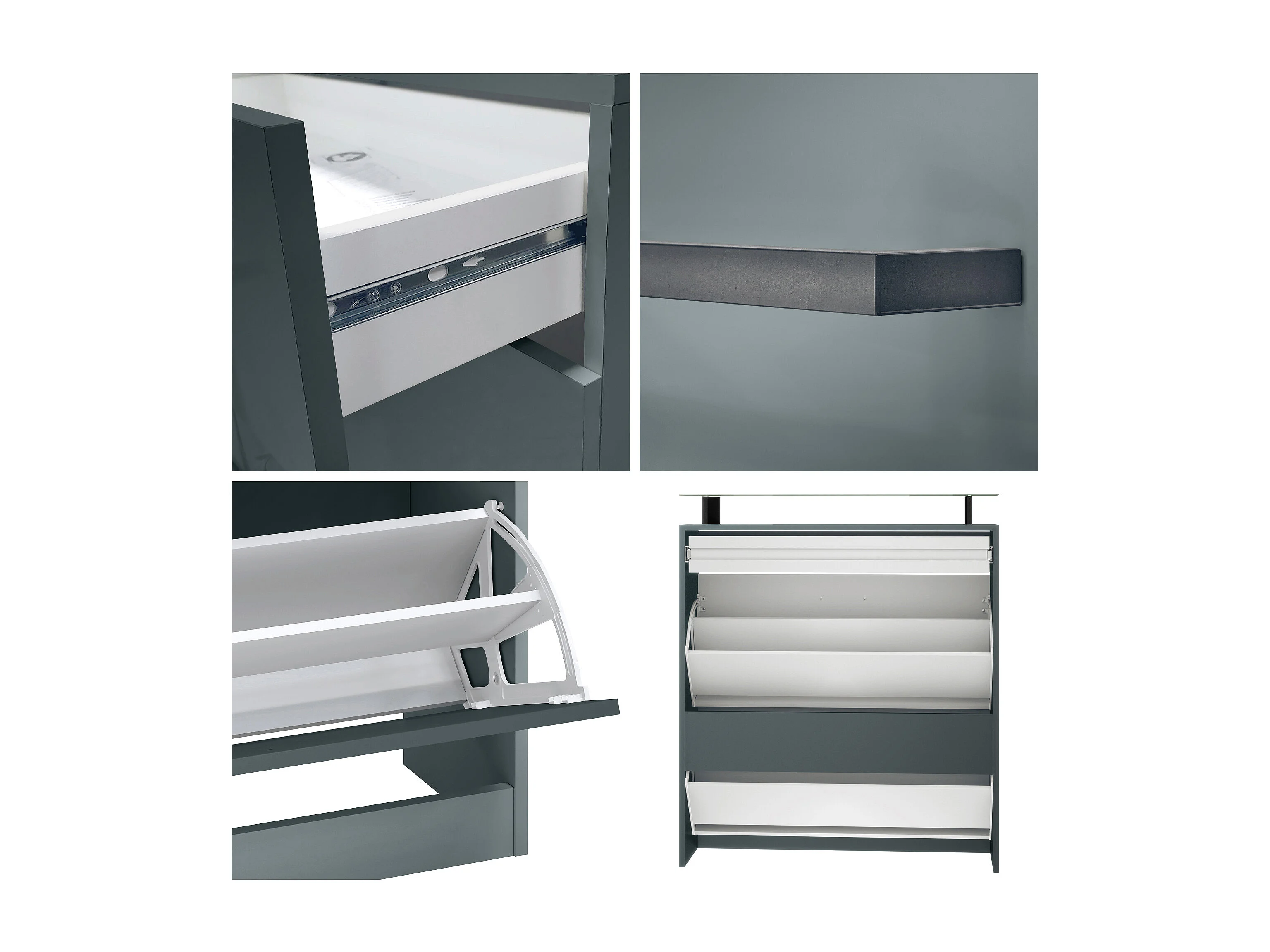 Meuble à chaussures Enigma, range-chaussures pour 16 paires avec 2 abattants, 1 tiroir et tablette en verre, Fjord vert (89 x 104 x 23 cm)