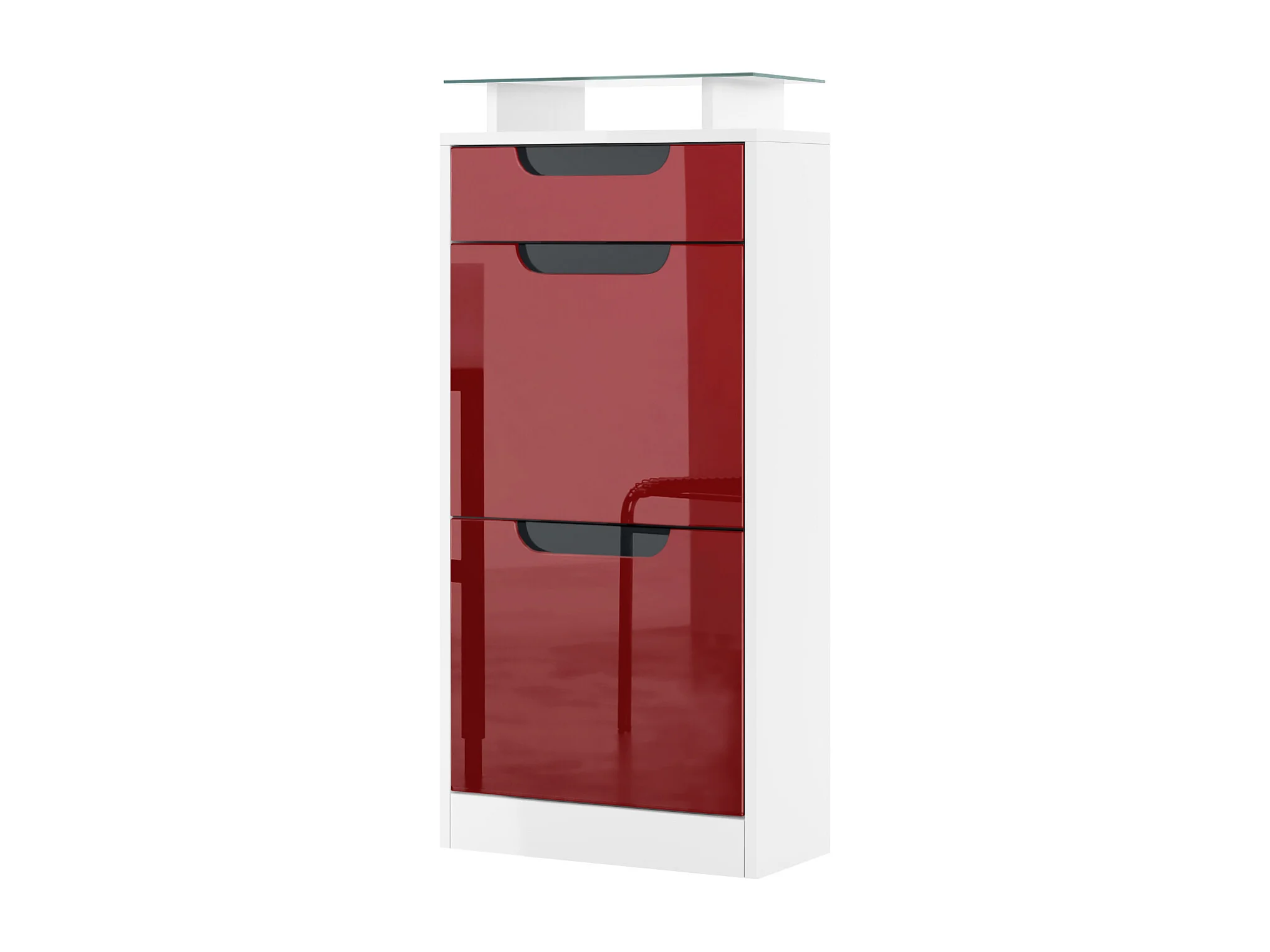 Meuble à chaussures Fiesta V2, Corps en Blanc mat / Façades en Bordeaux haute brillance avec un decor en Noir haute brillance