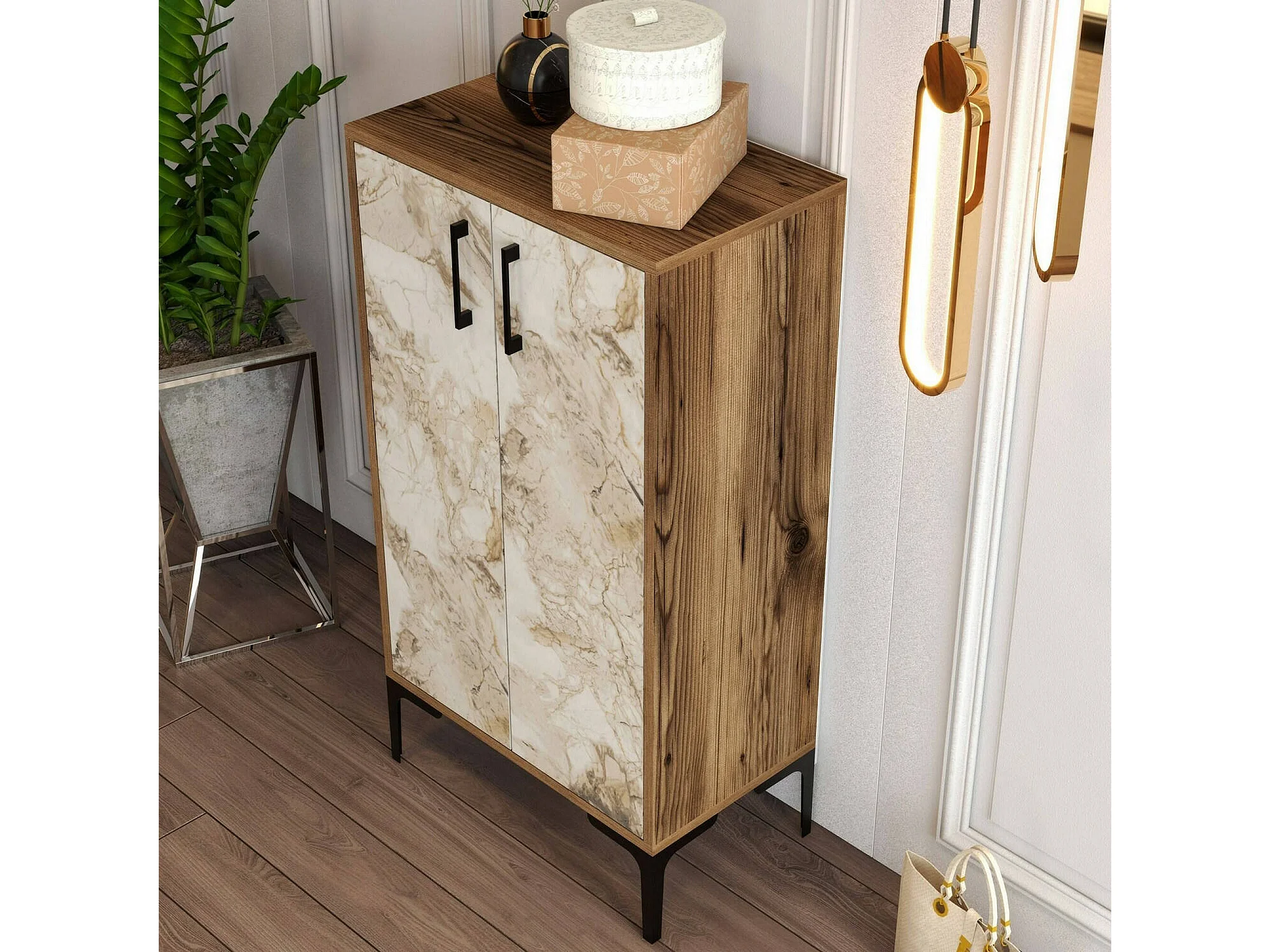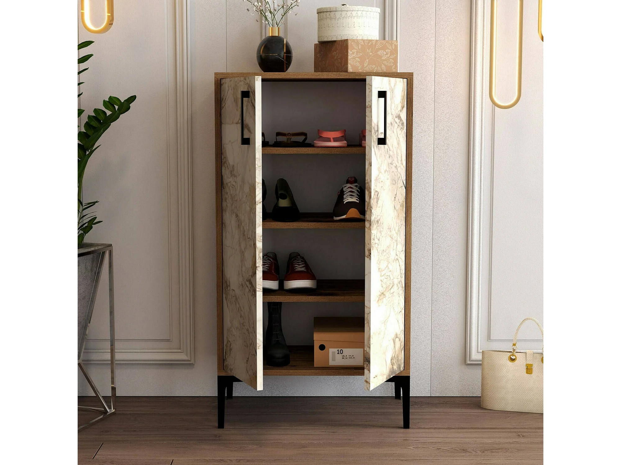 Meuble à chaussures Helios, Meuble à chaussures, Armoire d'entrée polyvalente, Rangement pour chaussures, 60x35h111 cm, Noyer et Blanc