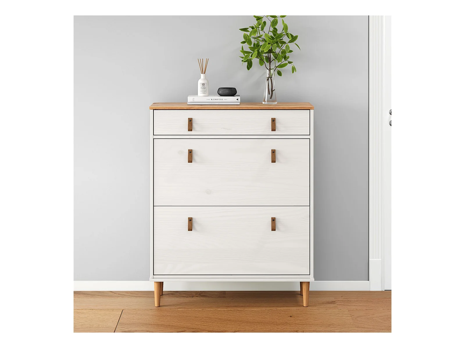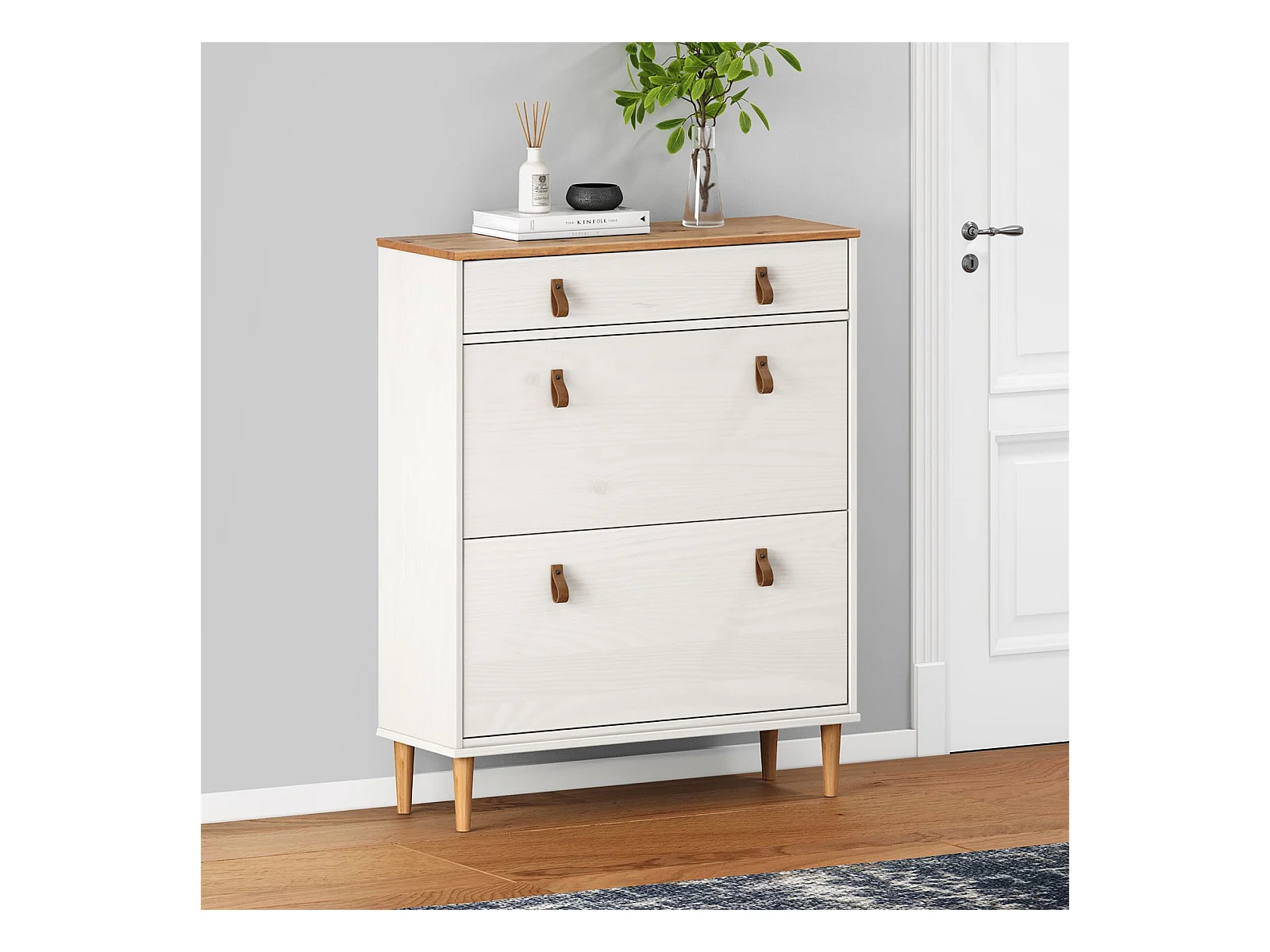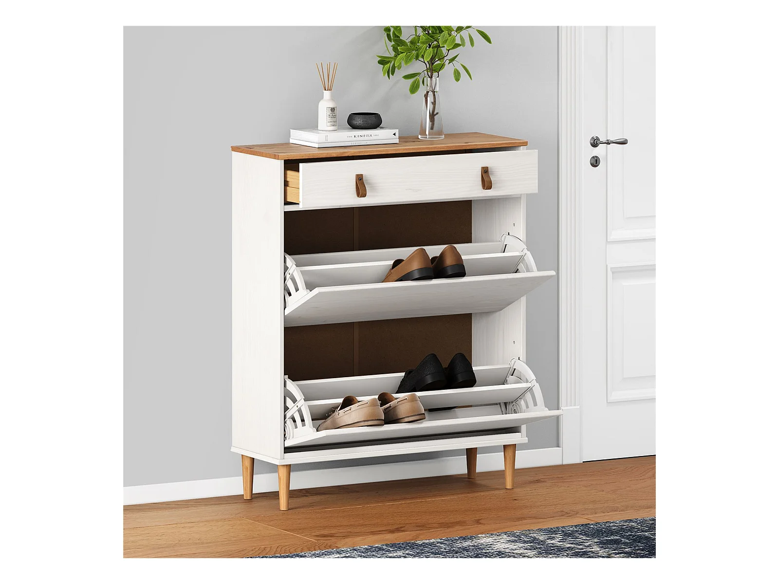 Meuble à chaussures MIKKA, étagère à chaussure bois avec 2 abattants et 1 tiroir de rangement en min massif coloris blanc/chêne