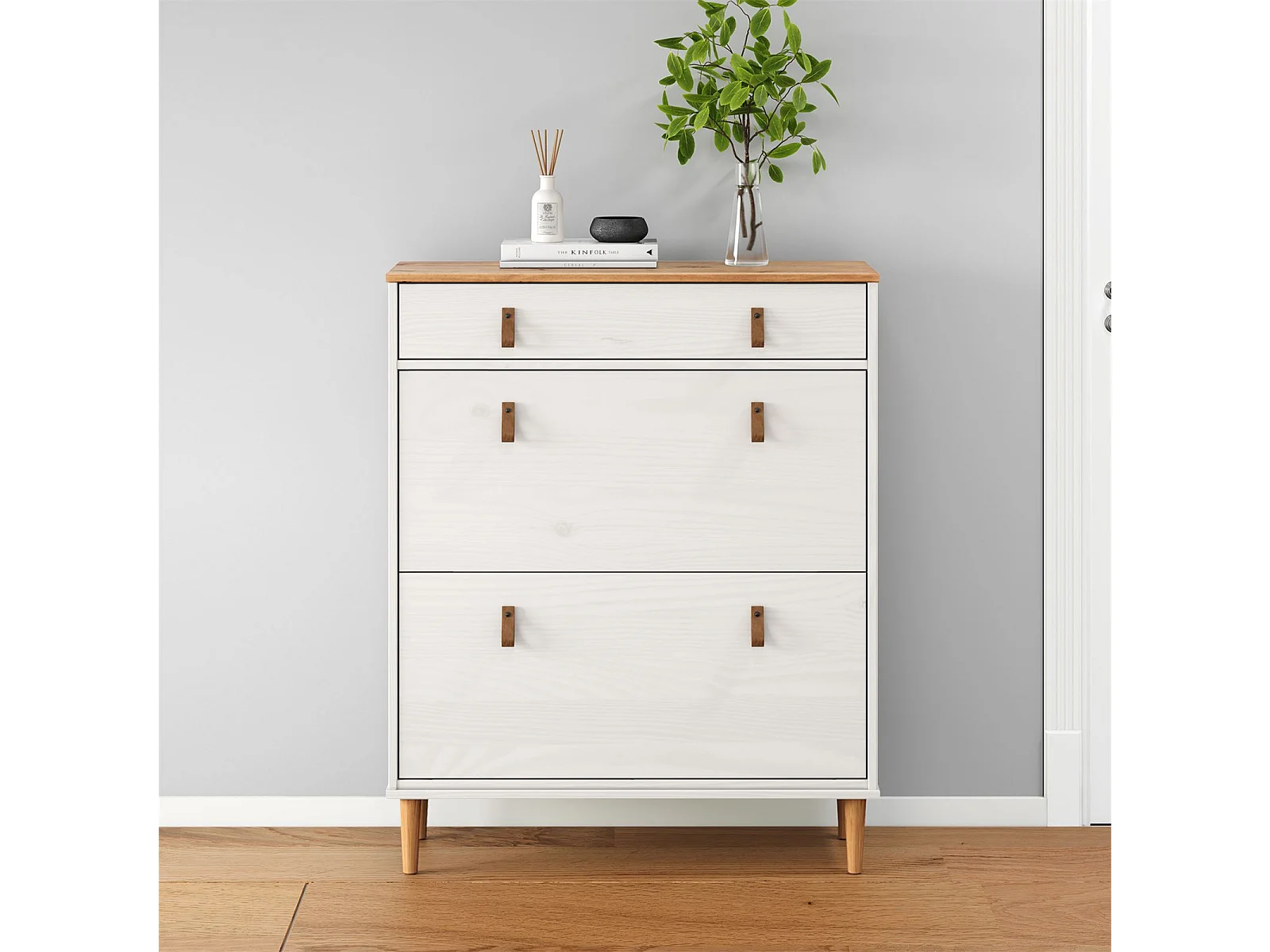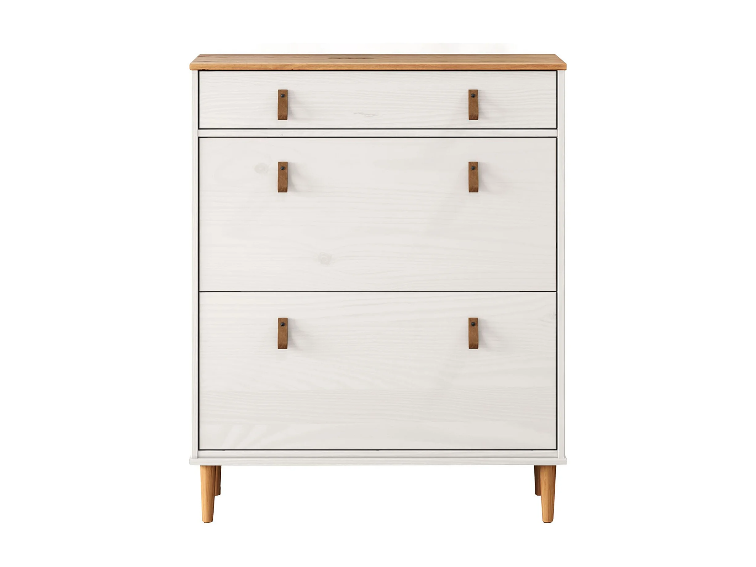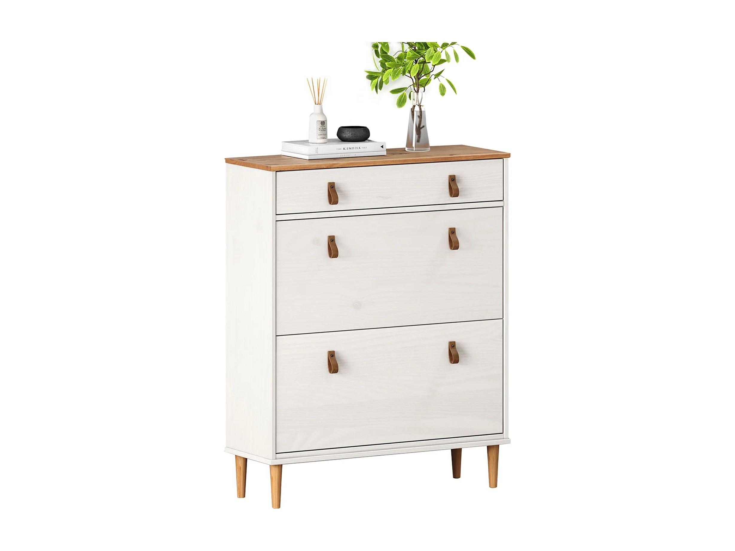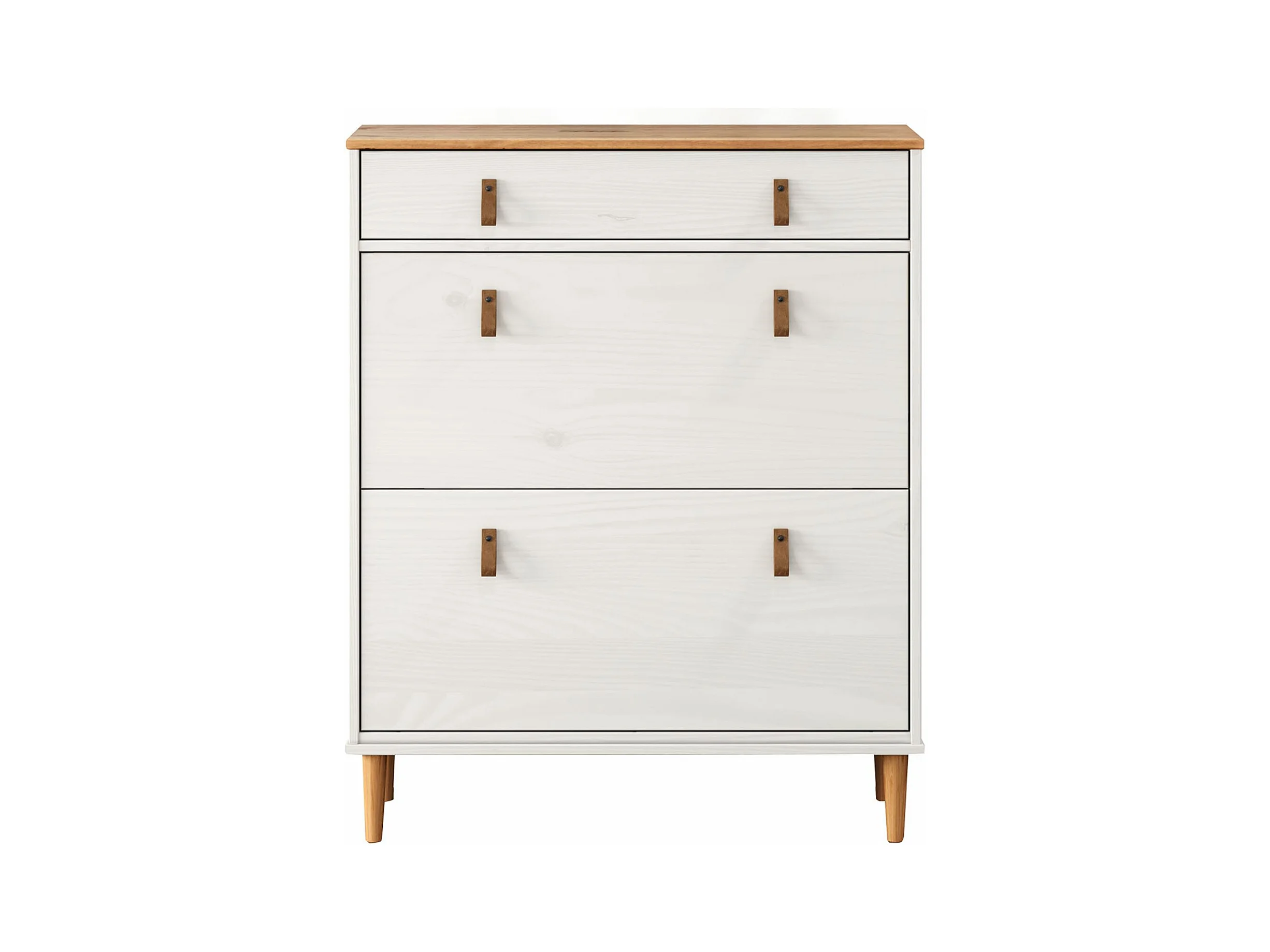 Meuble à chaussures MIKKA, étagère à chaussure bois avec 2 abattants et 1 tiroir de rangement en min massif coloris blanc/chêne