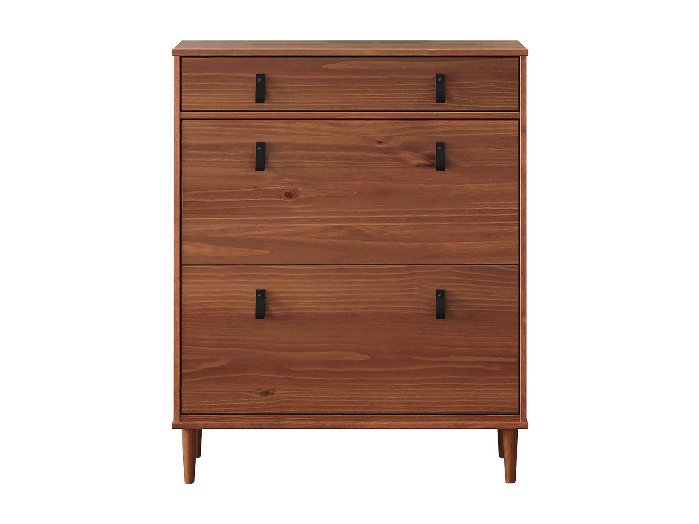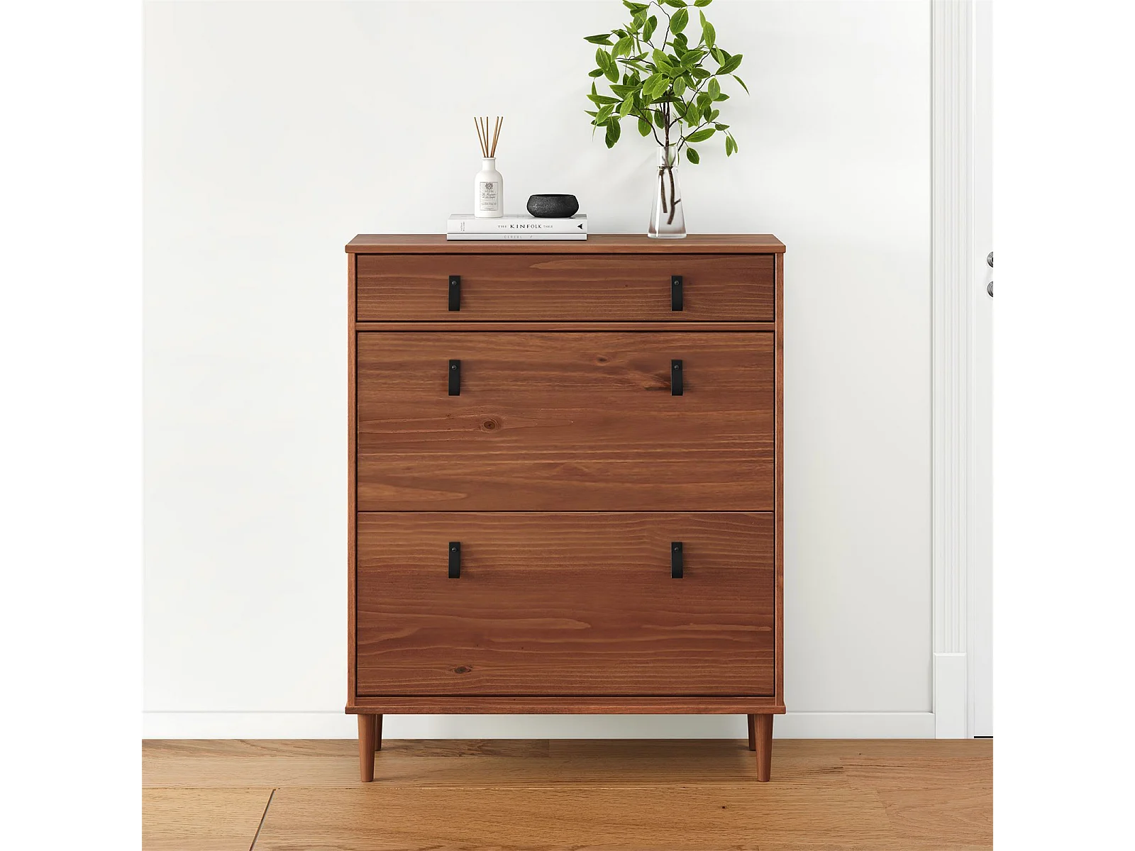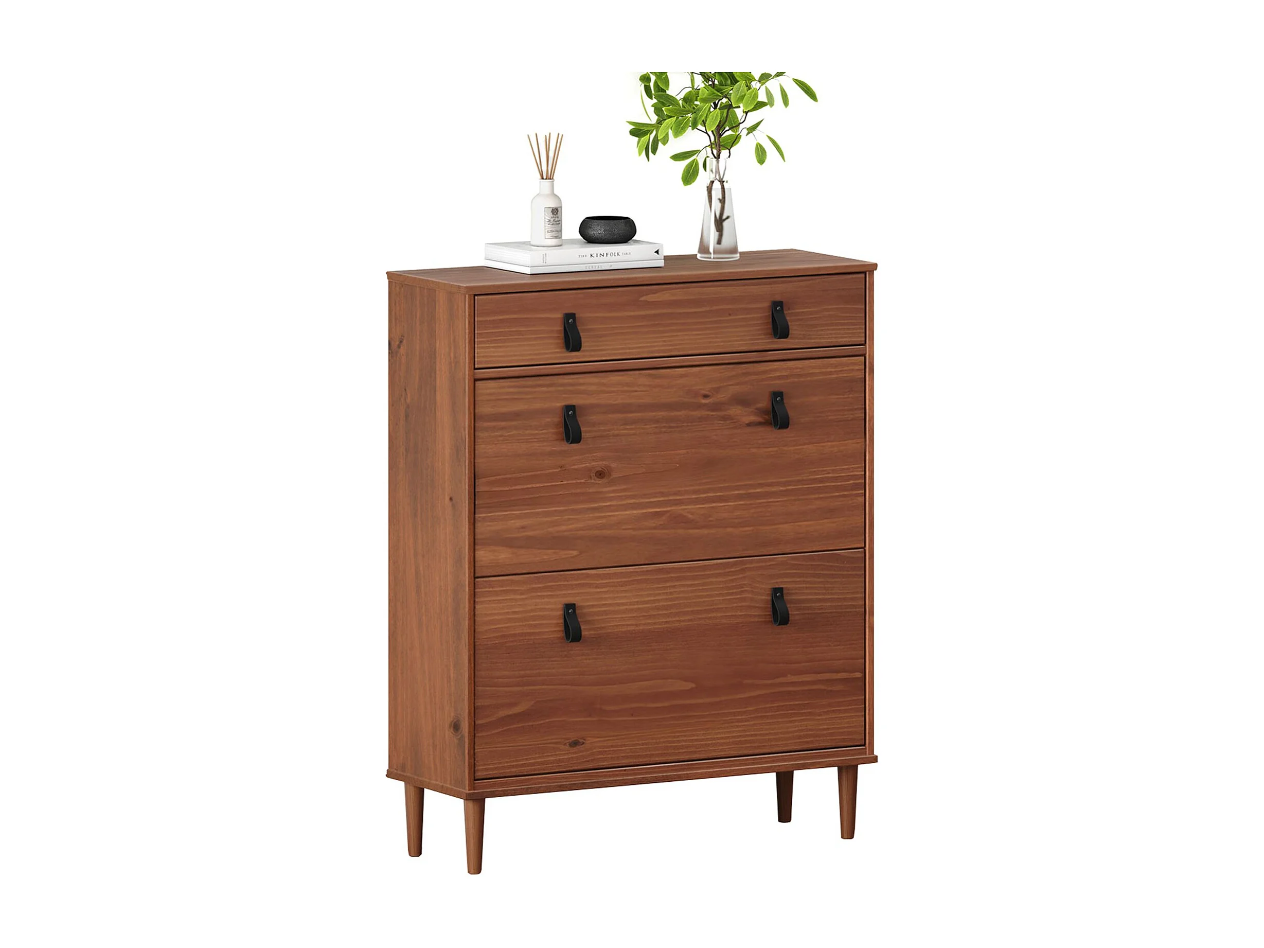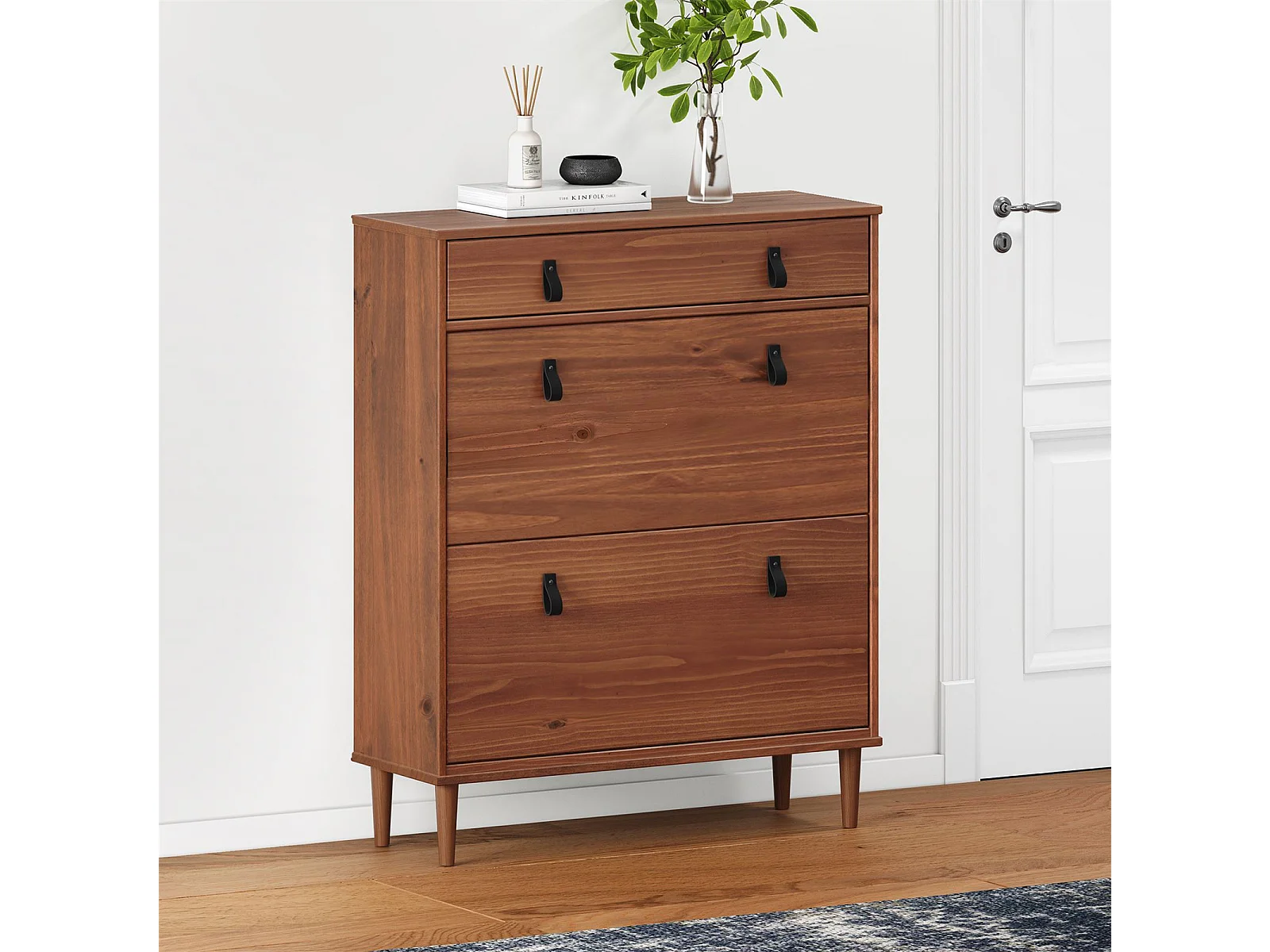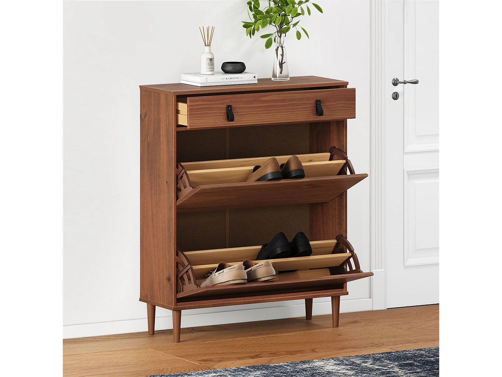 Meuble à chaussures MIKKA, étagère à chaussure bois avec 2 abattants et 1 tiroir de rangement en pin massif brun foncé