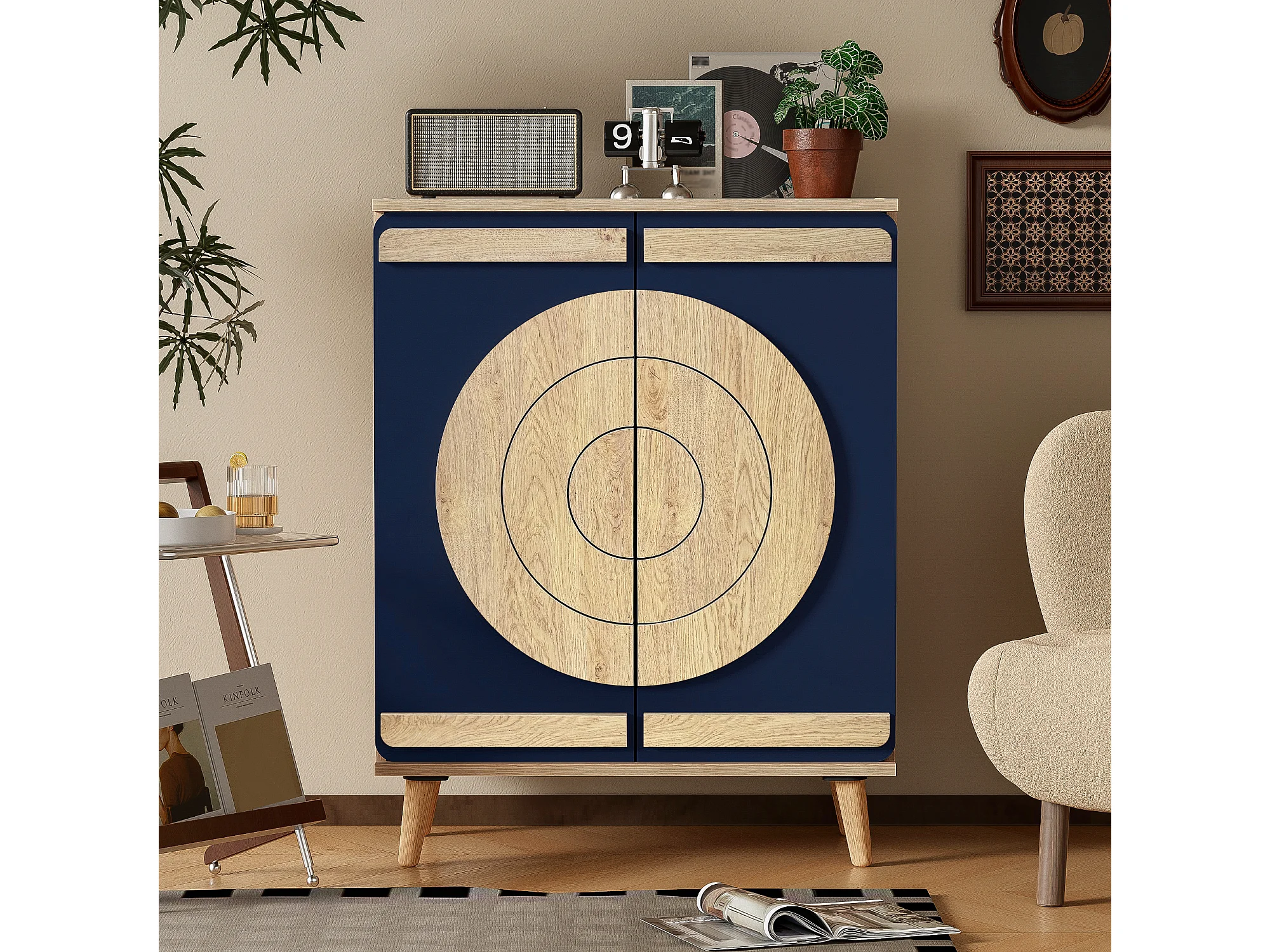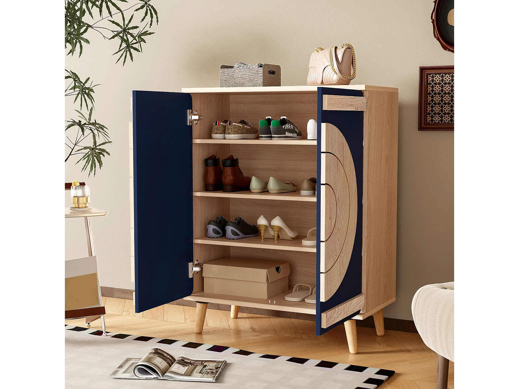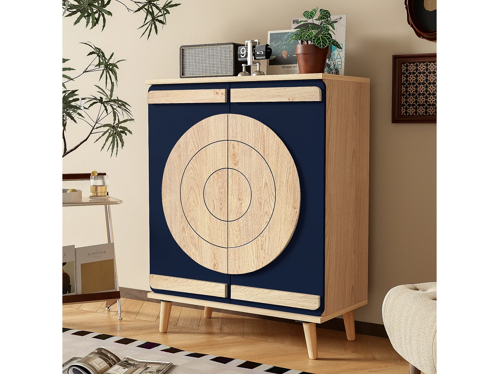 Meuble à chaussures moderne avec portes rondes et géométriques - 76 x 37 x 98.5 cm - aggloméré - naturel
