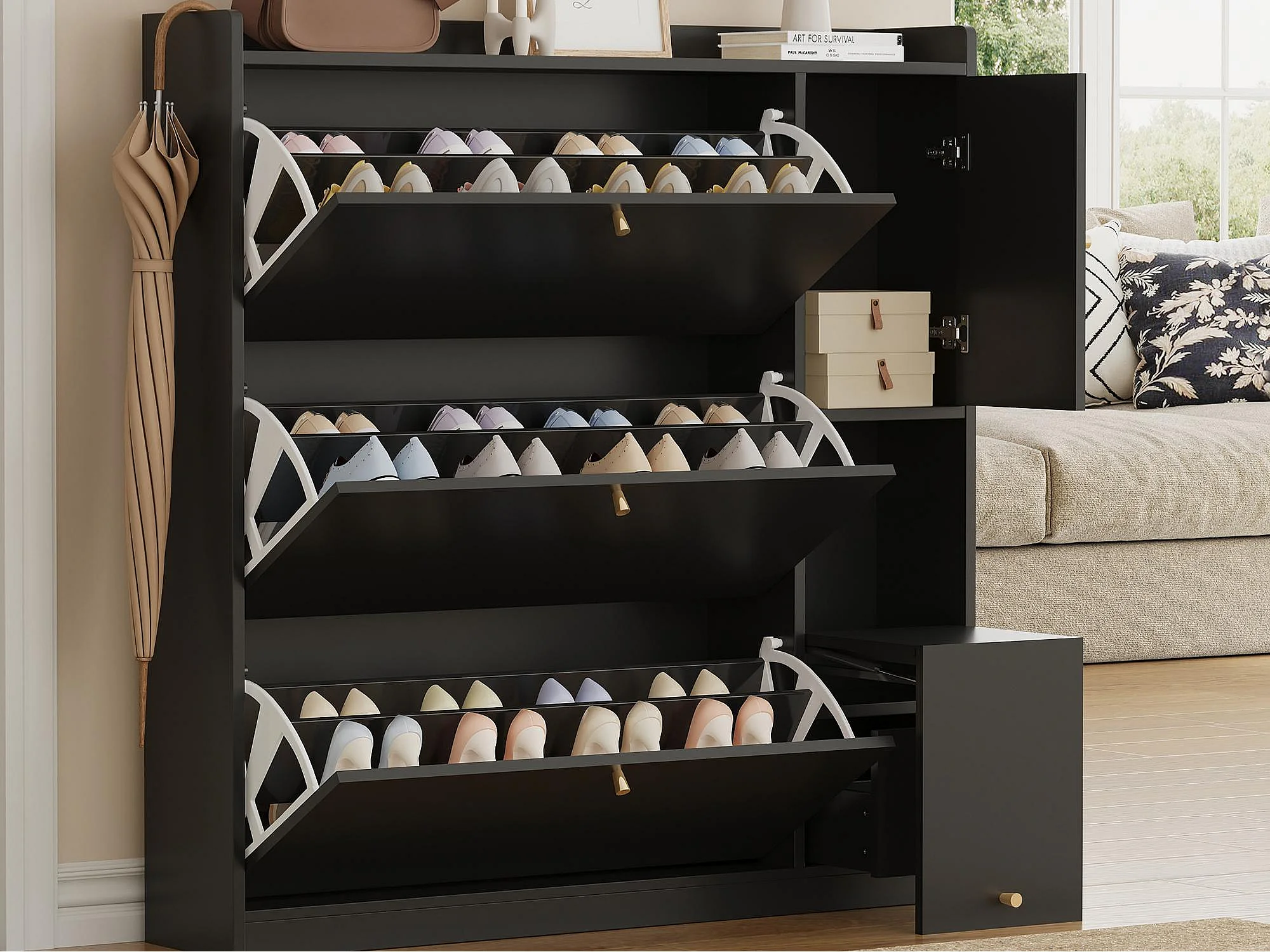 Meuble à chaussures multifonction 119x24x122cm - avec 3 portes rabattables - avec banc rabattable - avec une porte - noir