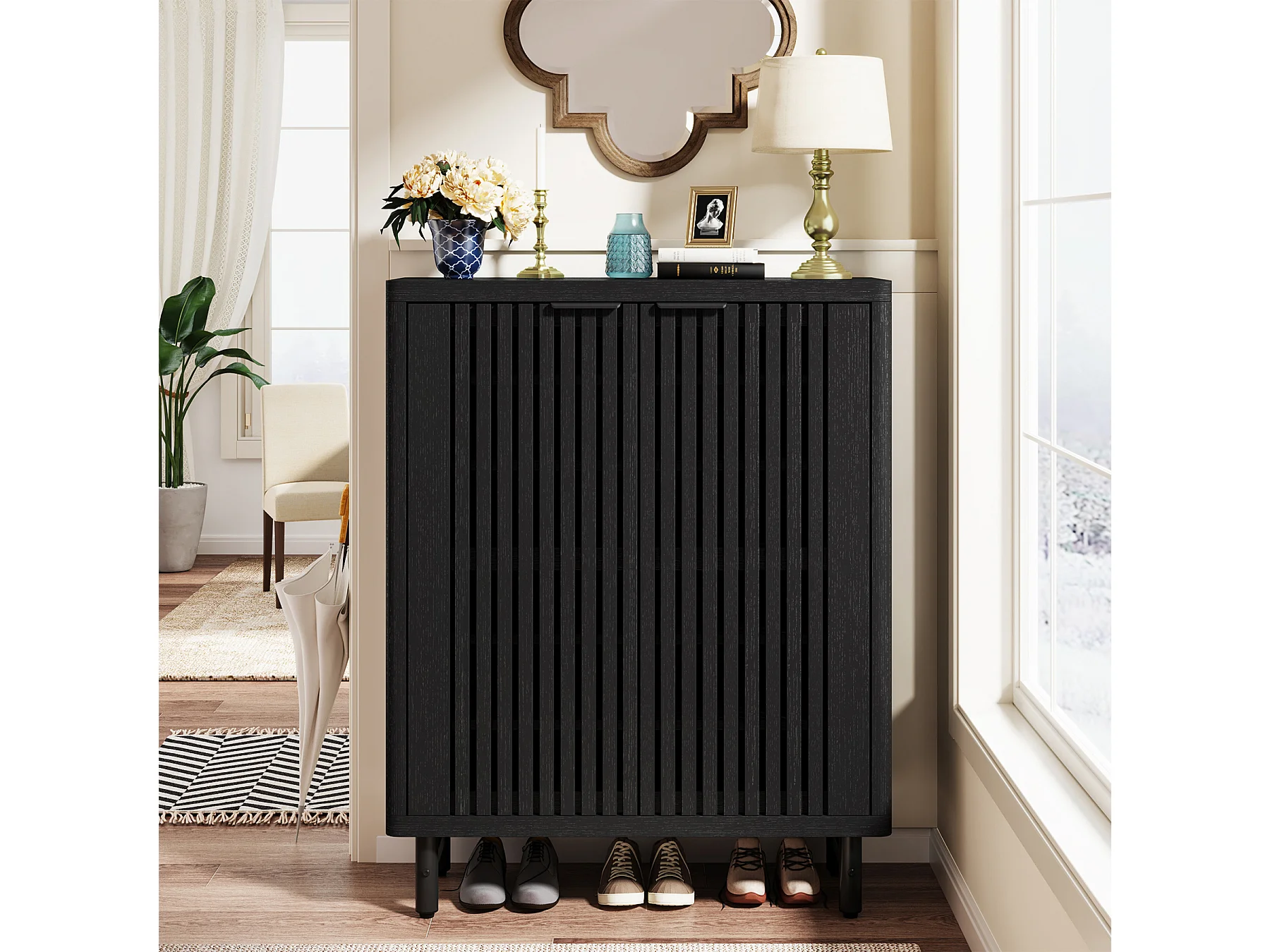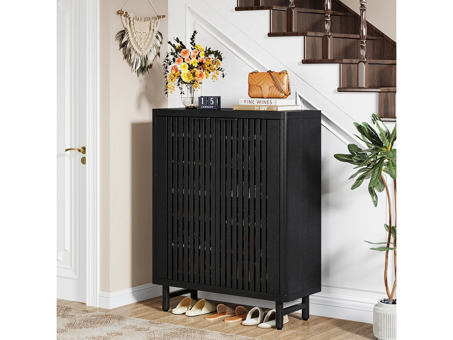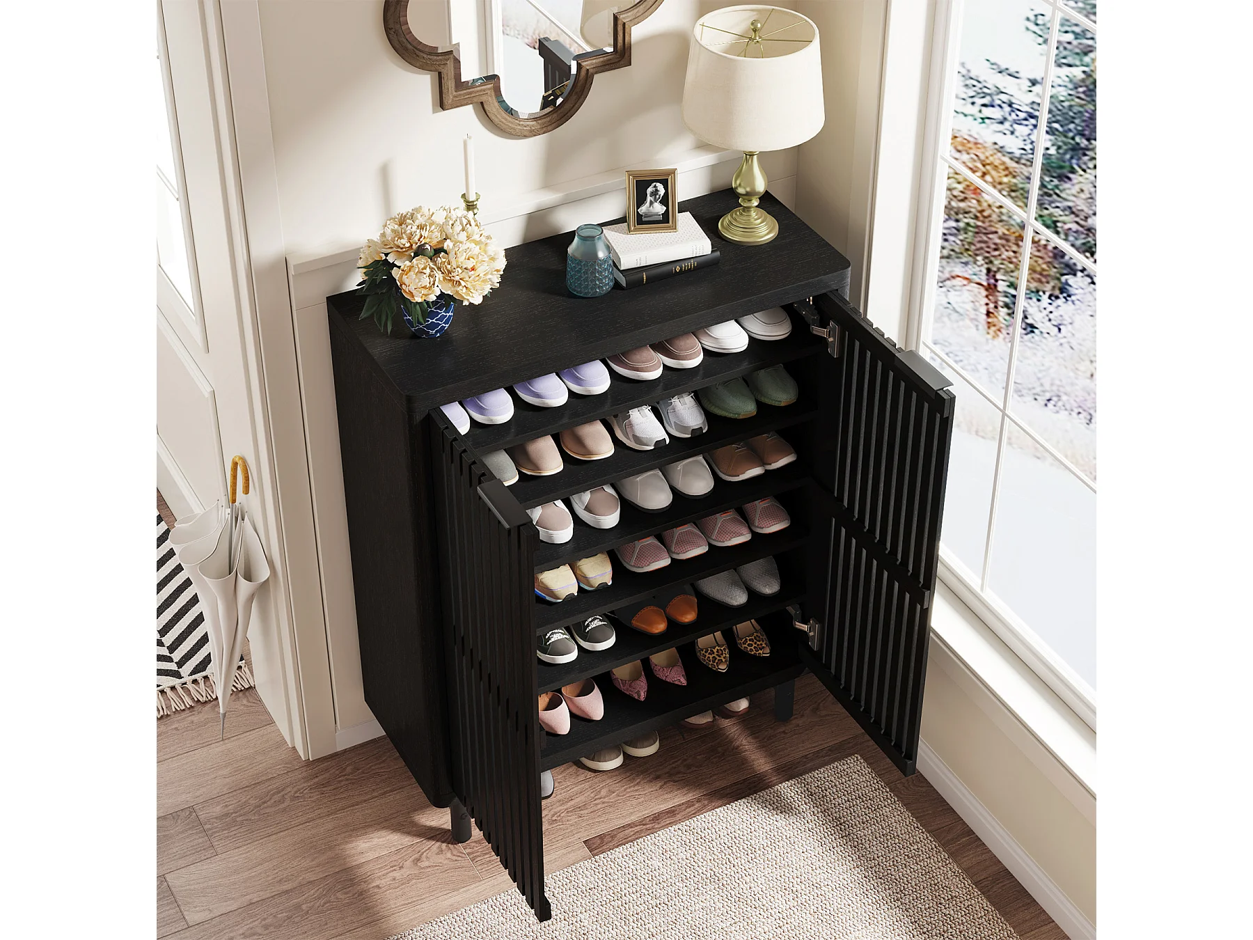 Meuble à chaussures noir à 6 niveaux avec portes à volets, étagère à chaussures en bois avec étagères réglables