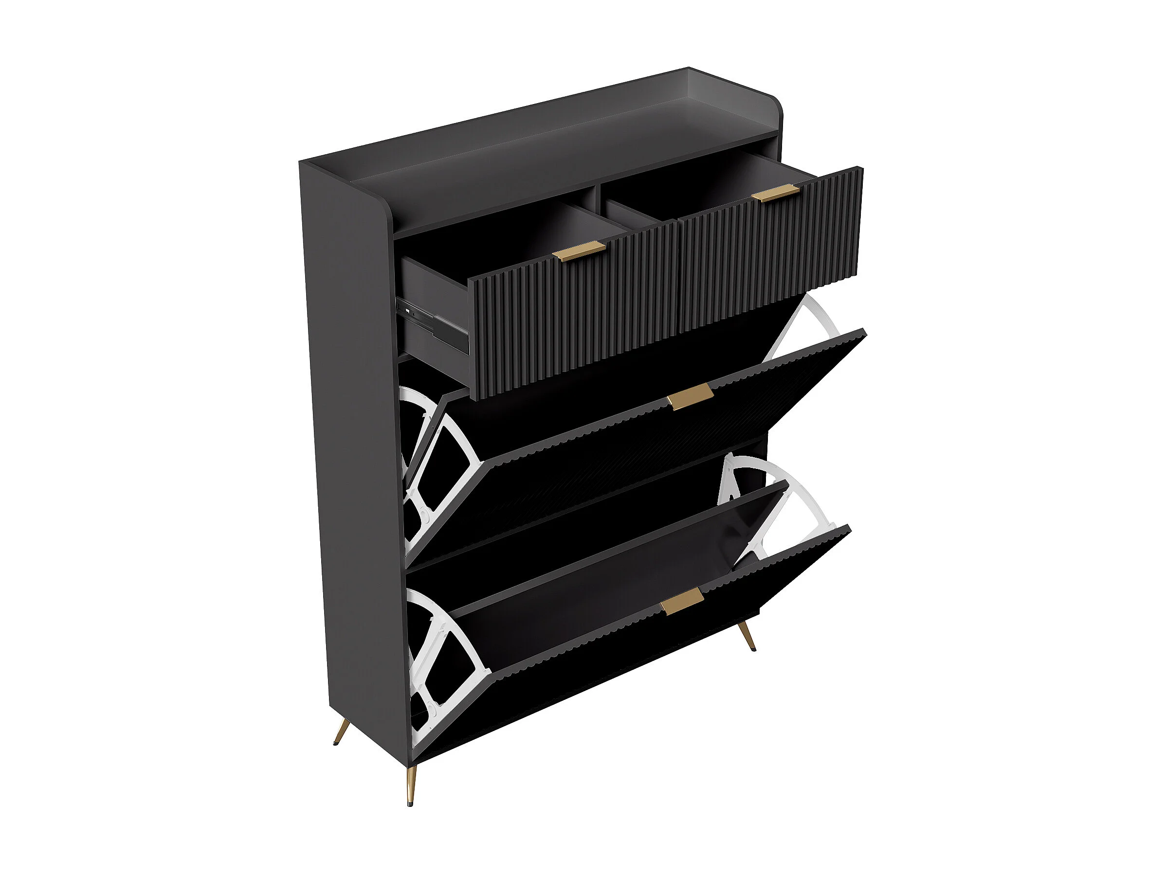 Meuble à chaussures noir avec 2 tiroirs et 2 abattants, design moderne, rangement multifonction, bois & métal, facile à assembler