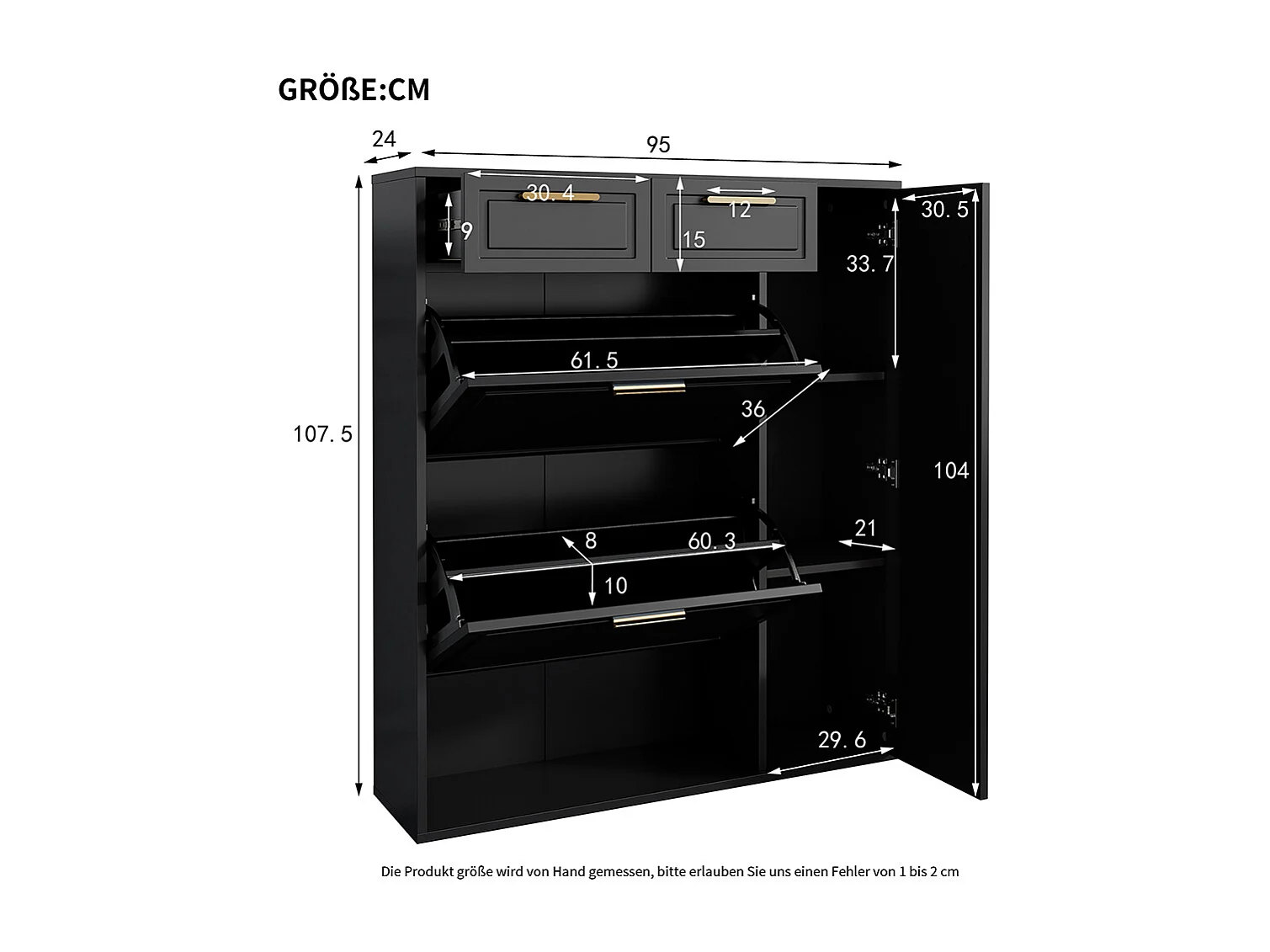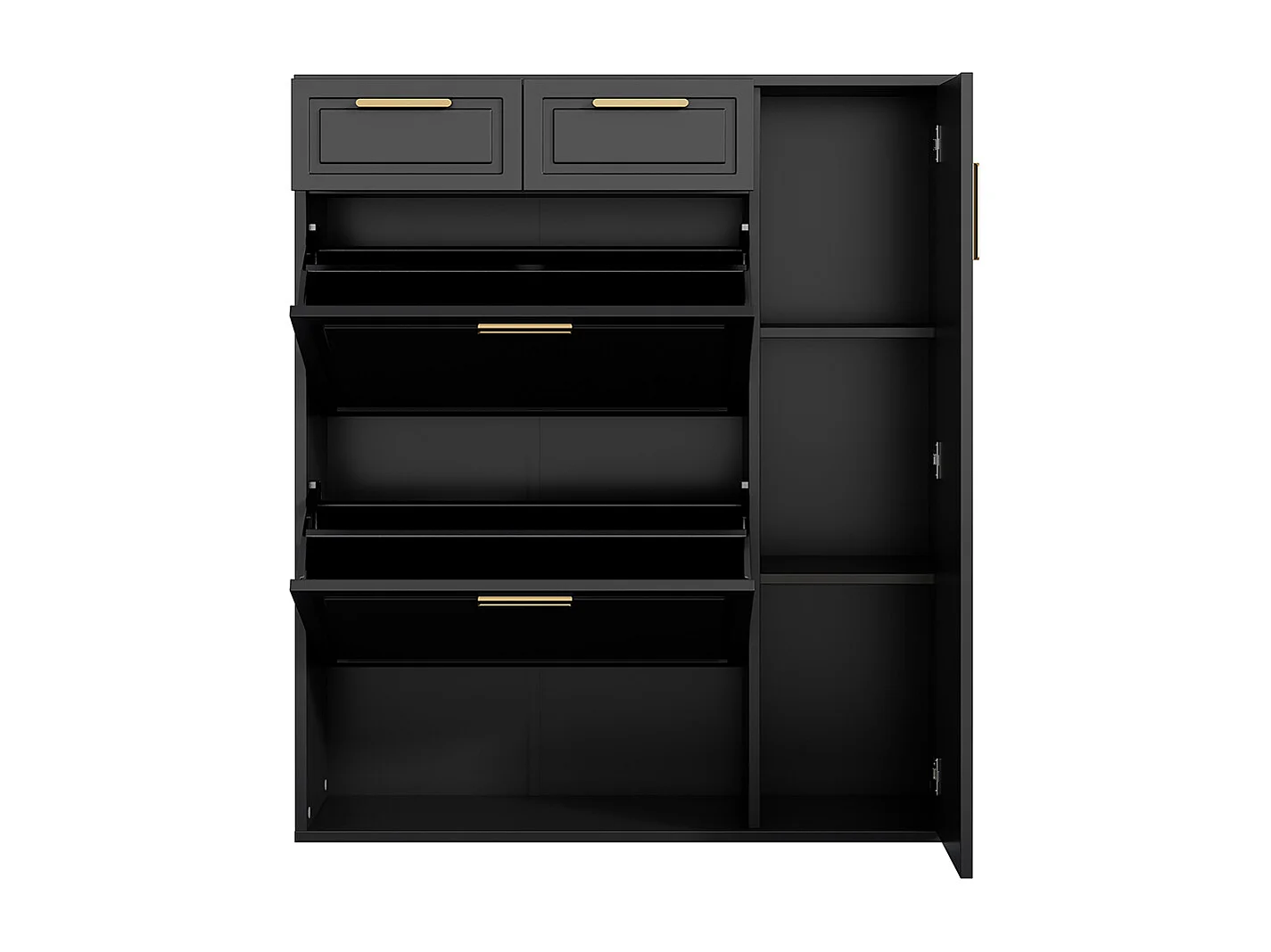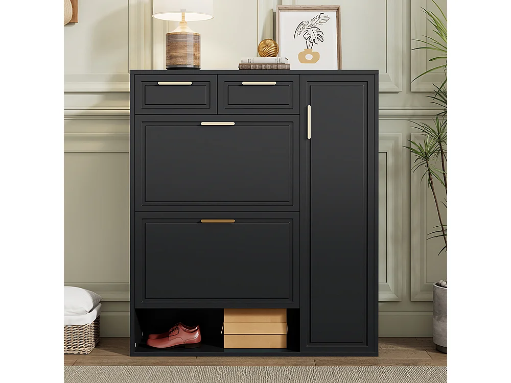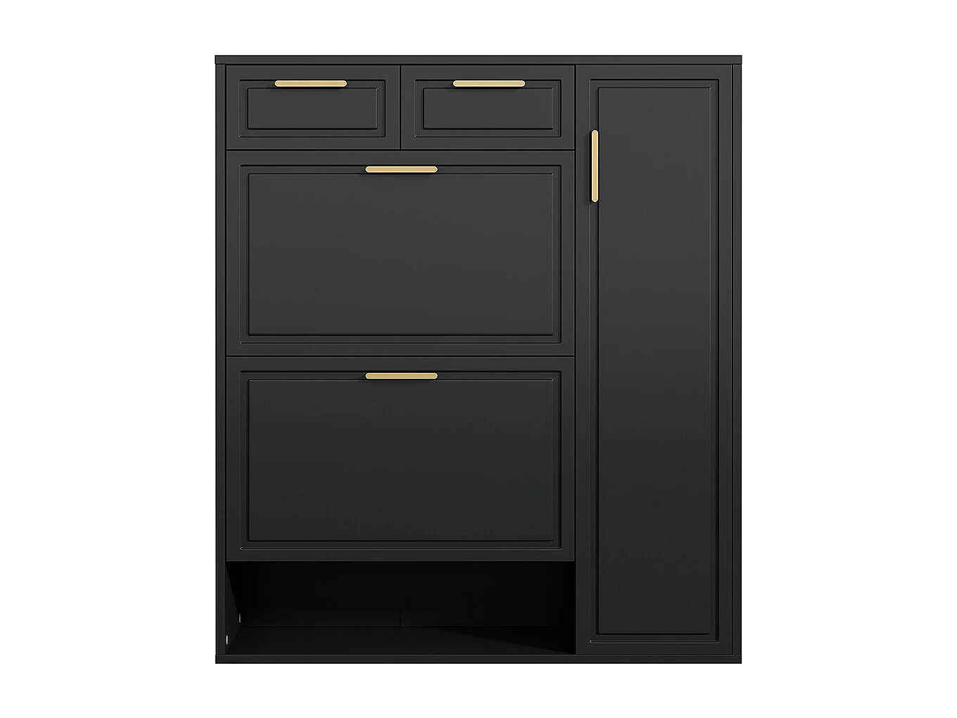 Meuble à chaussures noir tiroirs portes moderne étagères réglables poignées dorées rabattable