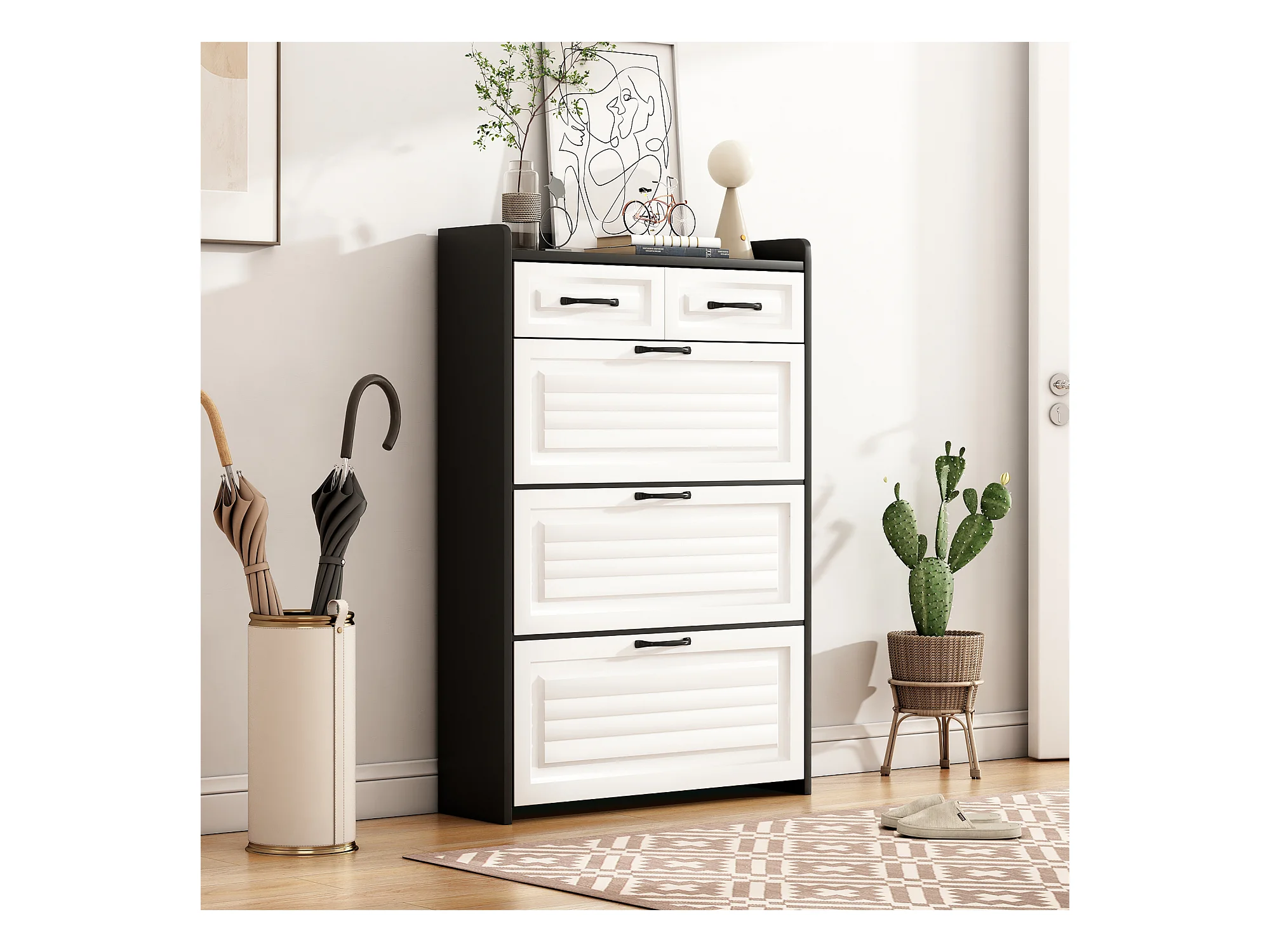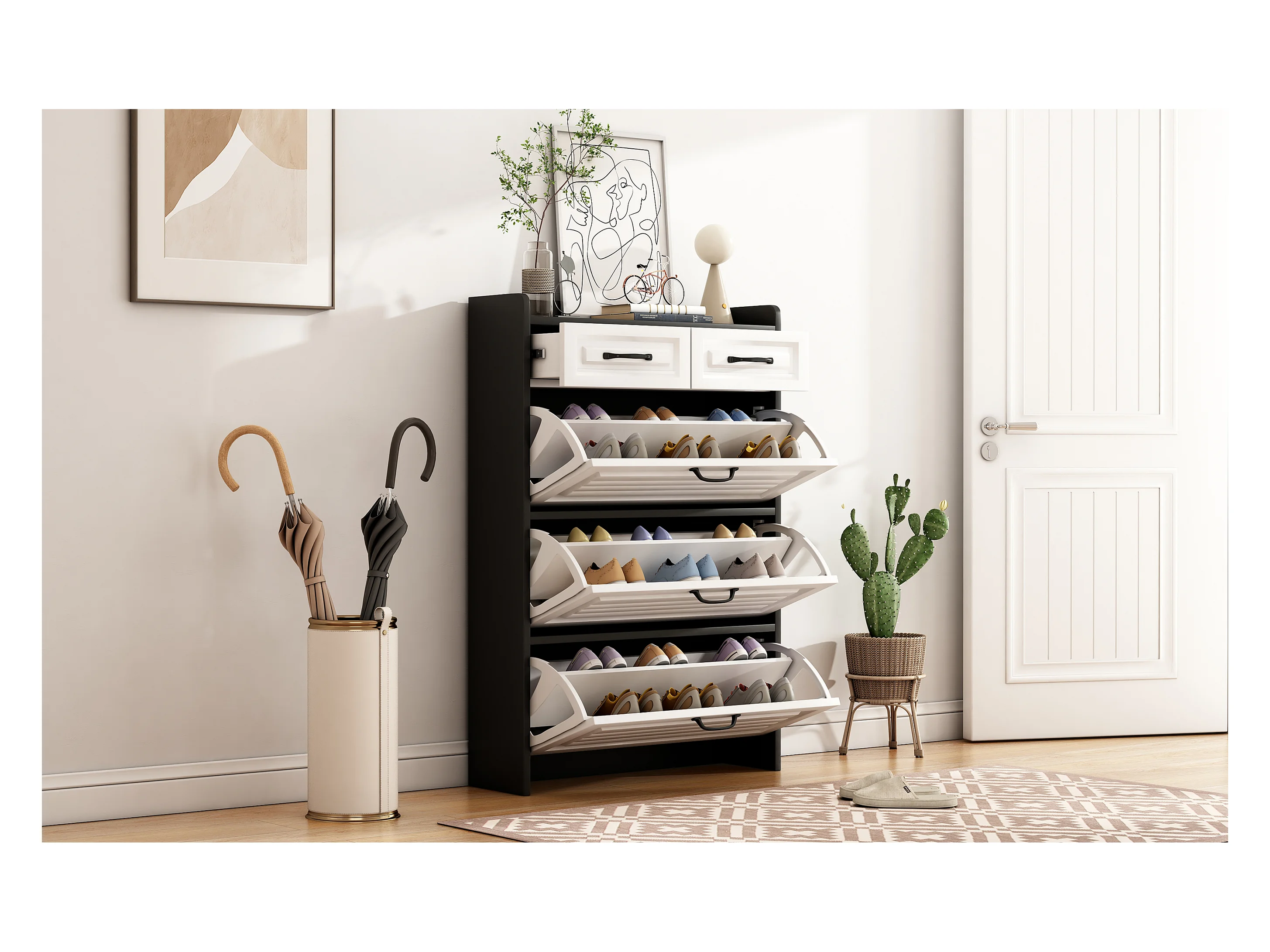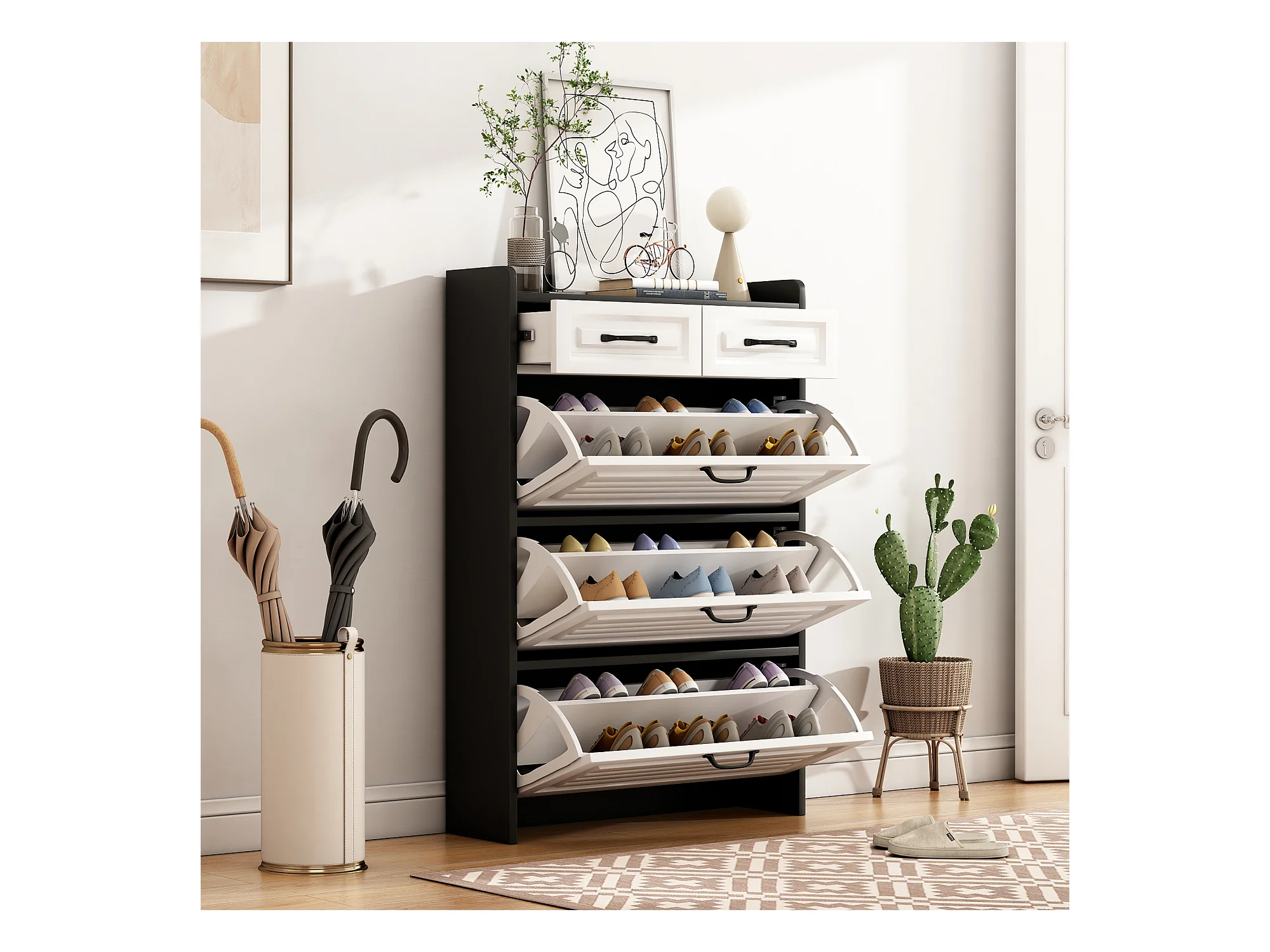 Meuble à chaussures rotatif - 80 x 23.5 x 131 cm - avec 3 abattants + 2 tiroirs - aggloméré - blanc + noir