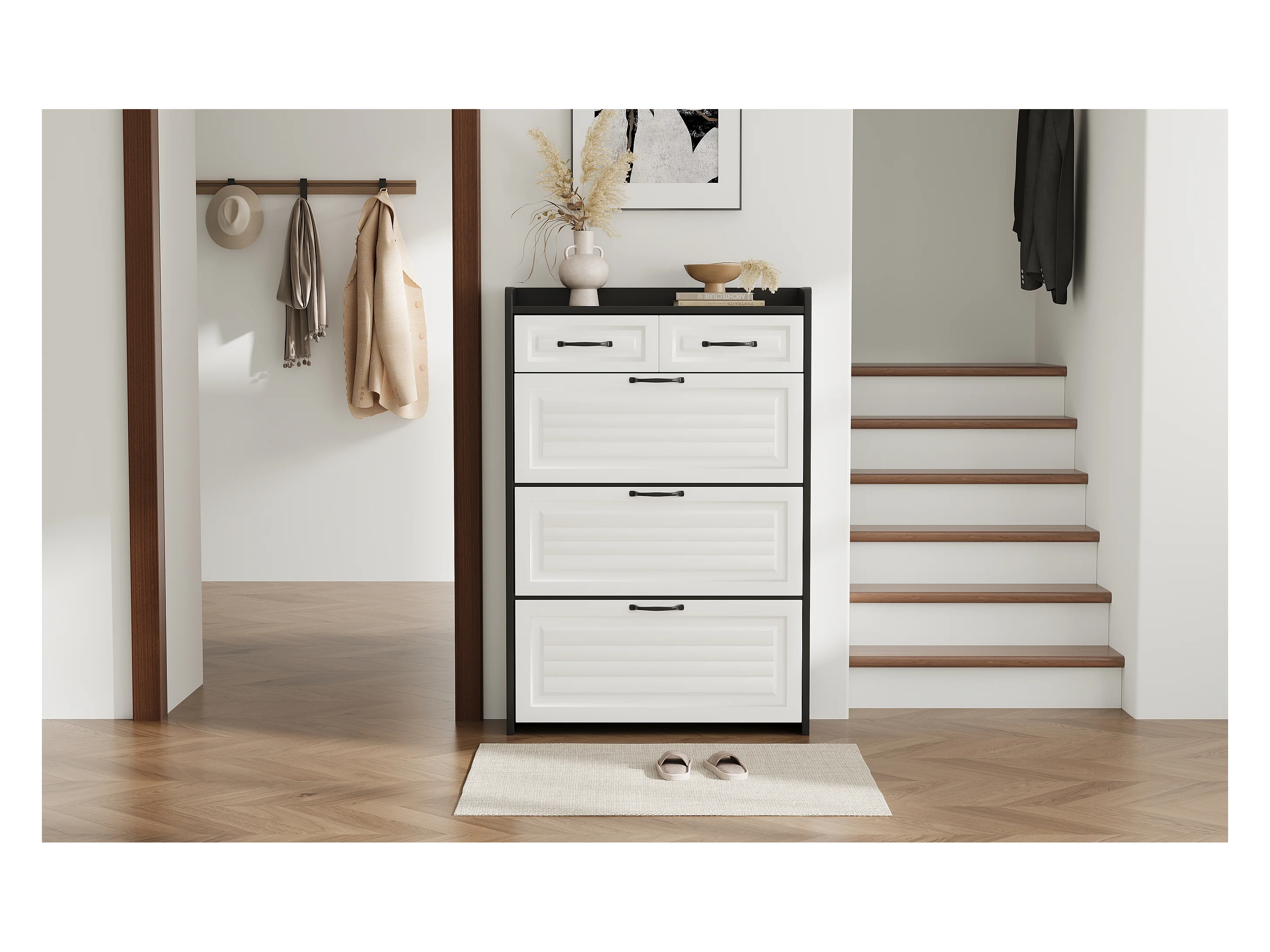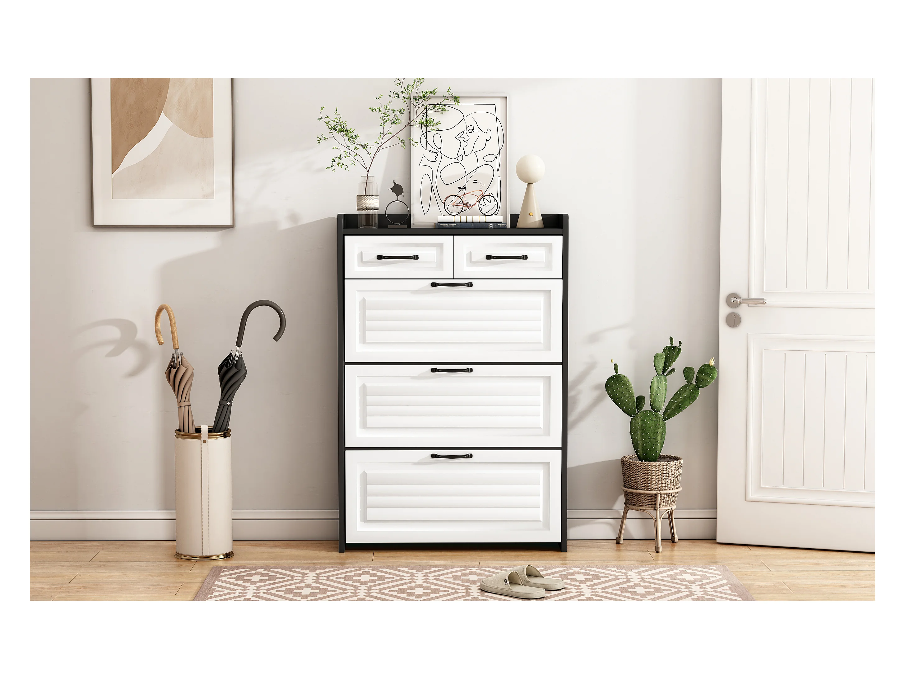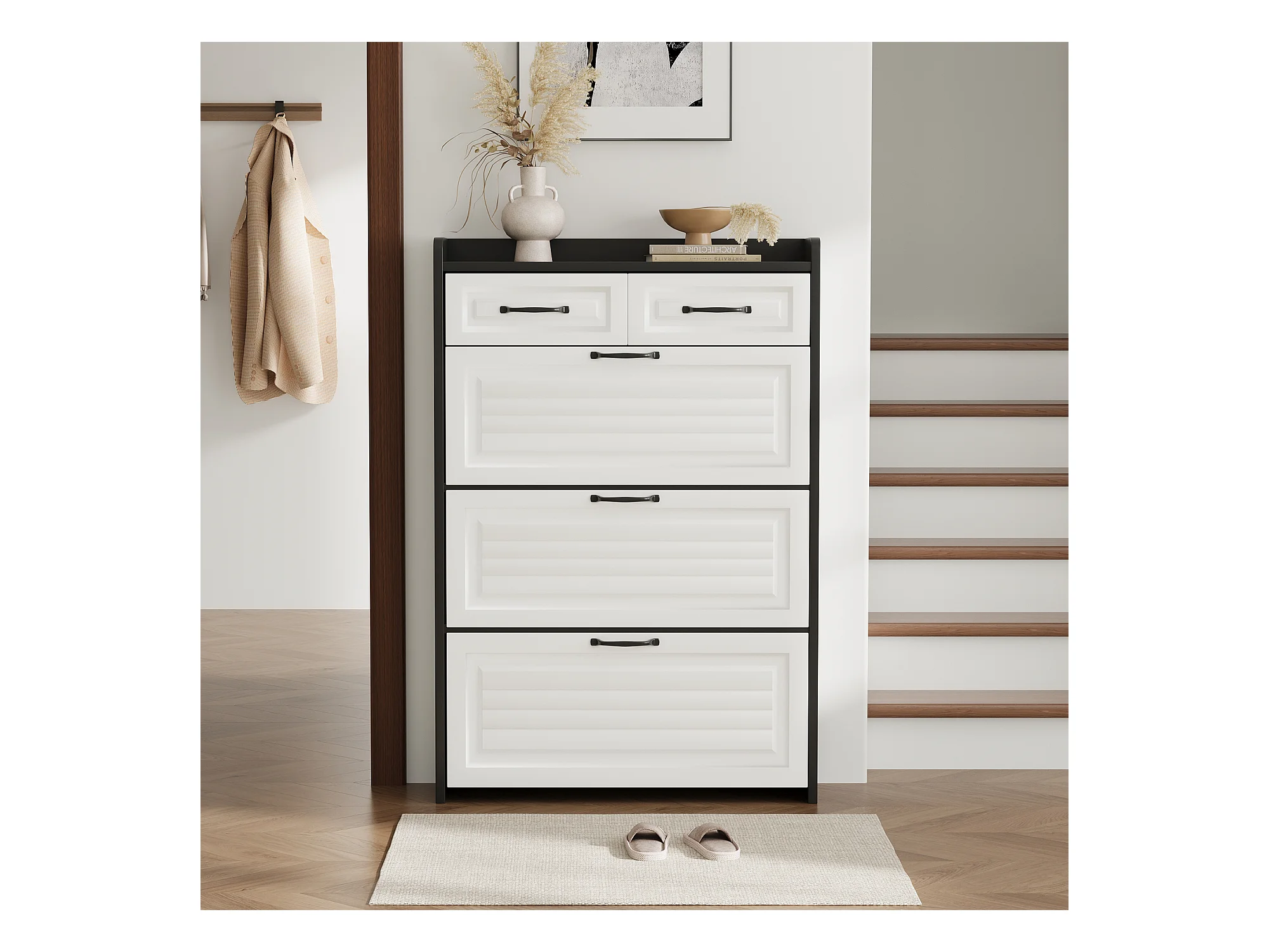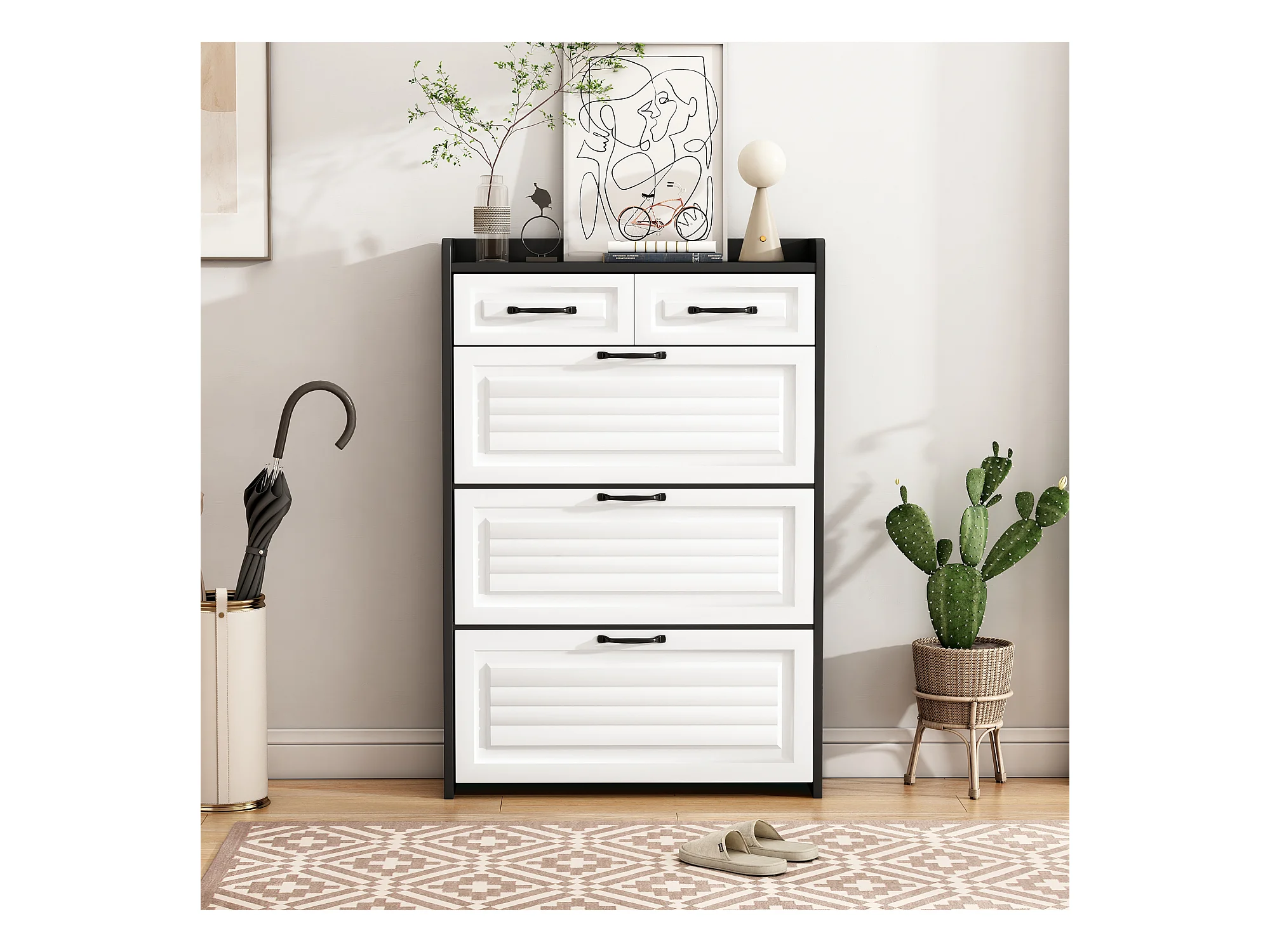 Meuble à chaussures rotatif - 80 x 23.5 x 131 cm - avec 3 abattants + 2 tiroirs - aggloméré - blanc + noir