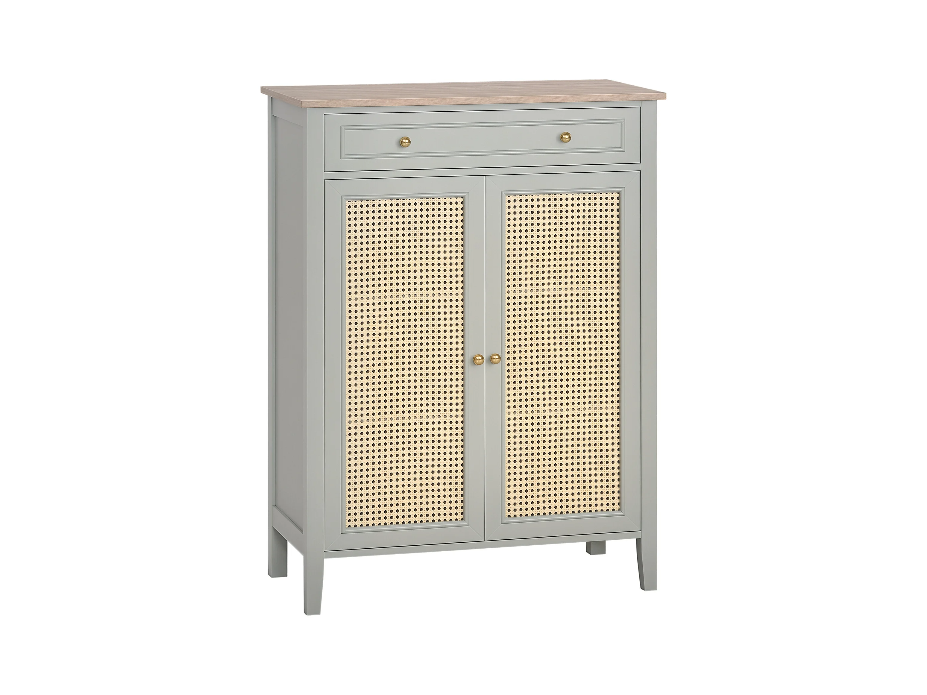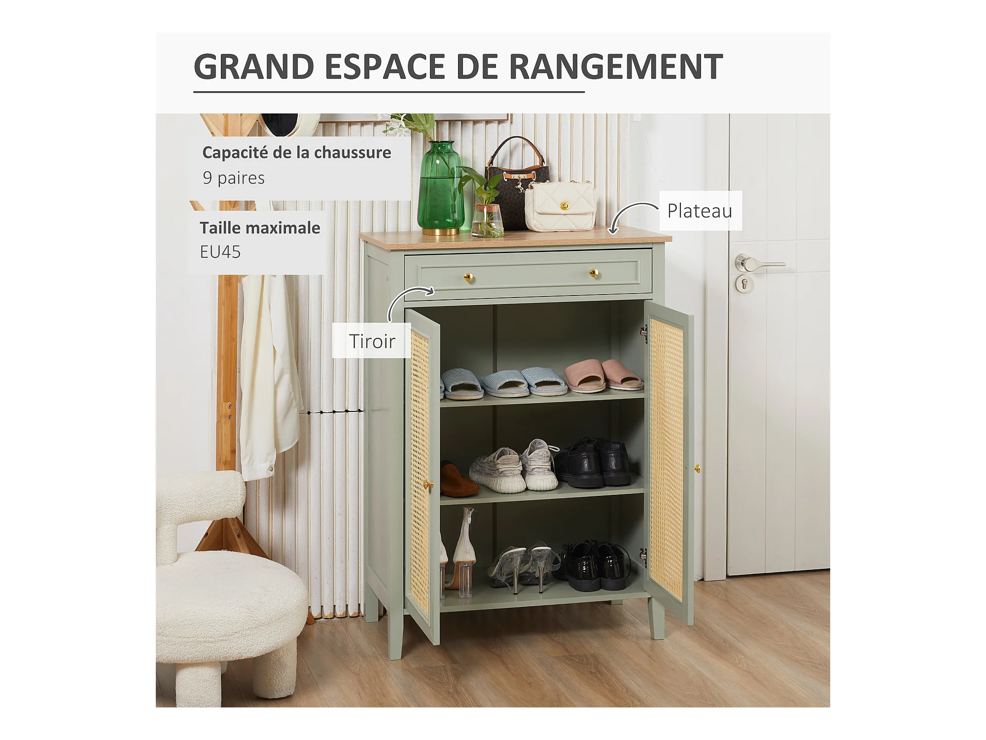 Meuble à chaussures style bohème chic - 2 portes 2 étagères réglables tiroir - MDF vert d'eau aspect chêne clair rotin