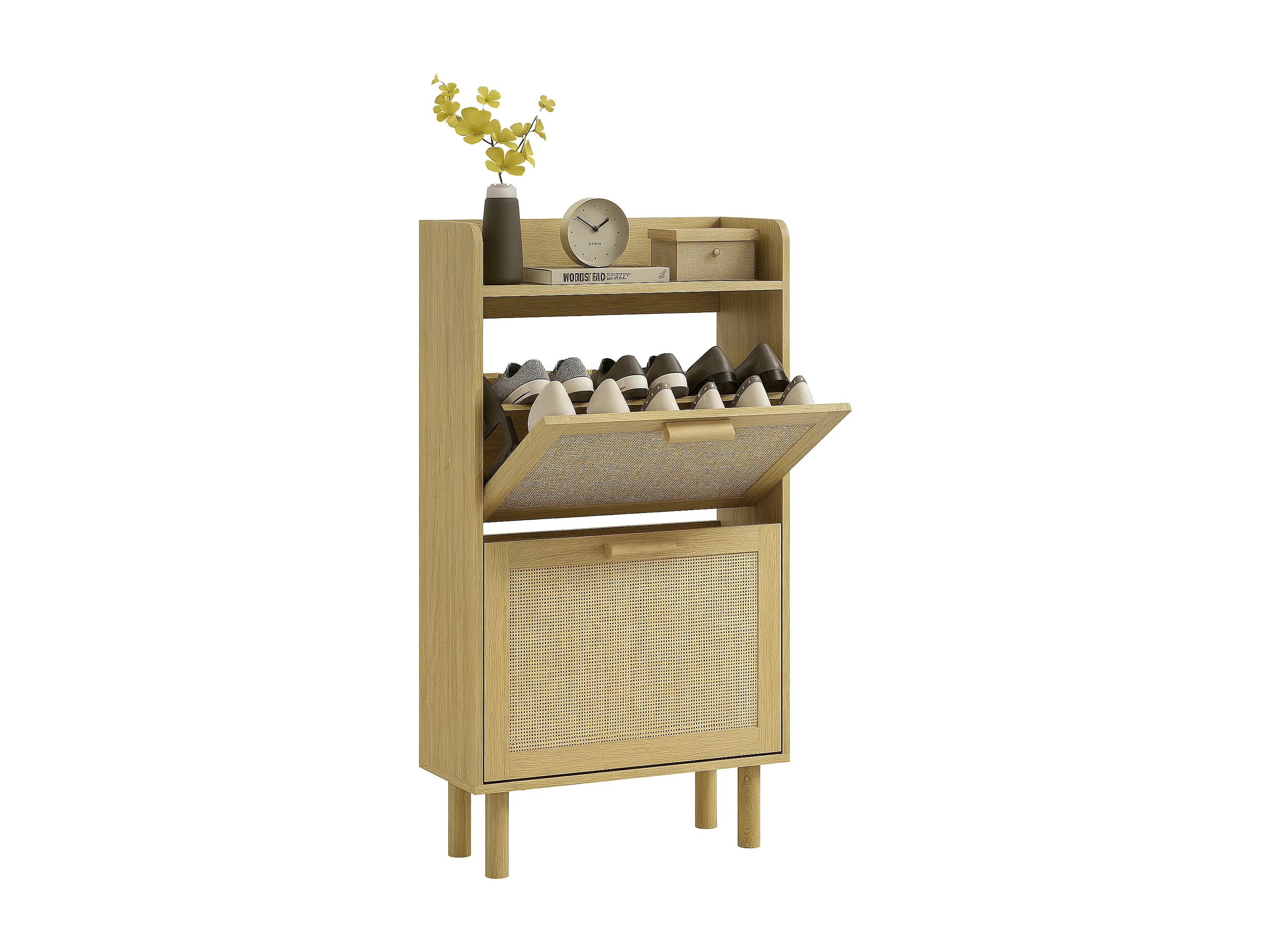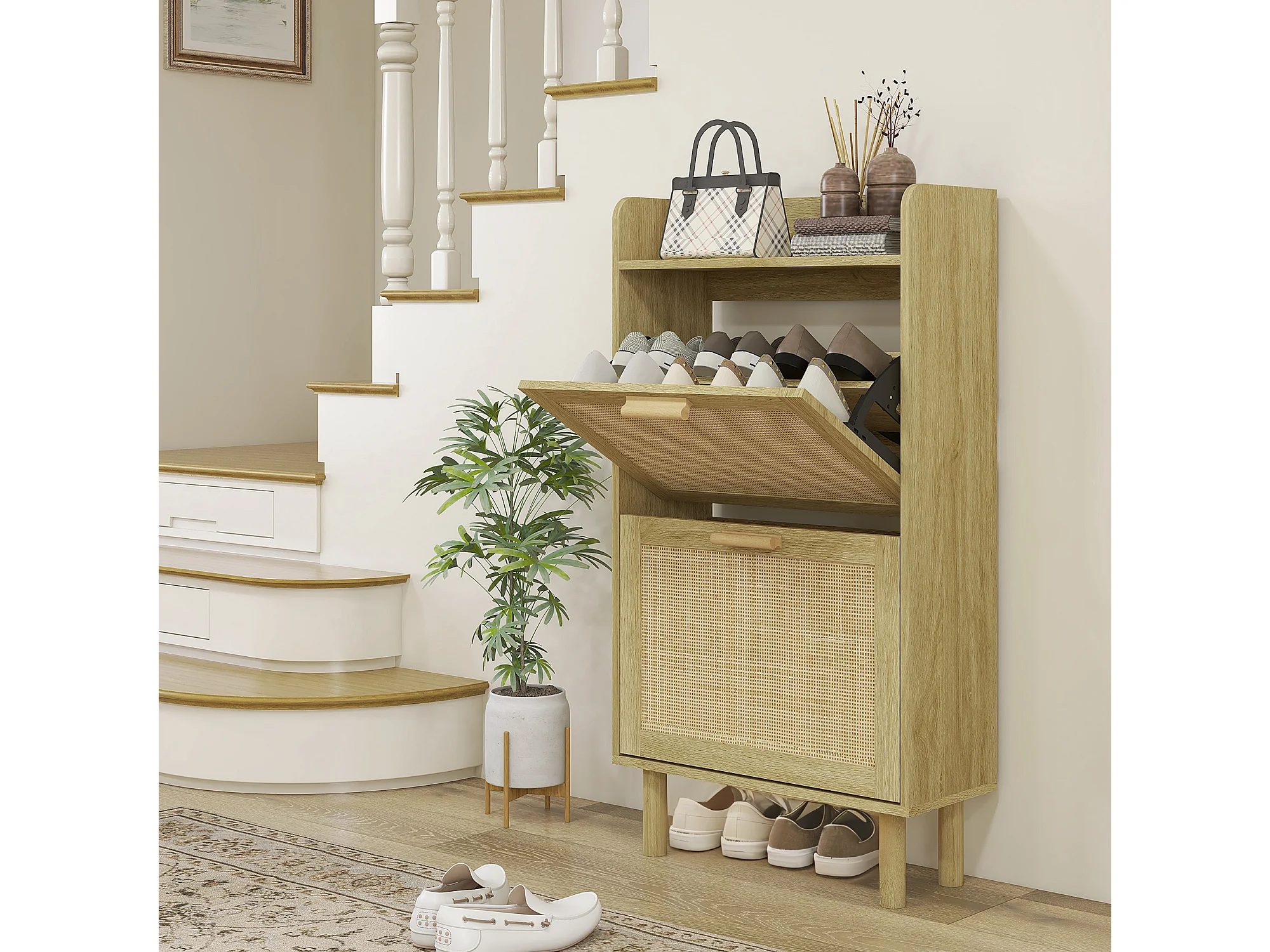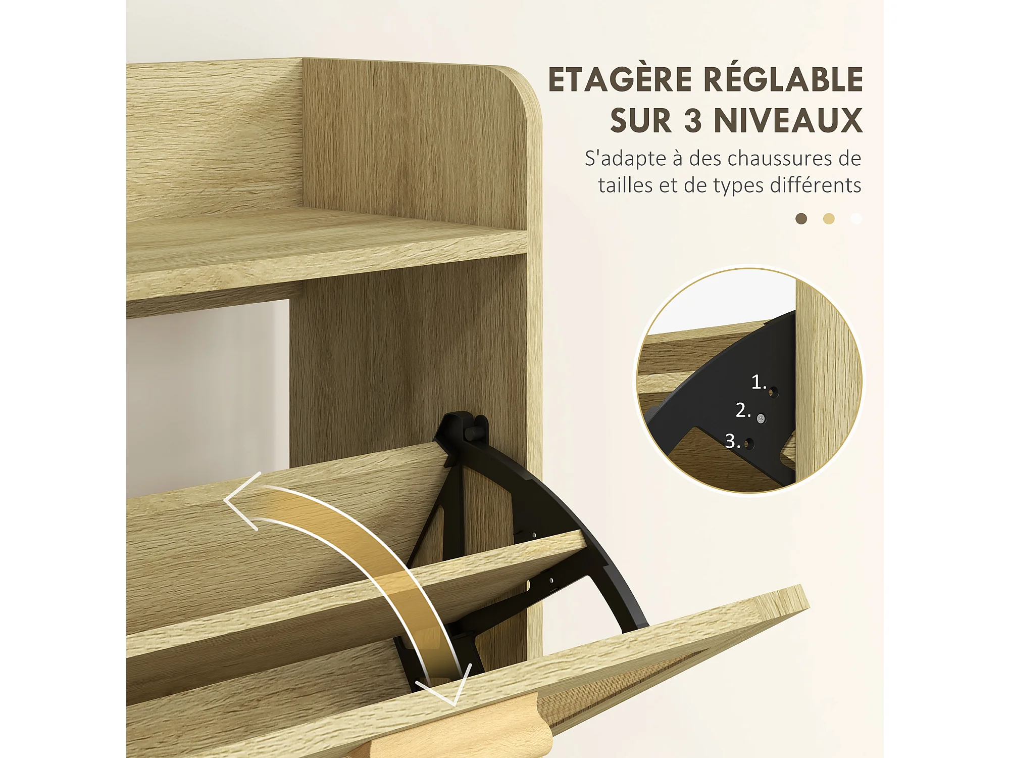 Meuble à chaussures style bohème chic - 2 portes abattantes, étagère - cannage rotin aspect bois clair