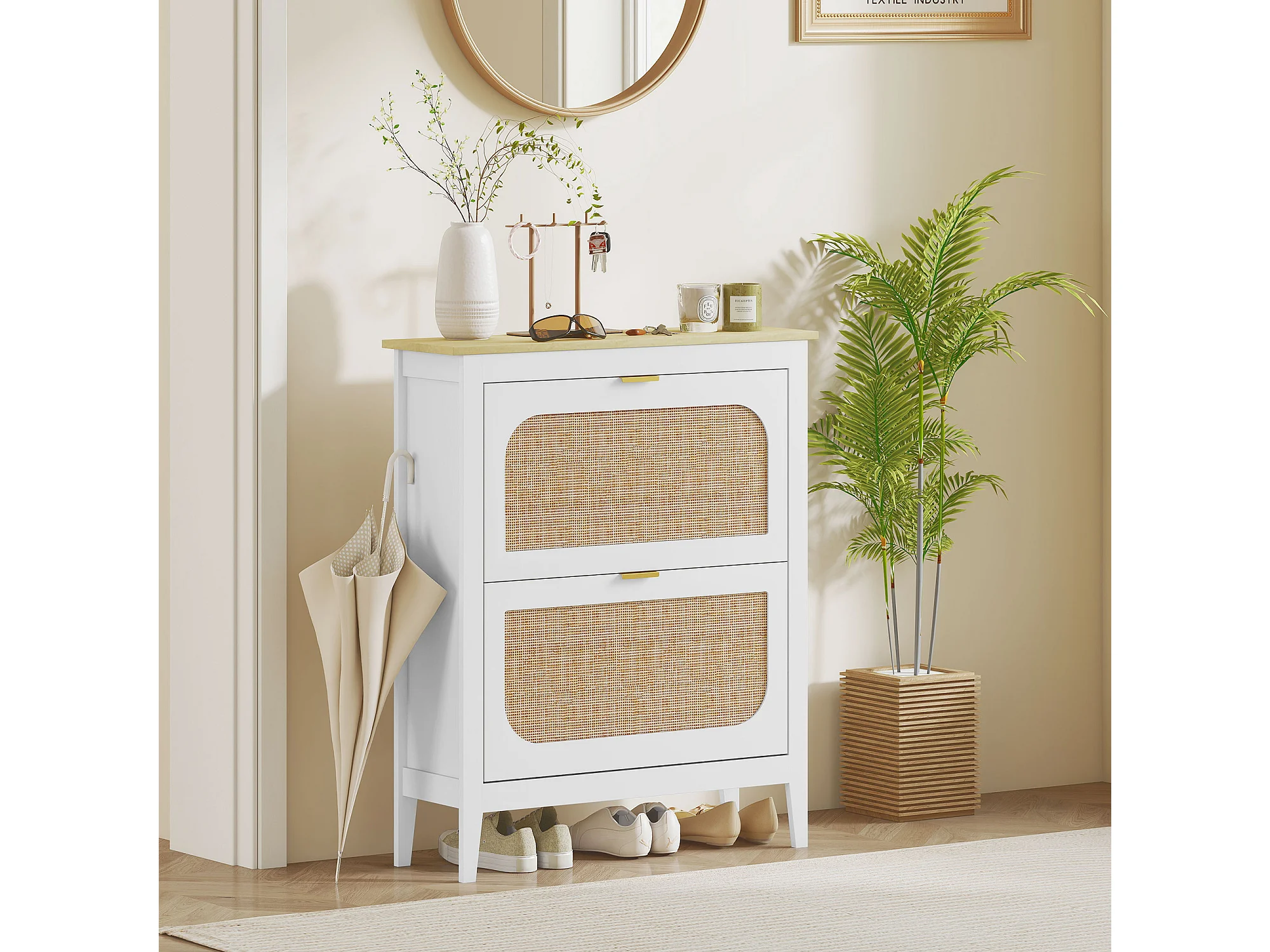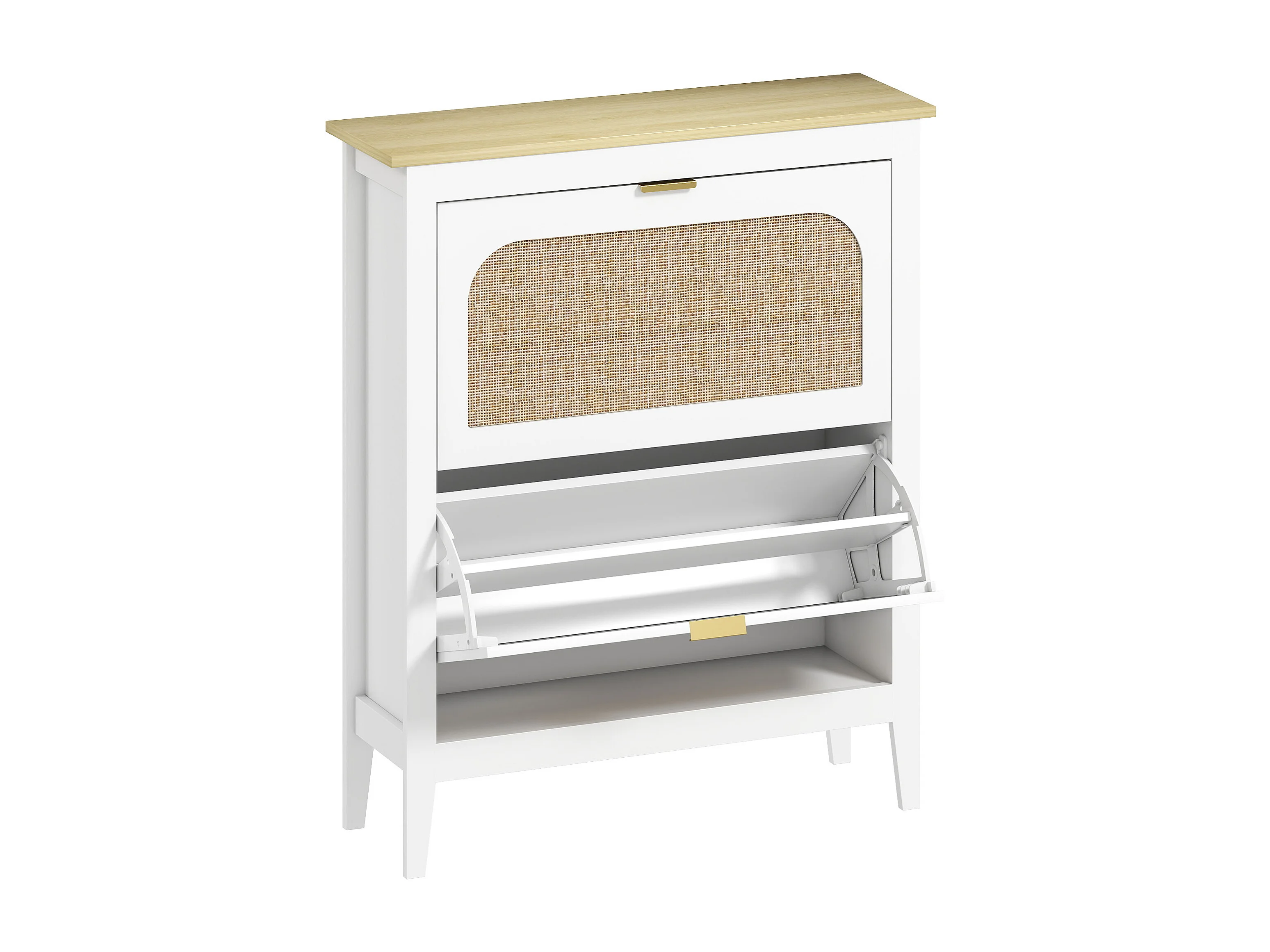 Meuble à chaussures style bohème chic 2 portes façades rotin poignées dorées effet bois clair blanc