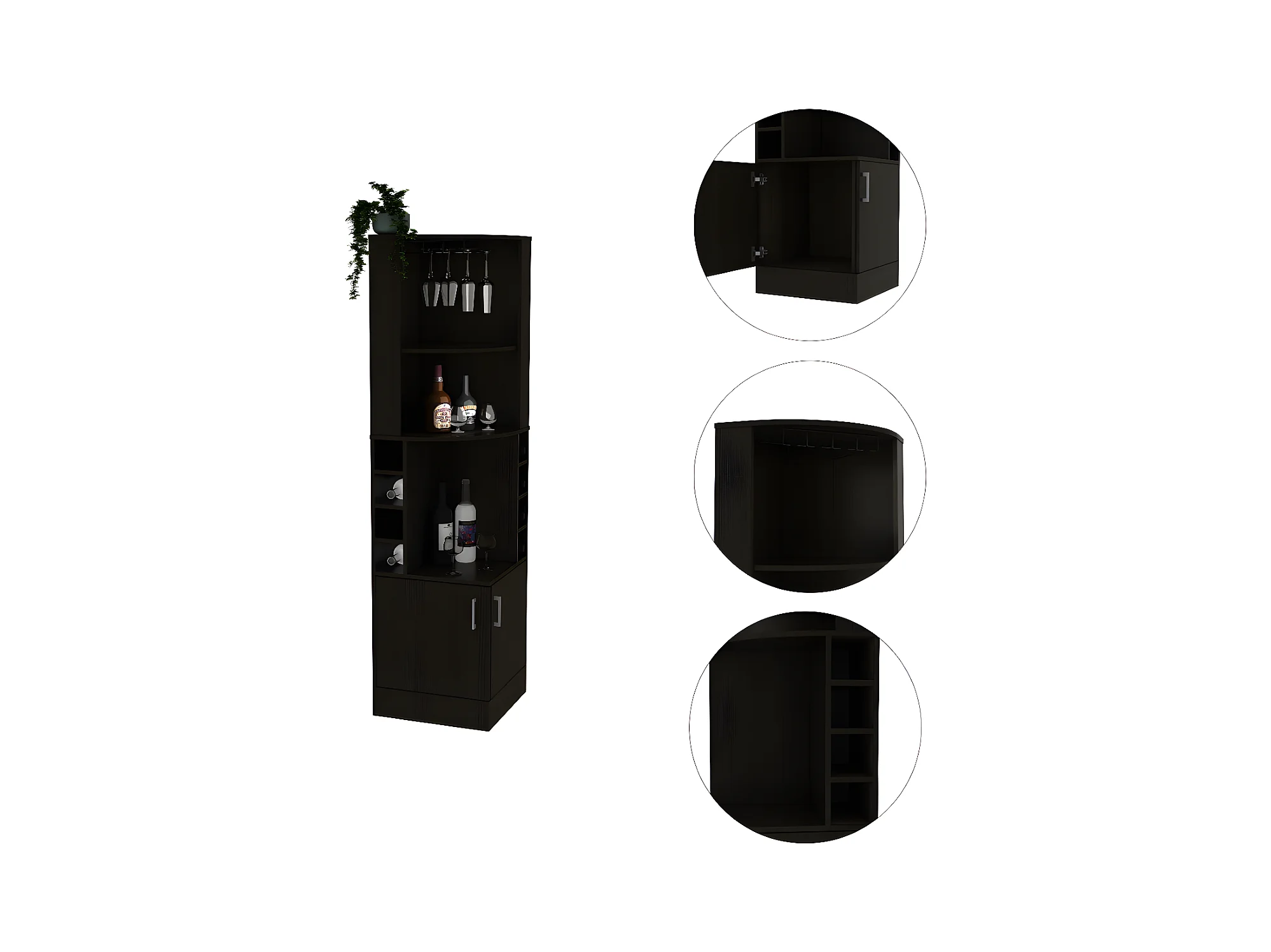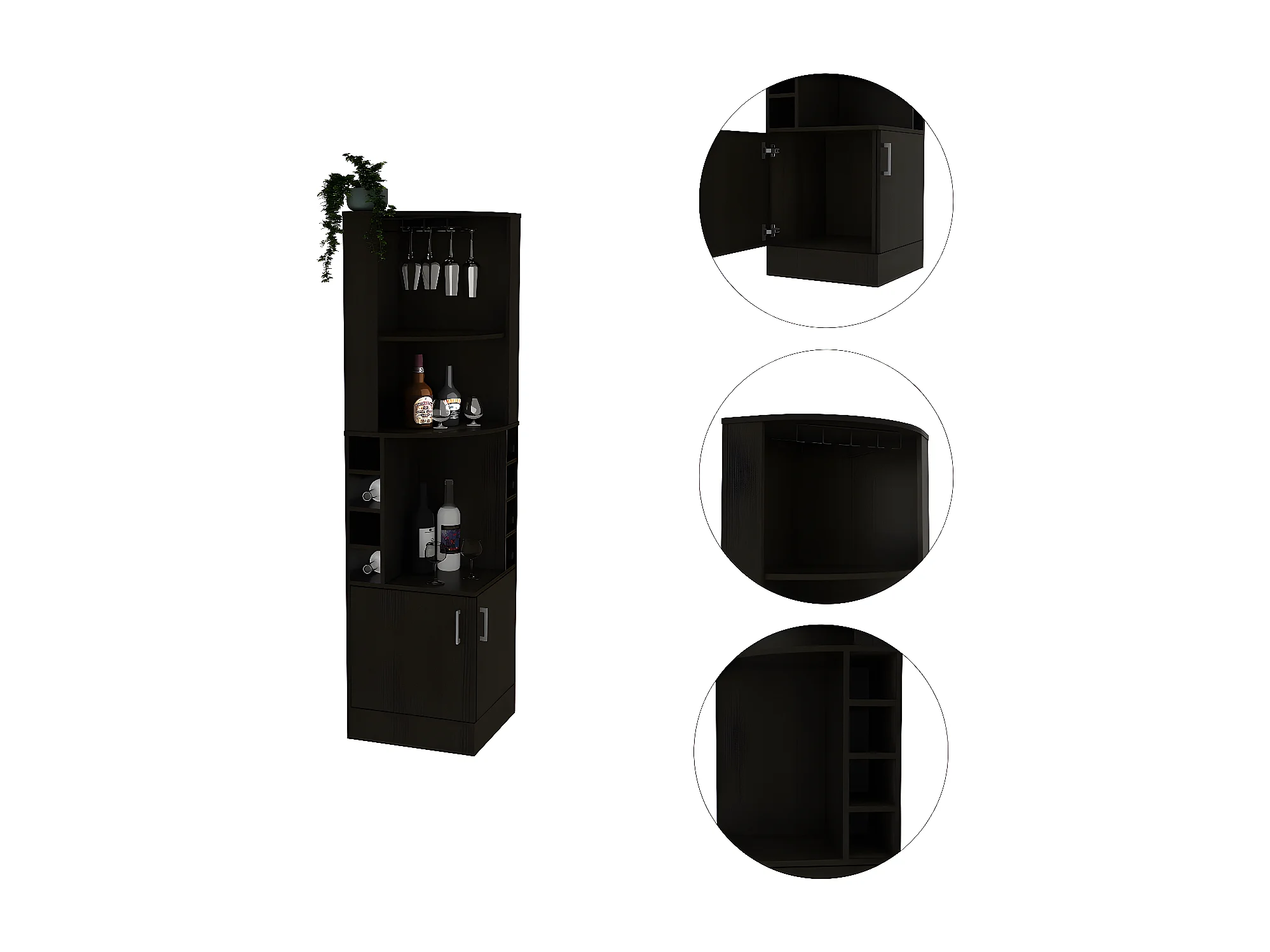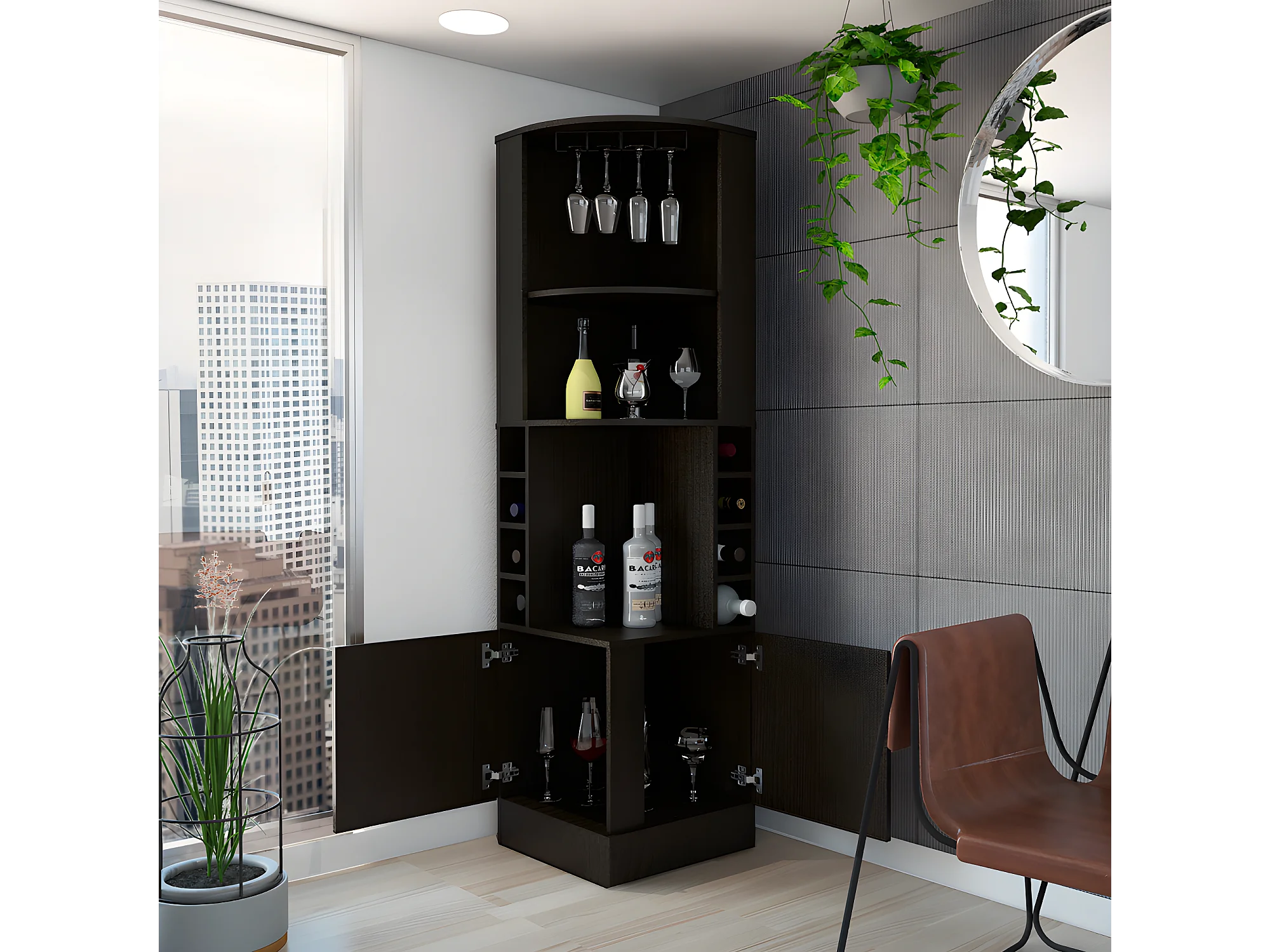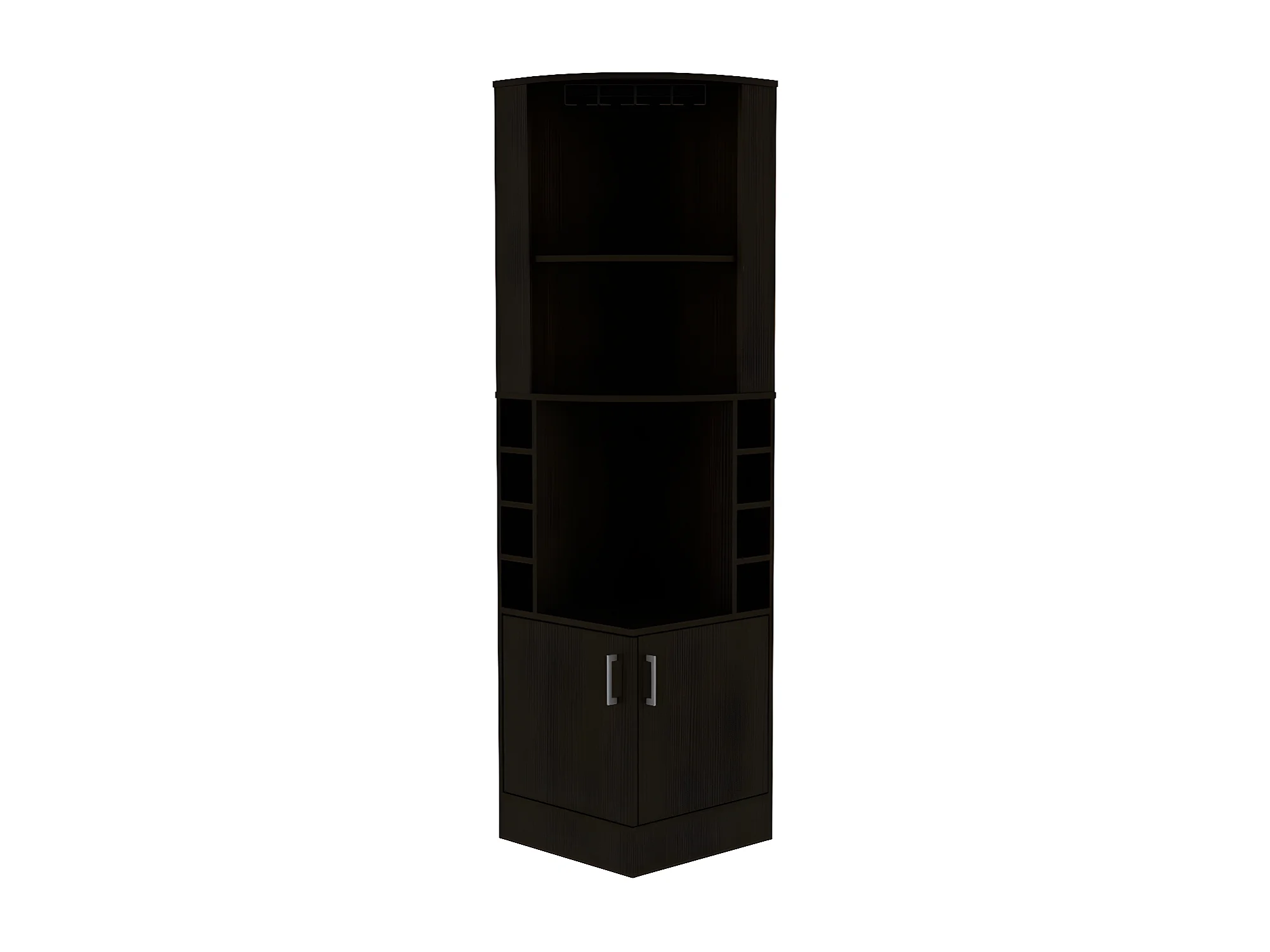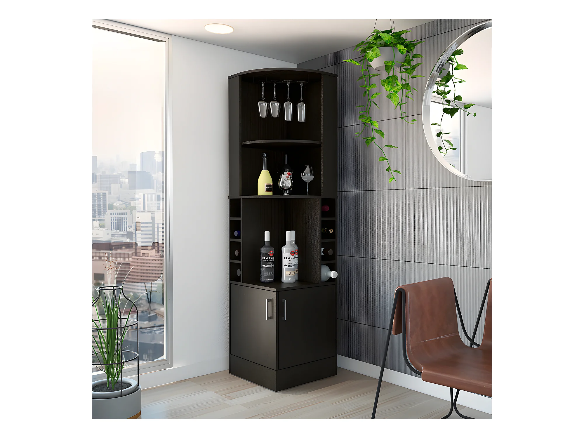 Meuble bar d'angle en mélamine Syrah avec quatre étagères, huit casiers à bouteilles et porte-verre , Noir 180.6 X 46,9 X 46.9 cm