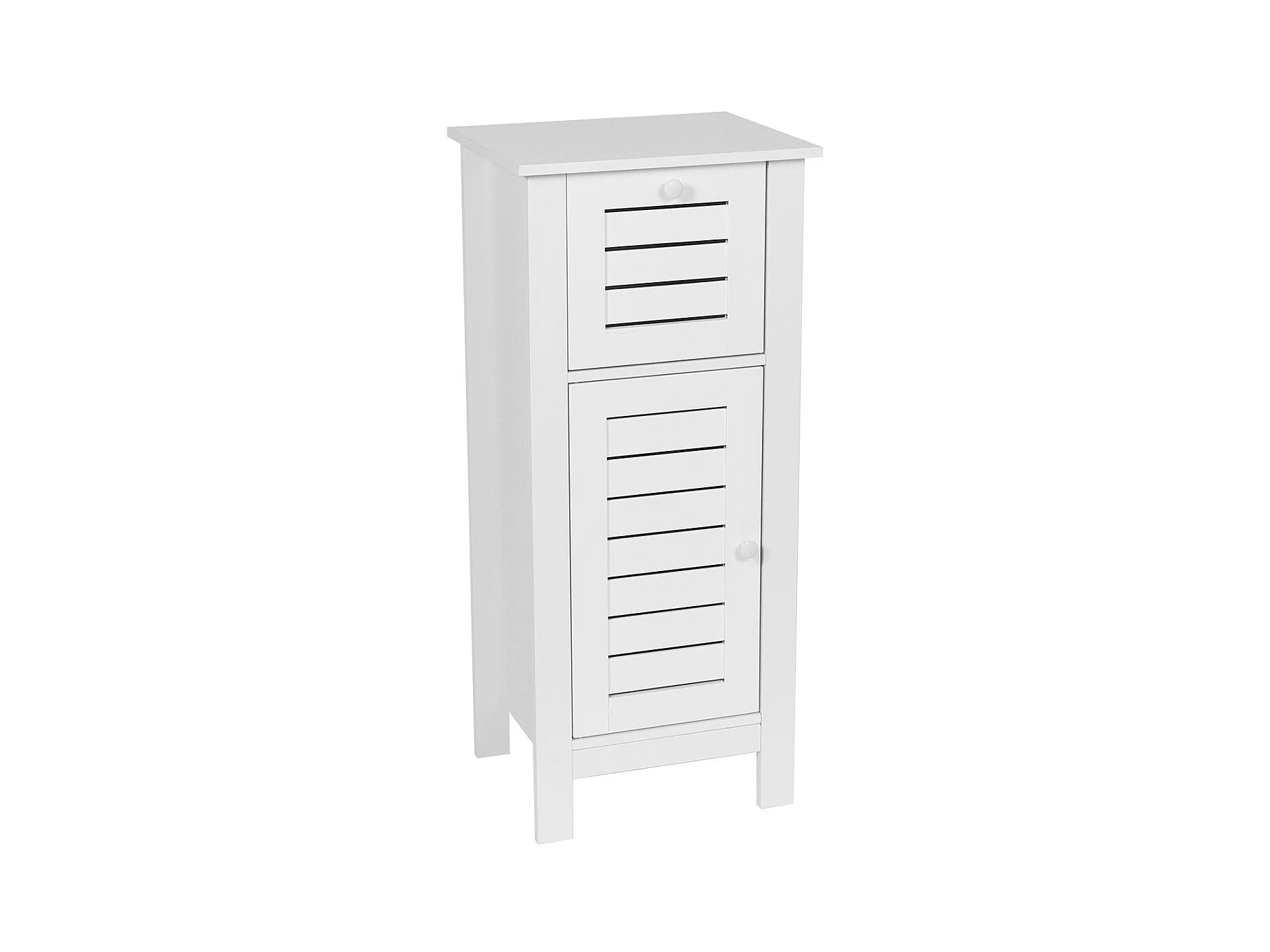 Meuble de salle de bain sur pied 2 portes persiennes 2 tiroirs niche blanc