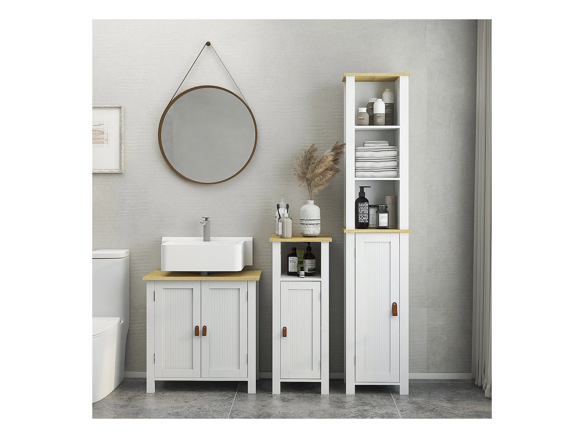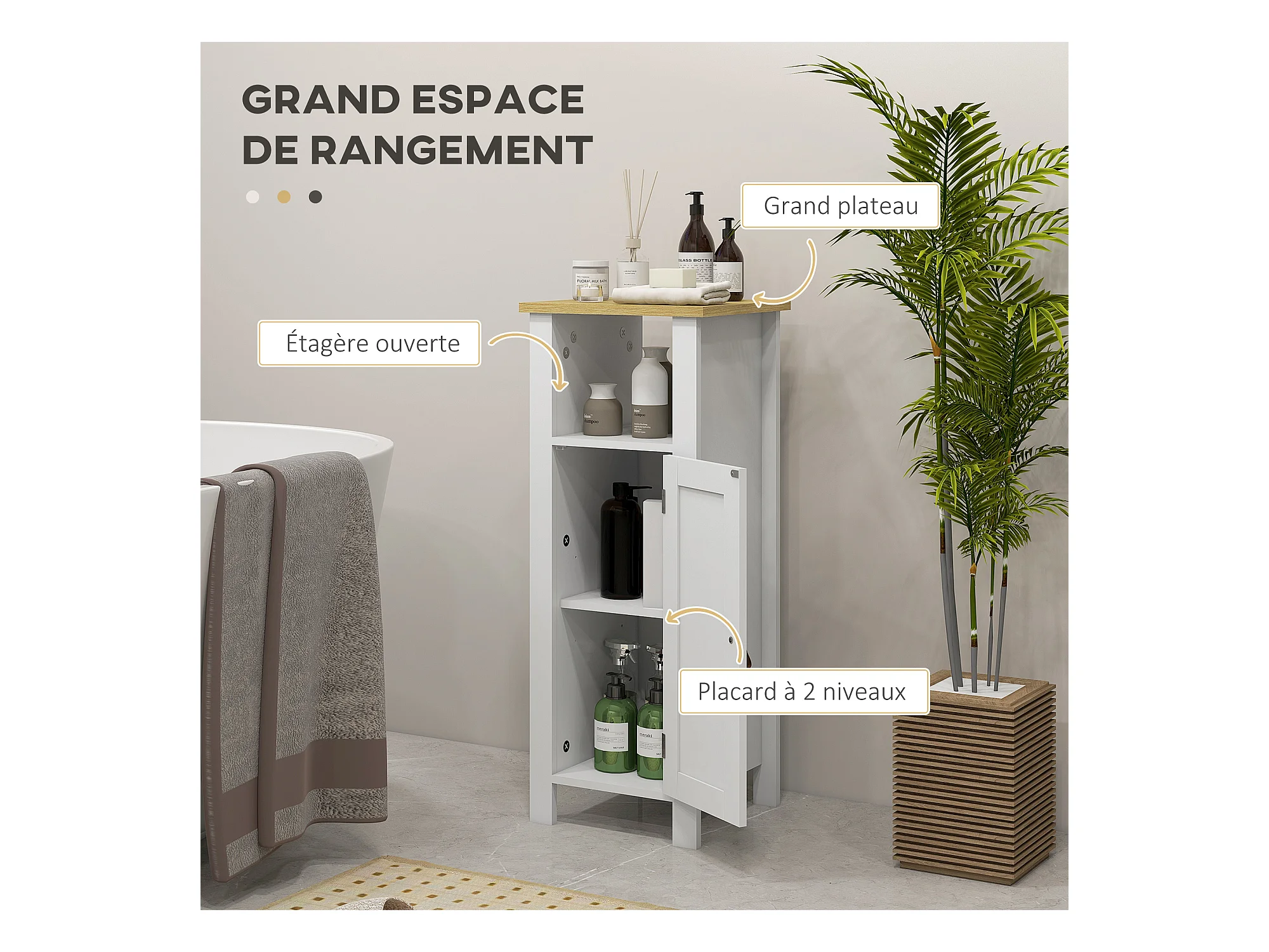 Meuble bas de salle de bain sur pied porte 2 étagères niche plateau aspect bois clair blanc