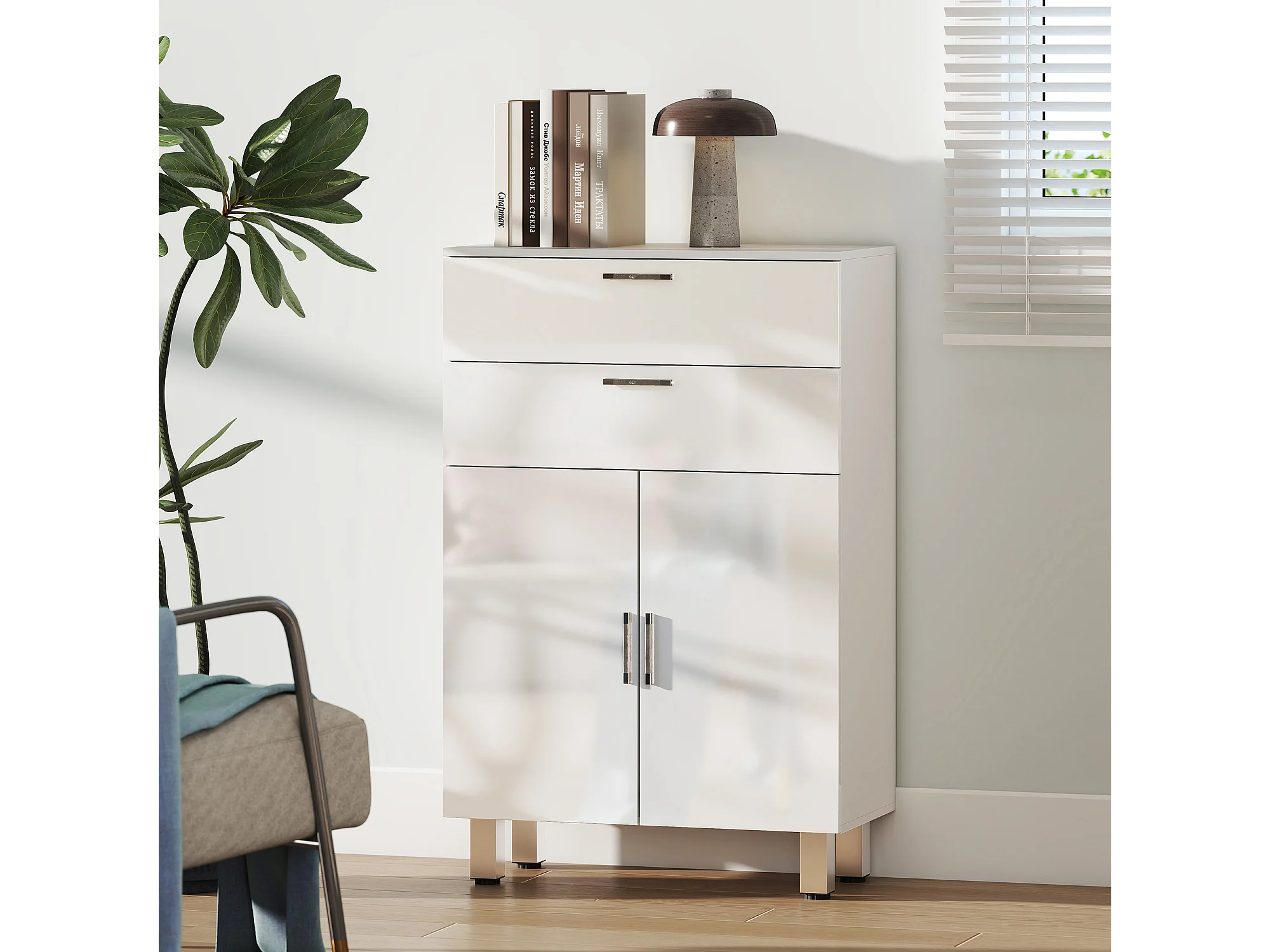 Meuble bas salle de bain façade blanc laqué 2 portes 2 étagères 2 tiroirs