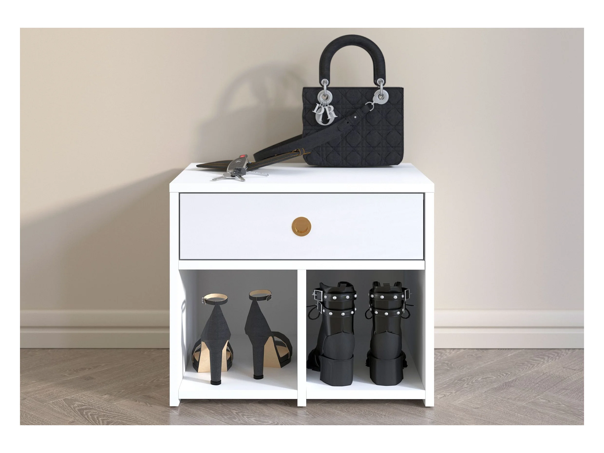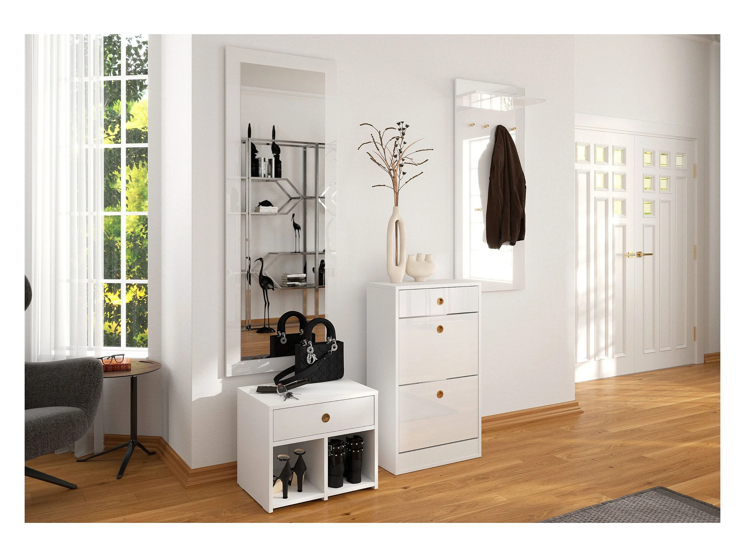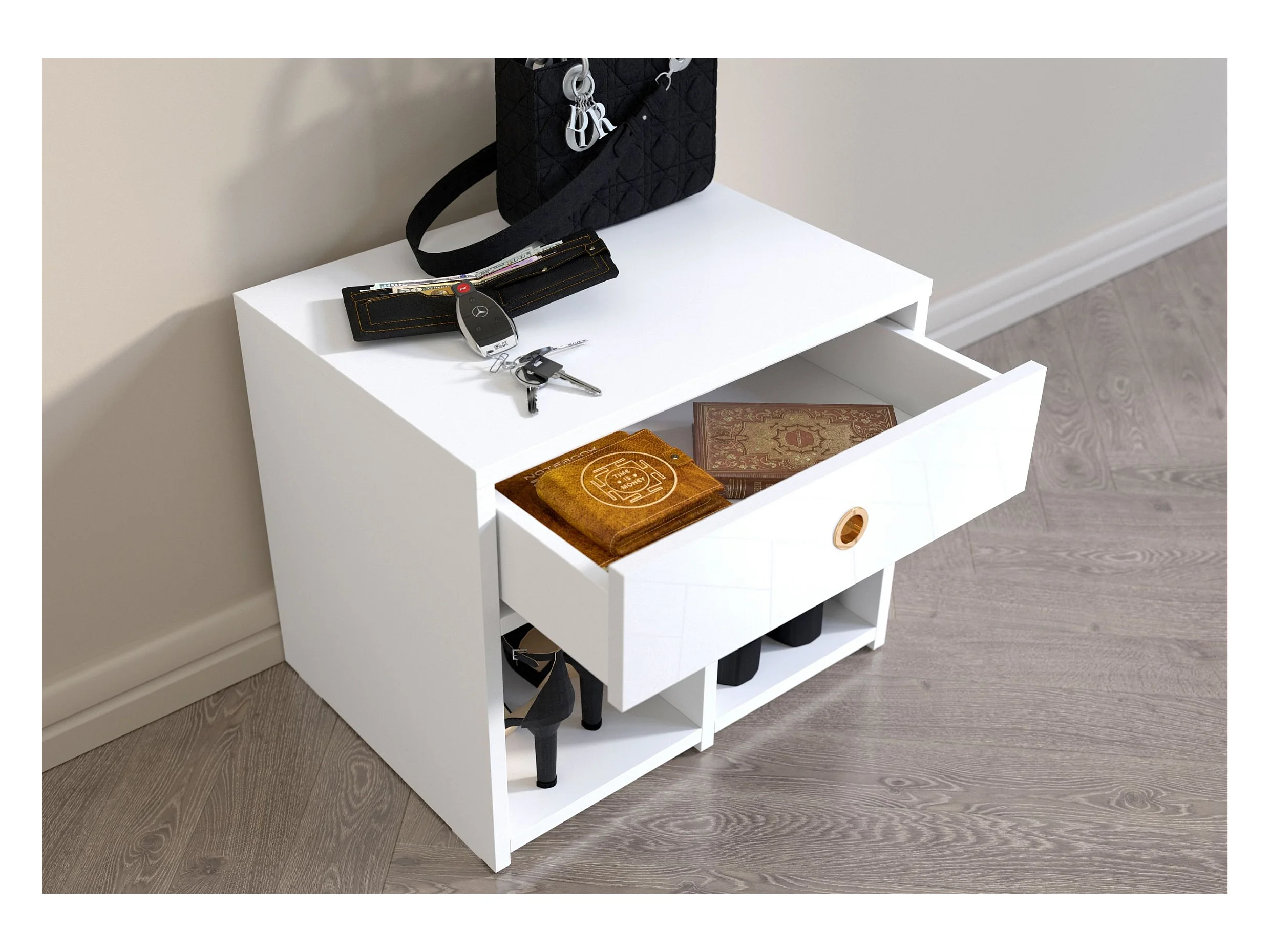 Meuble blanc - siège avec étagères et tiroir MIRAGE / haute brillance