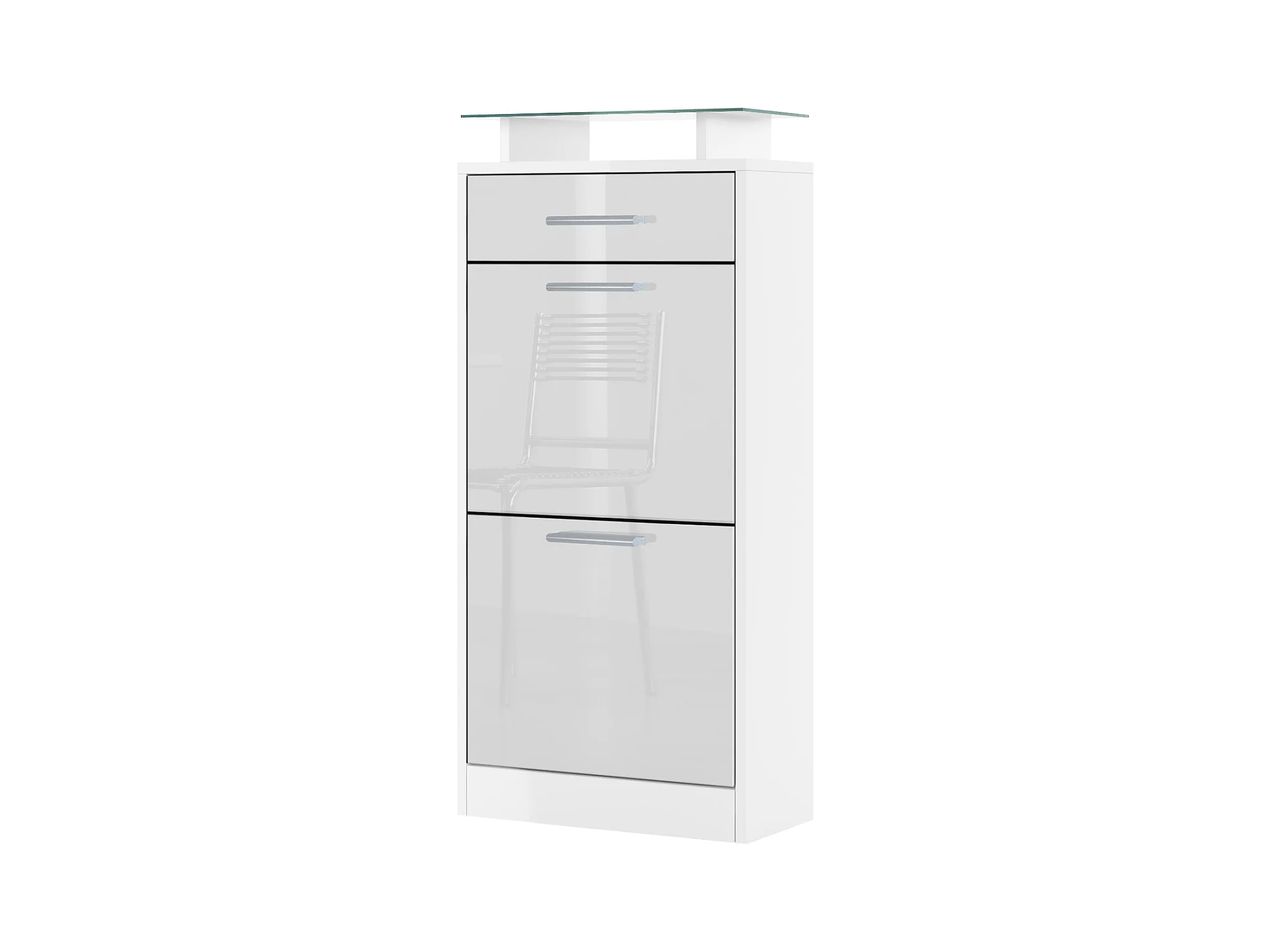 Meuble chaussure Loret V2, Étagère à chaussures pour 8 paires de chaussures avec 2 clapets, 1 tiroir, Blanc mat/Blanc brillant (46 x 104 x 23 cm)