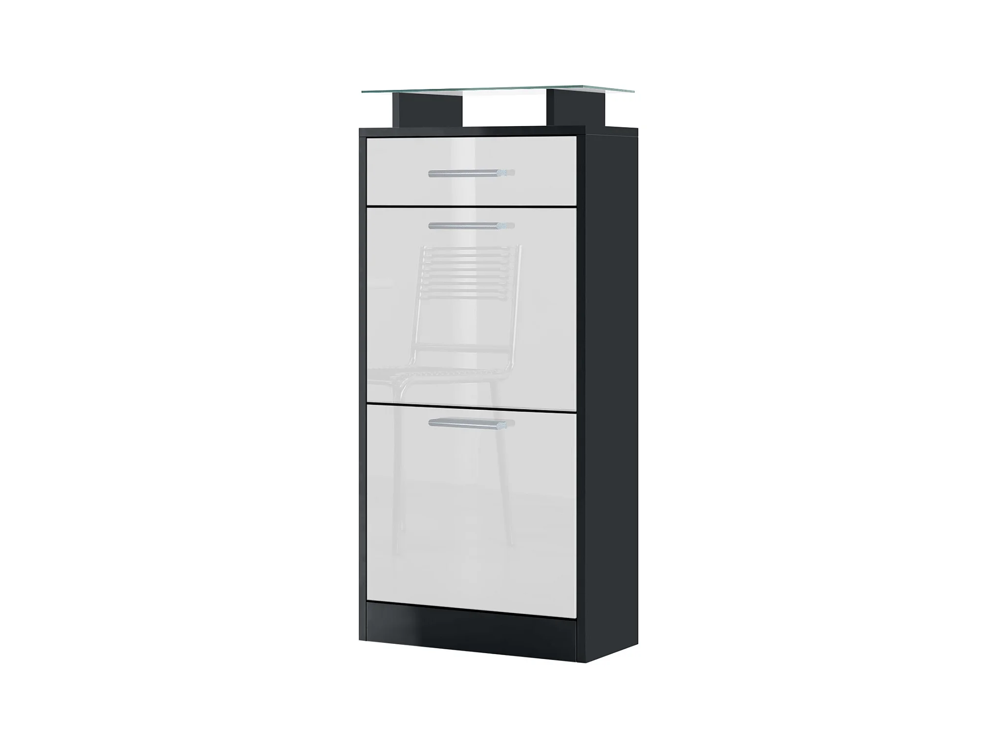 Meuble chaussure Loret V2, Étagère à chaussures pour 8 paires de chaussures avec 2 clapets, 1 tiroir, Noir mat/Blanc brillant (46 x 104 x 23 cm)