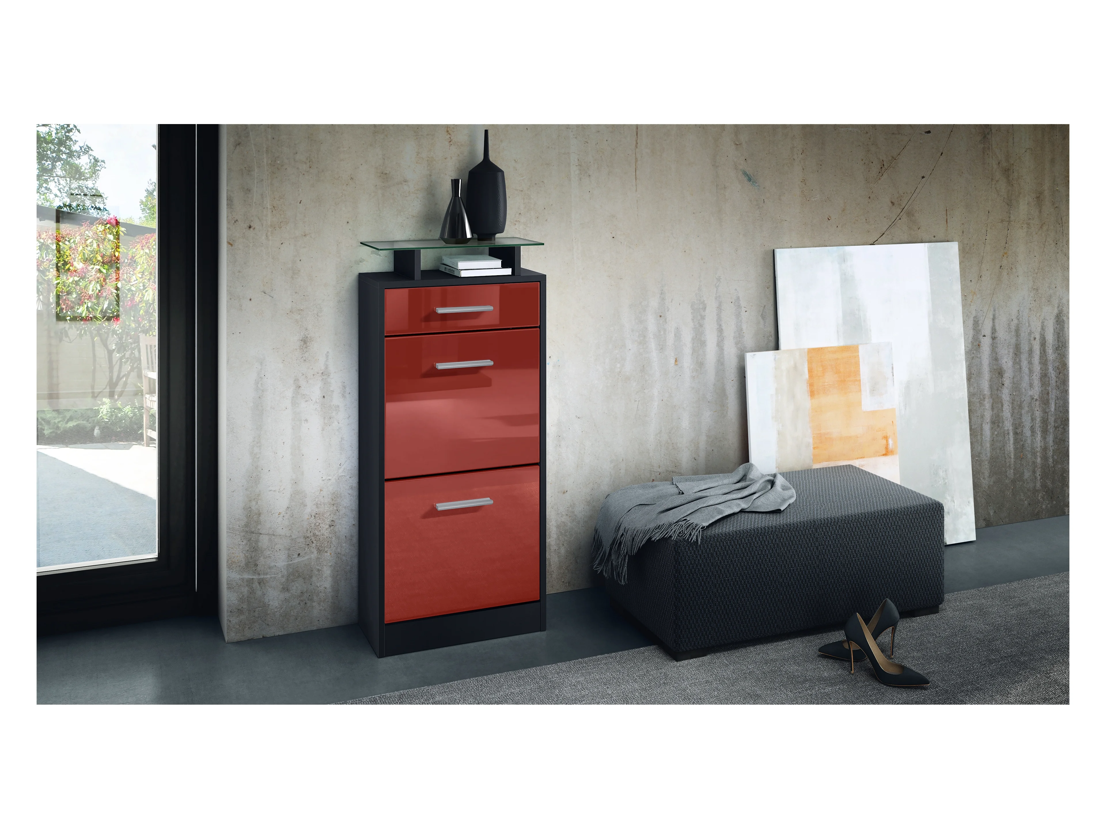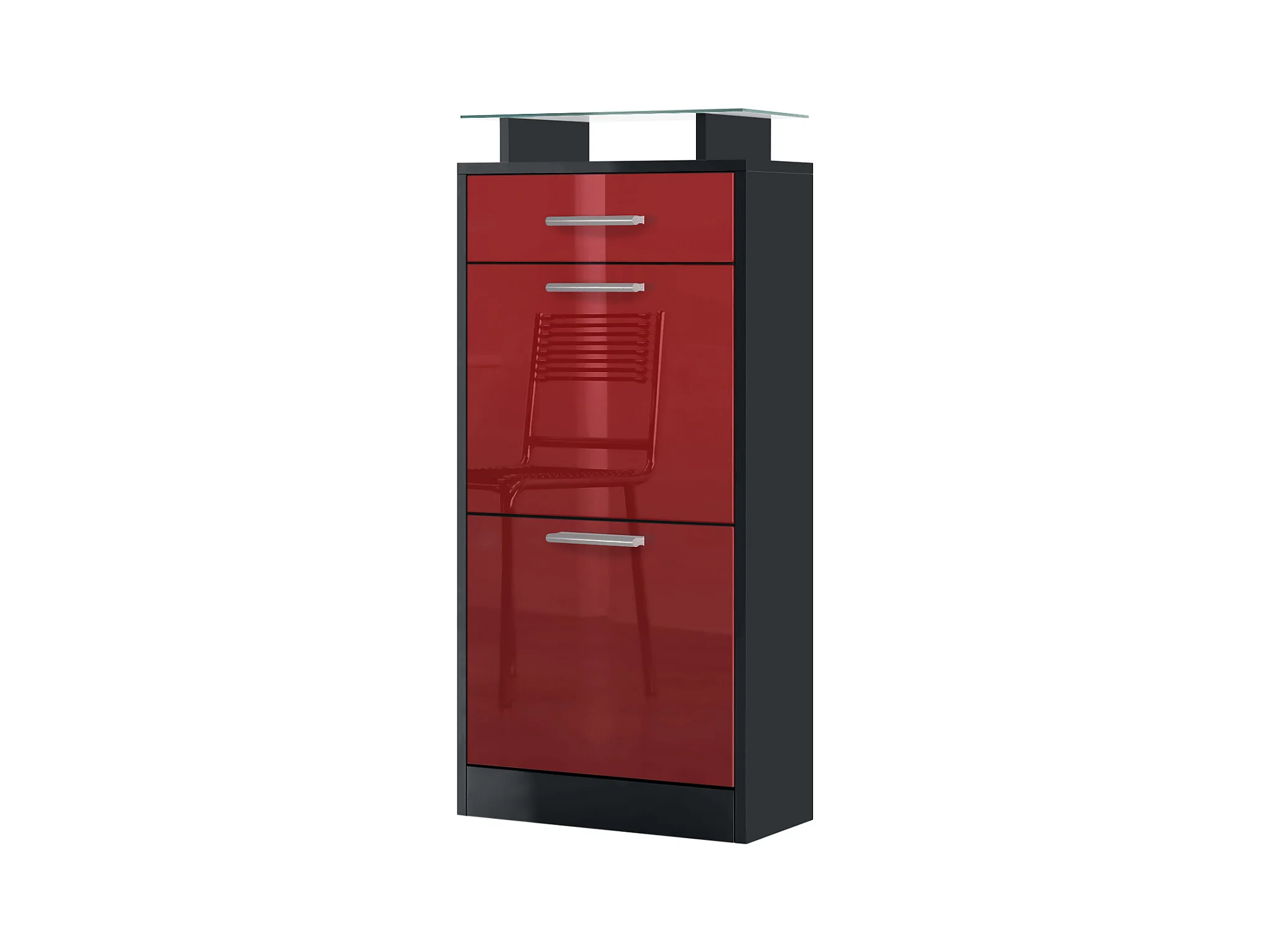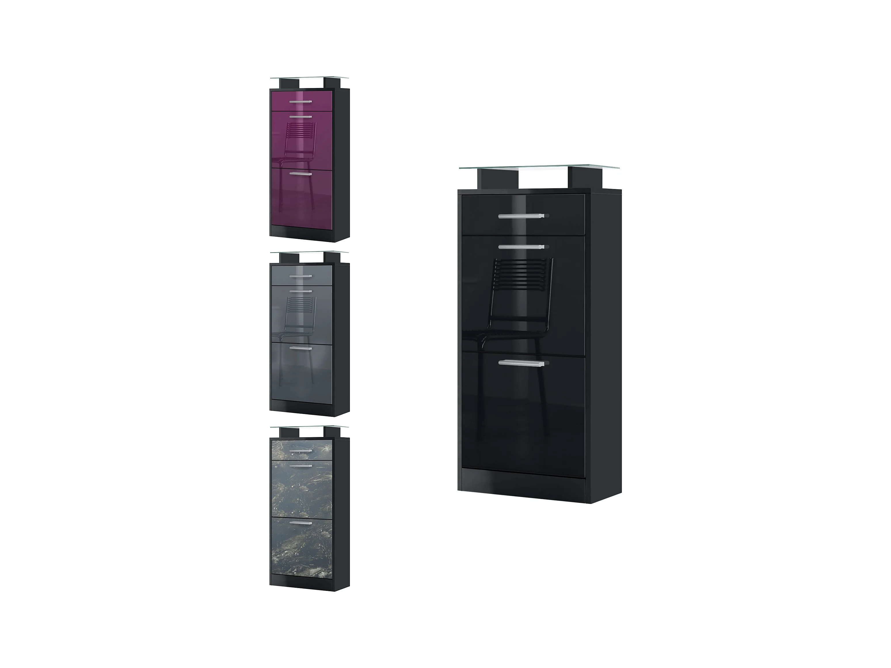 Meuble chaussure Loret V2, Étagère à chaussures pour 8 paires de chaussures avec 2 clapets, 1 tiroir, Noir mat/Bordeaux brillant (46 x 104 x 23 cm)