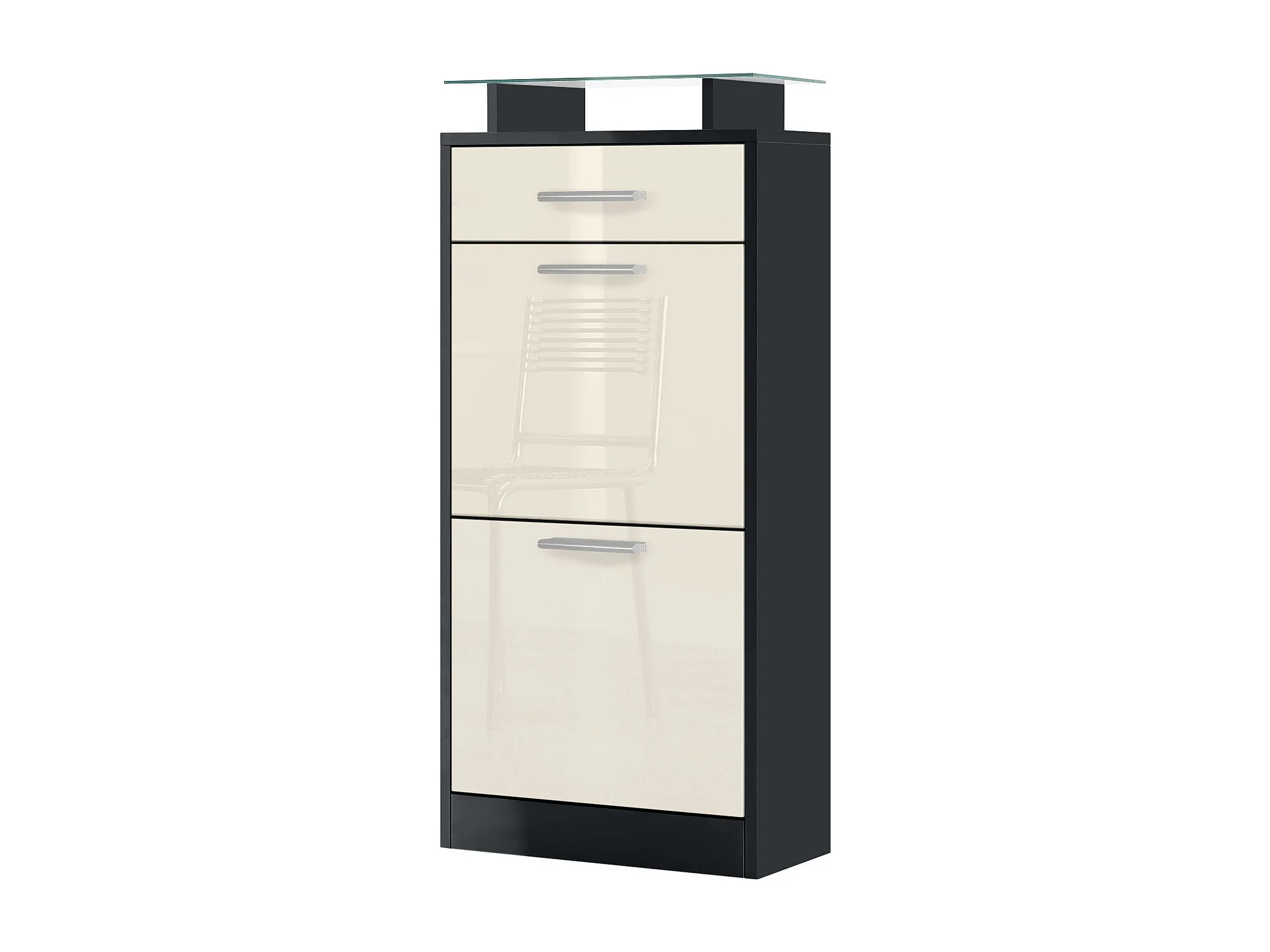 Meuble chaussure Loret V2, Étagère à chaussures pour 8 paires de chaussures avec 2 clapets, 1 tiroir, Noir mat/Crème brillant (46 x 104 x 23 cm)
