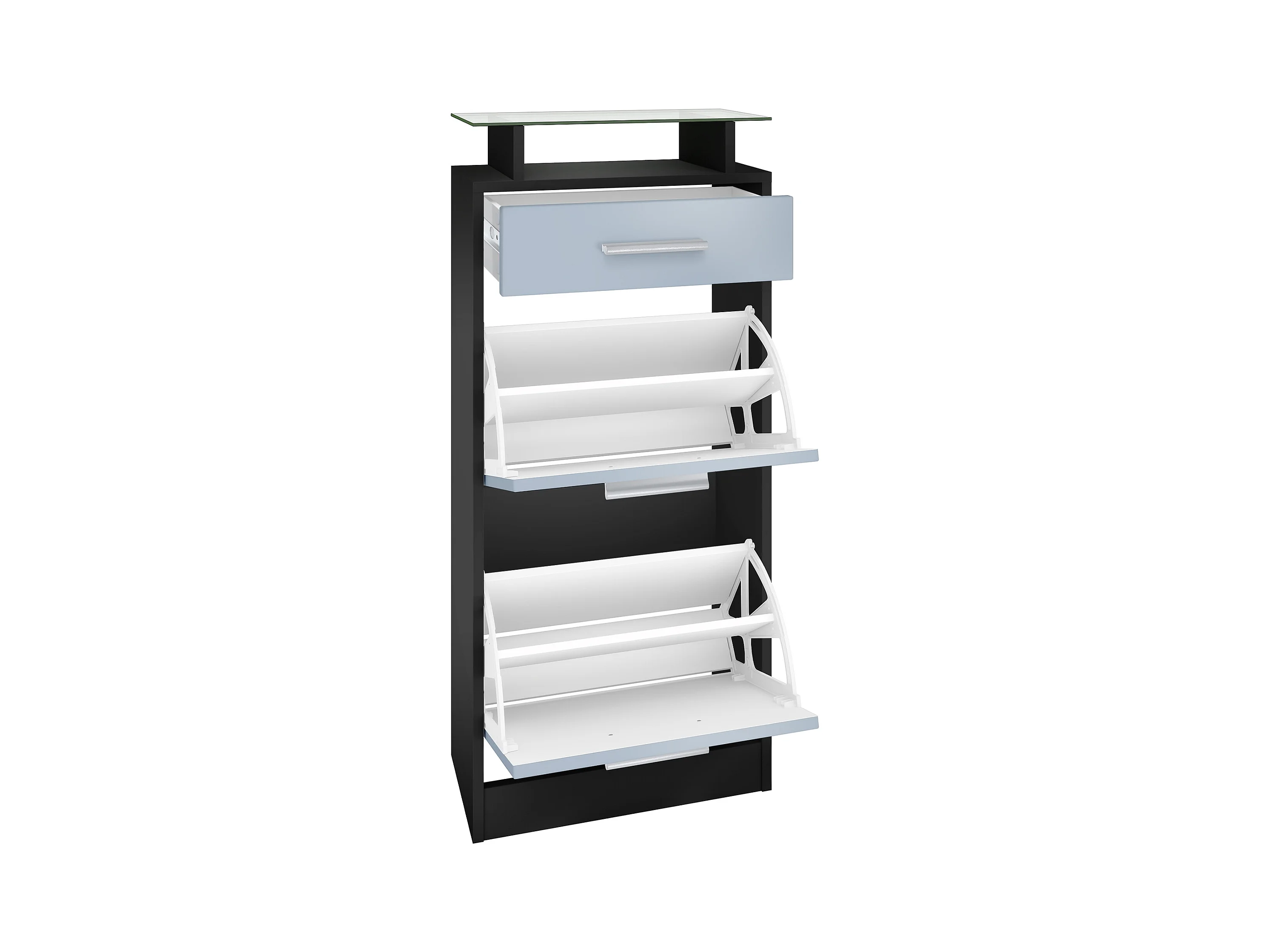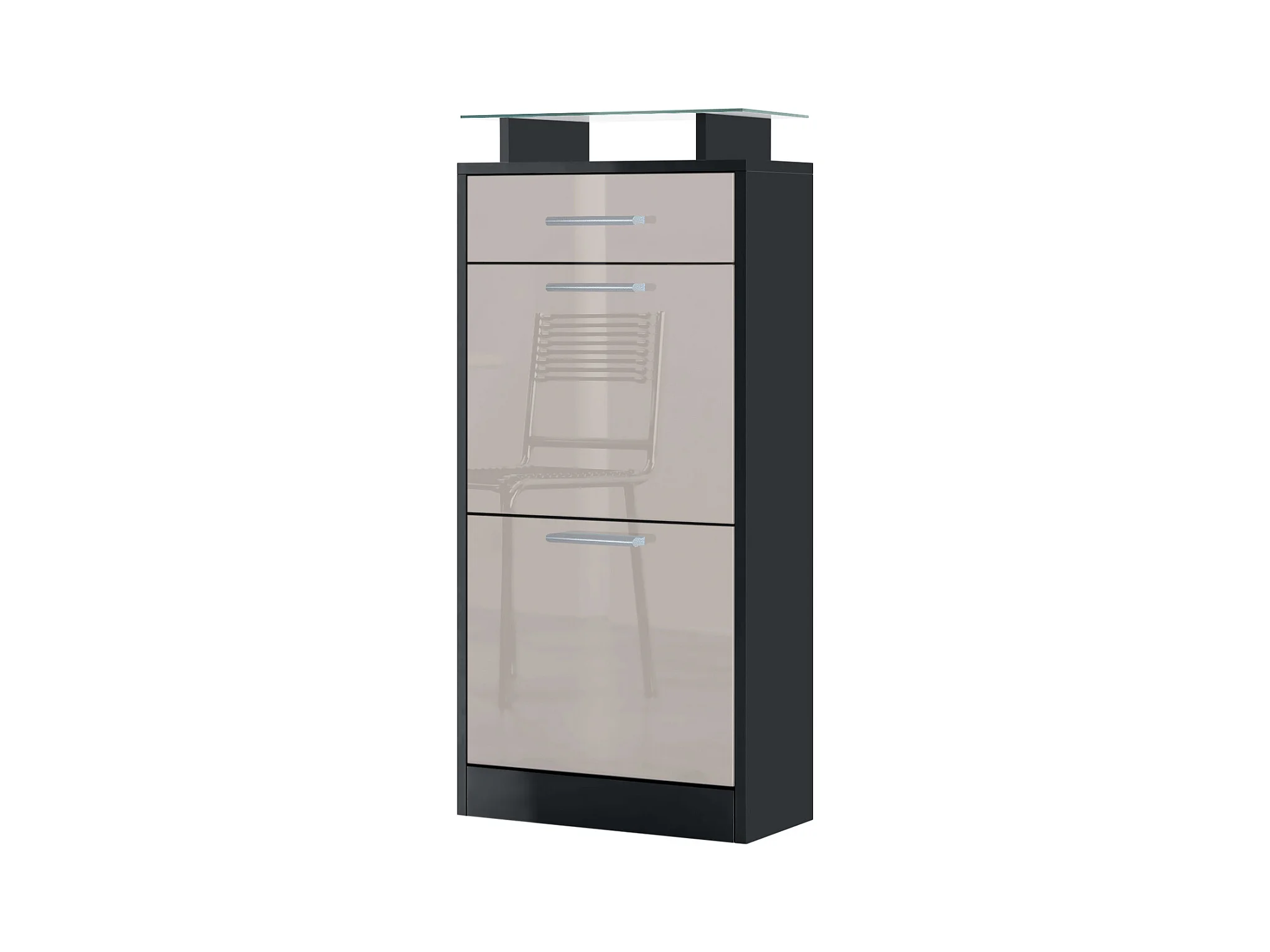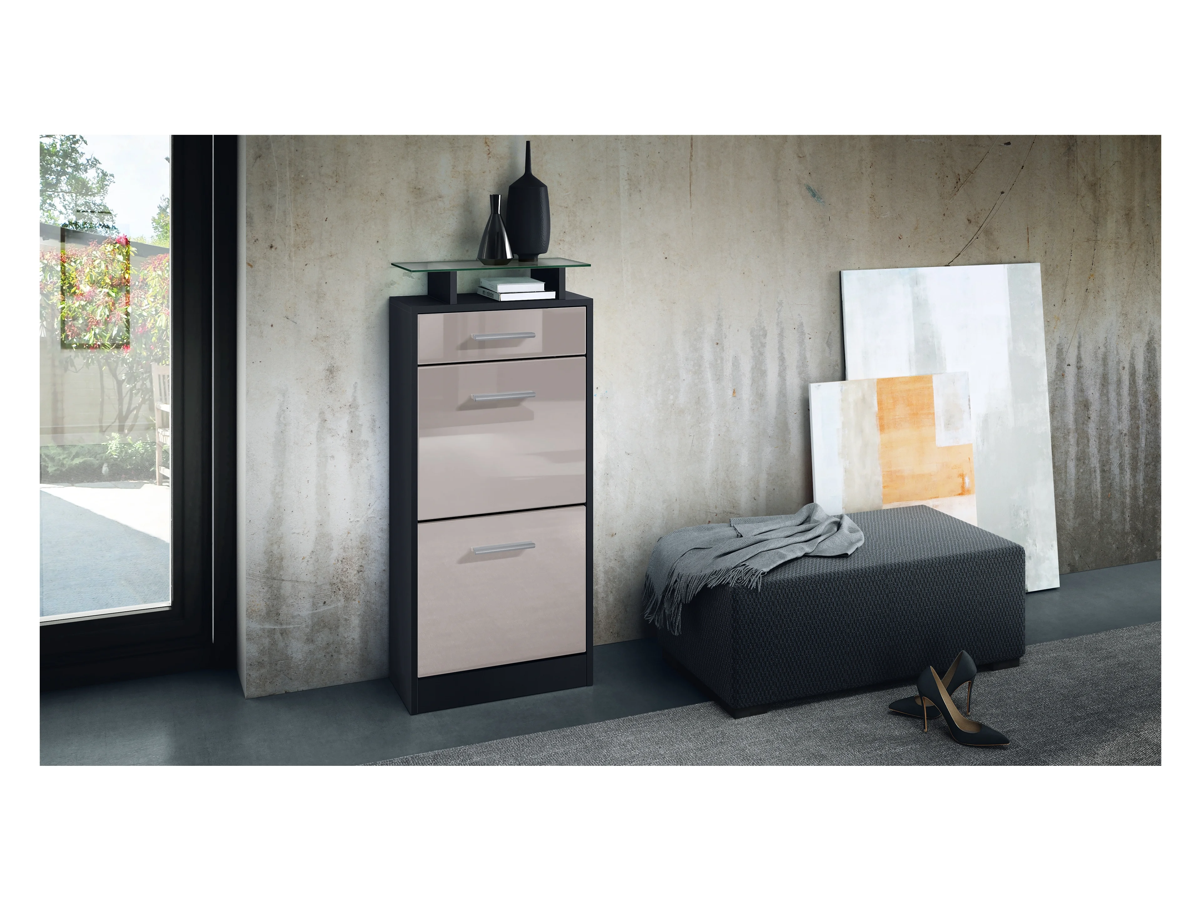 Meuble chaussure Loret V2, Étagère à chaussures pour 8 paires de chaussures avec 2 clapets, 1 tiroir, Noir mat/Gris sable brillant (46 x 104 x 23 cm)
