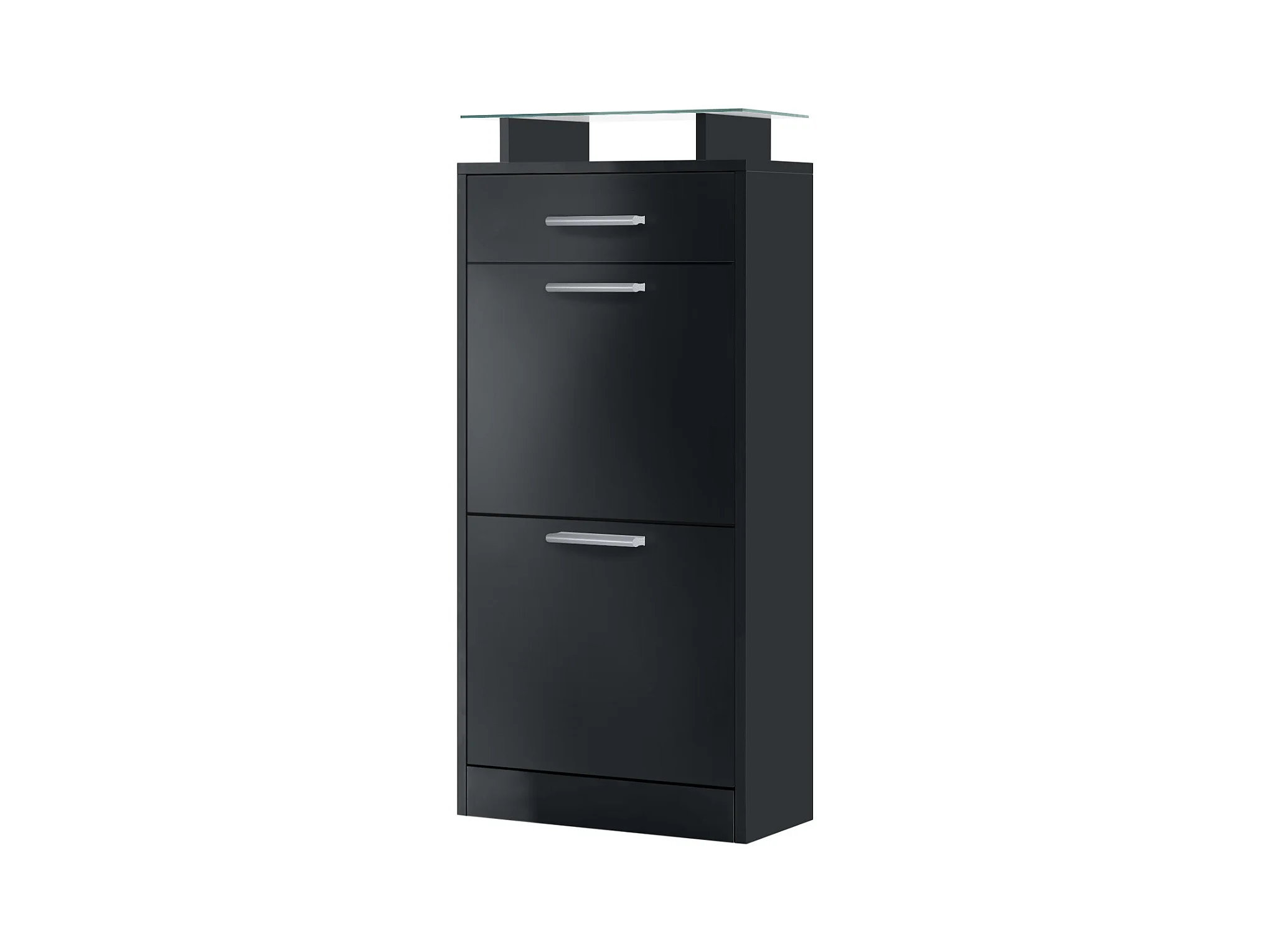 Meuble chaussure Fiesta pour 16 paires de chaussures avec clapets et tablette en verre, Anthracite mat/Noir brillant, poignées Noir brillant (89x104x23 cm)