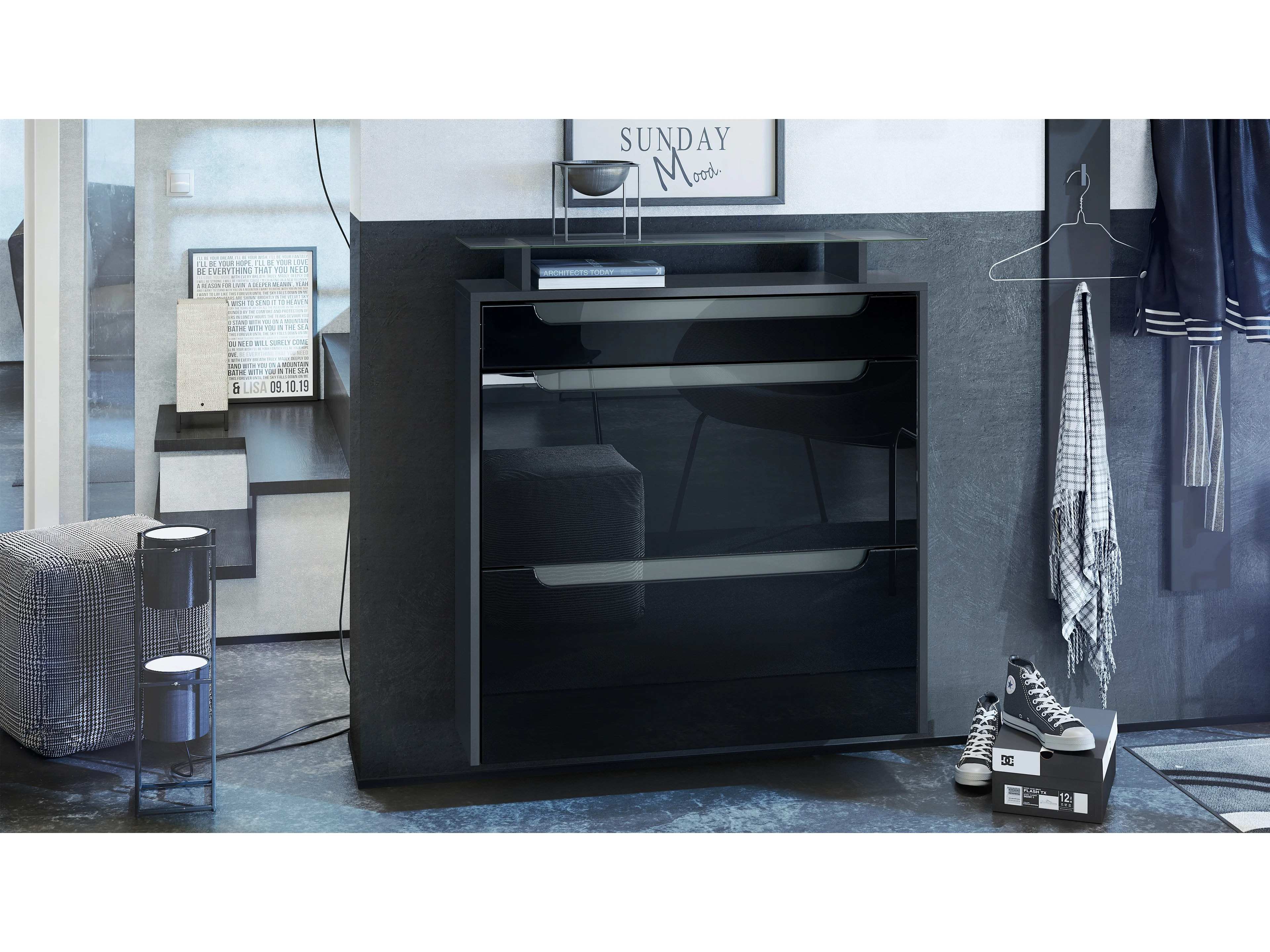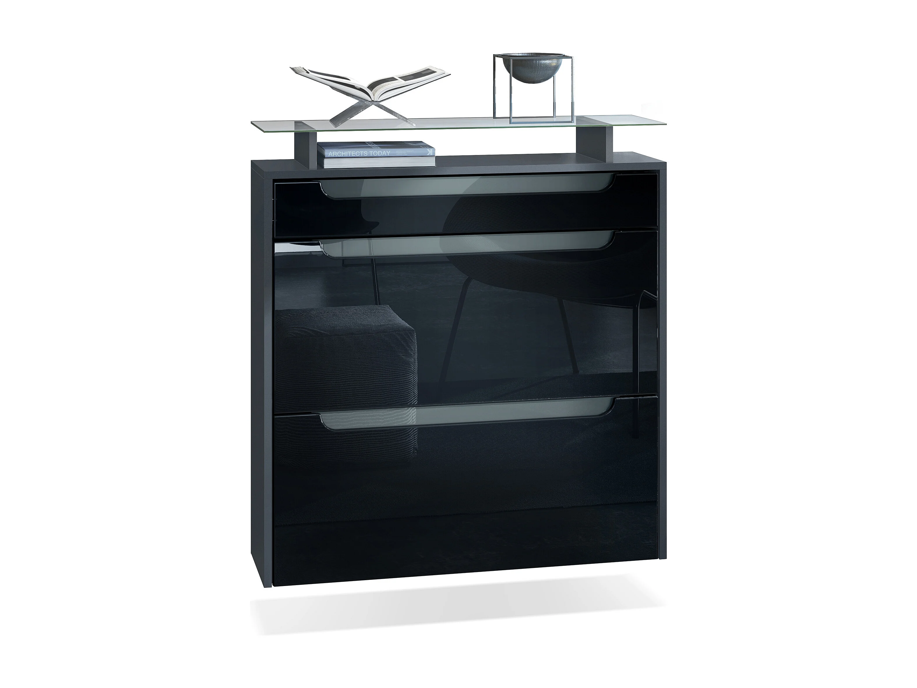 Meuble chaussures Annie pour 16 paires de chaussures avec clapets et tablette en verre, Anthracite mat/Noir brillant, poignées Gris brillant (89x96x23 cm)