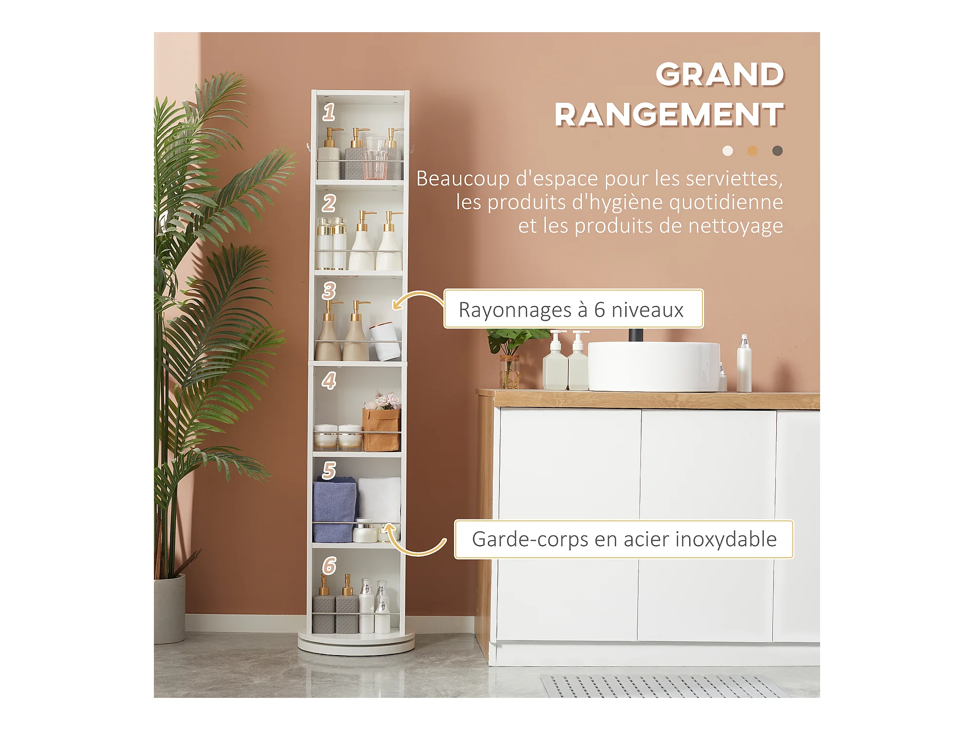 Meuble colonne de salle de bain pivotant avec miroir - 6 étagères - 36L x 36l x 171H cm - blanc