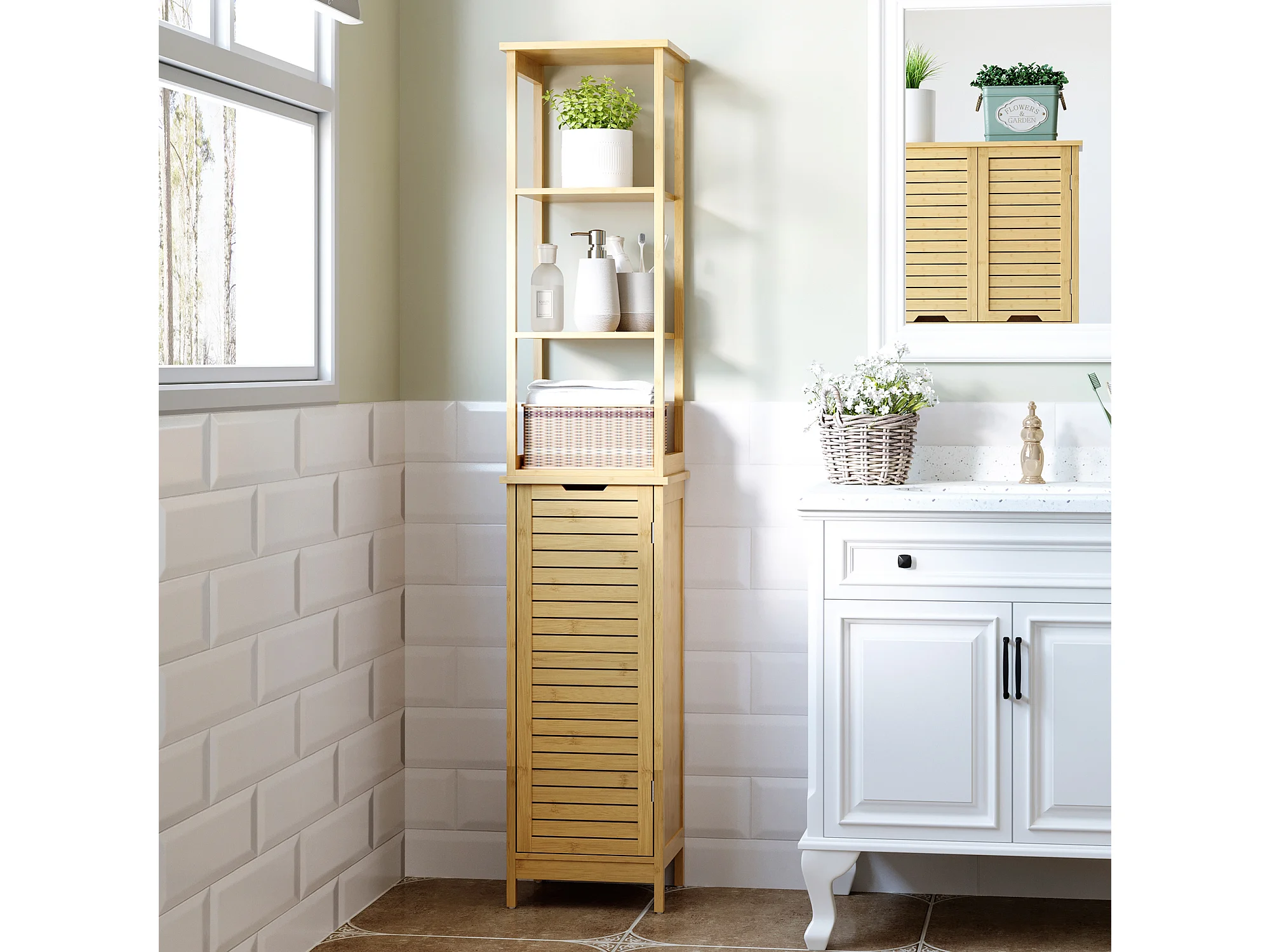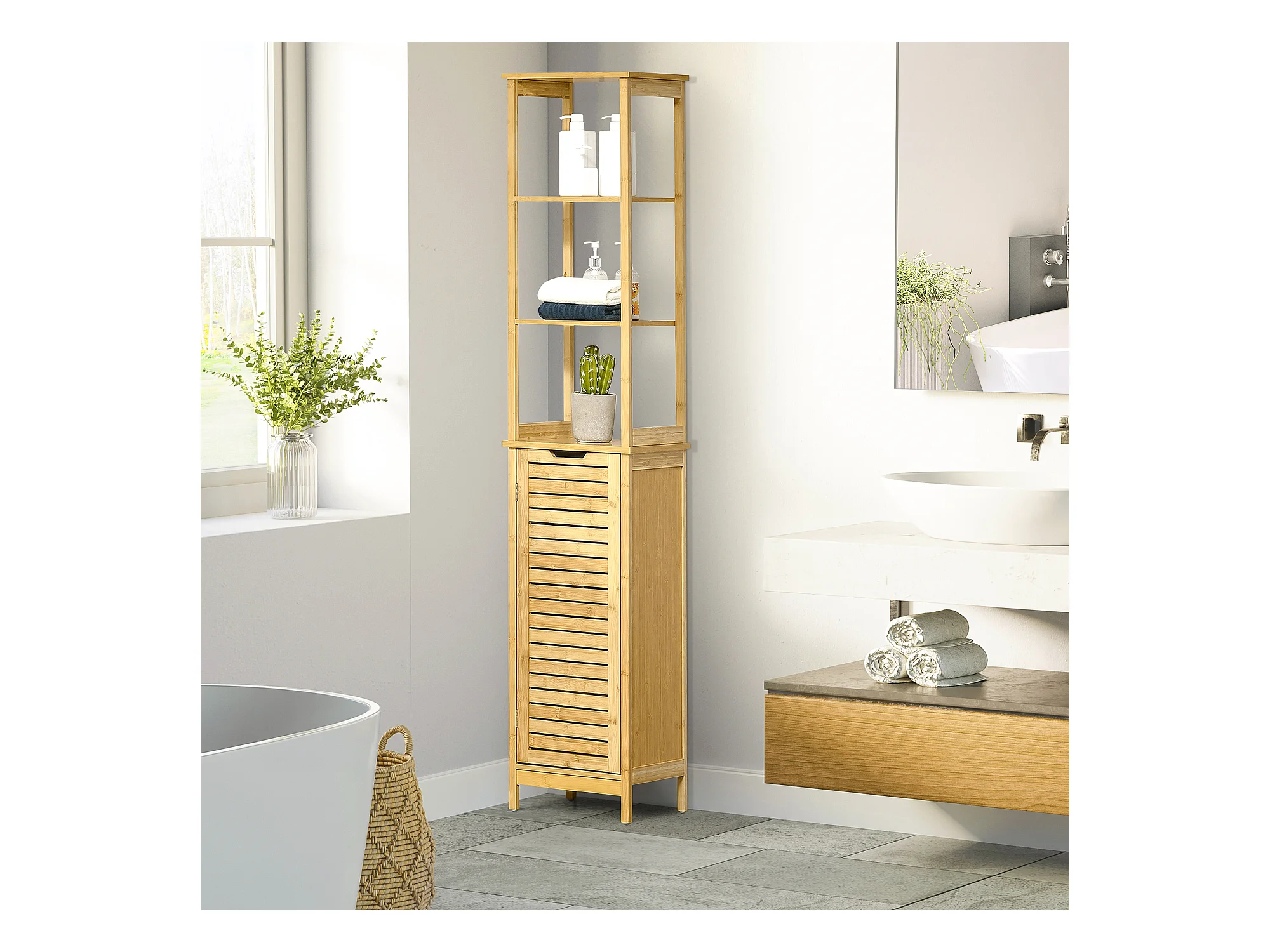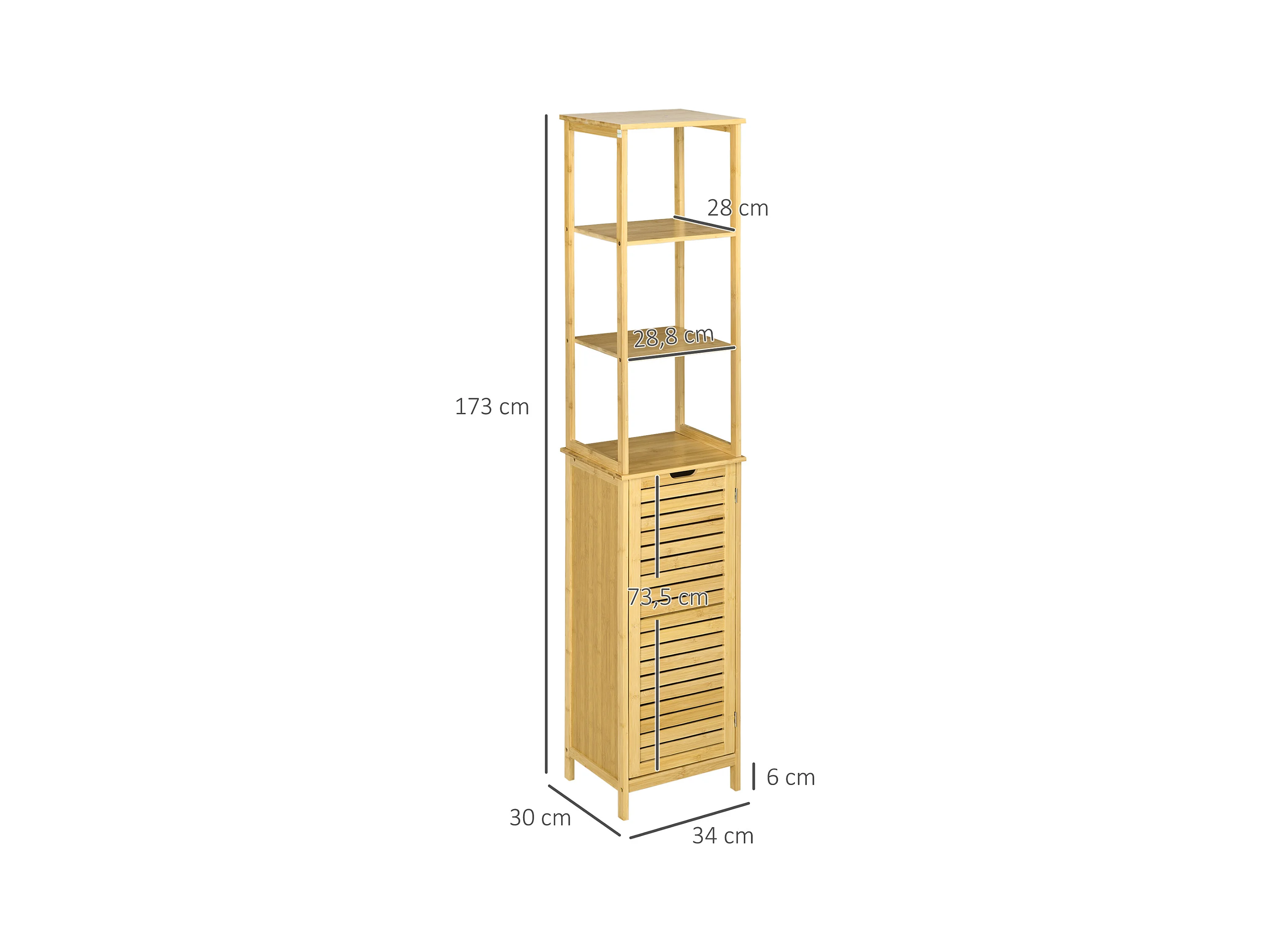 Meuble colonne rangement salle de bain style cosy dim. 34L x 30l x 173H cm porte à lattes 3 étagères bambou MDF aspect bois clair