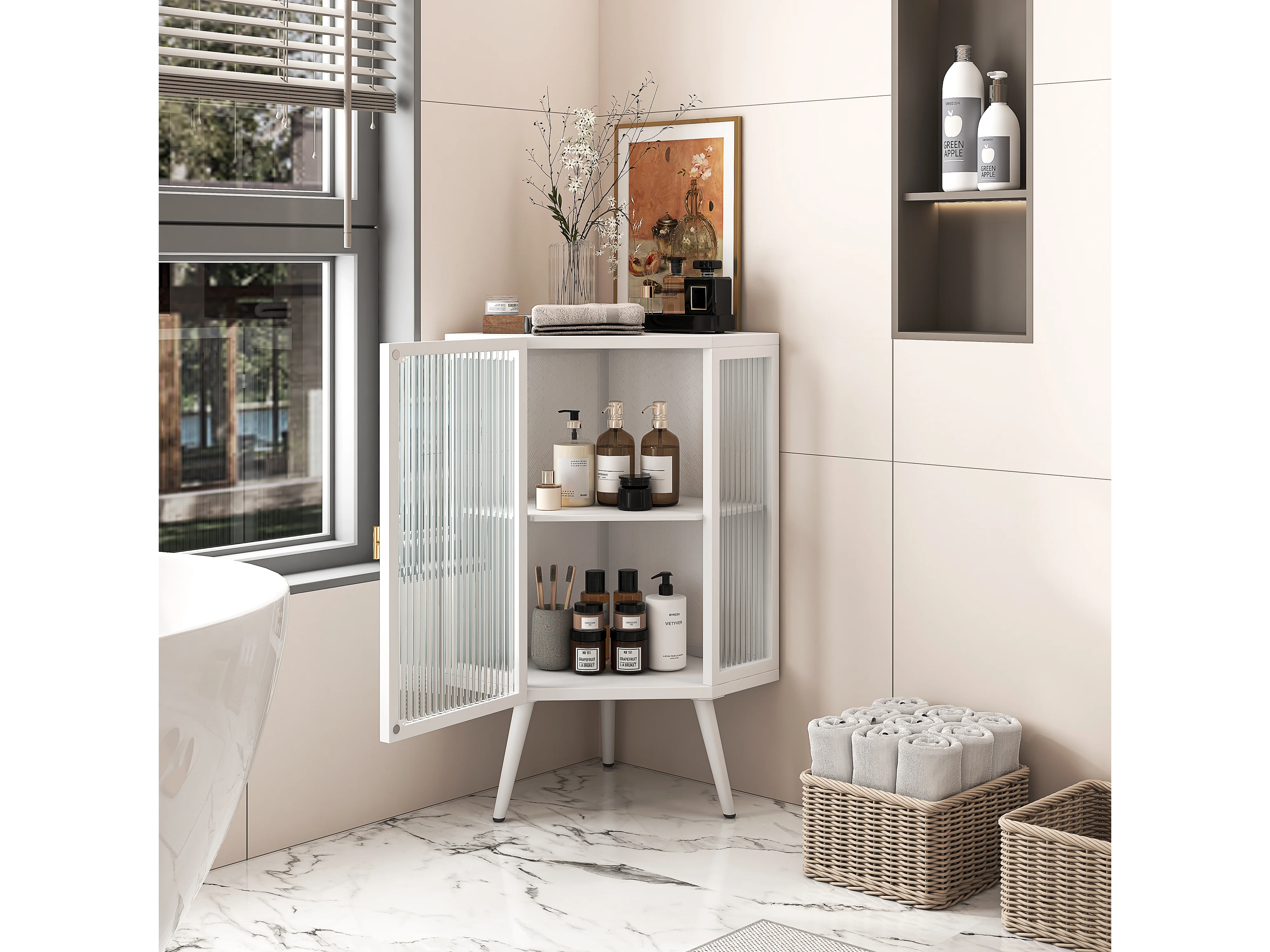 Meuble d'Angle avec Porte en Verre Trempé et Étagère Ajustable pour Salle de Bain, Salon ou Chambre (Blanc)