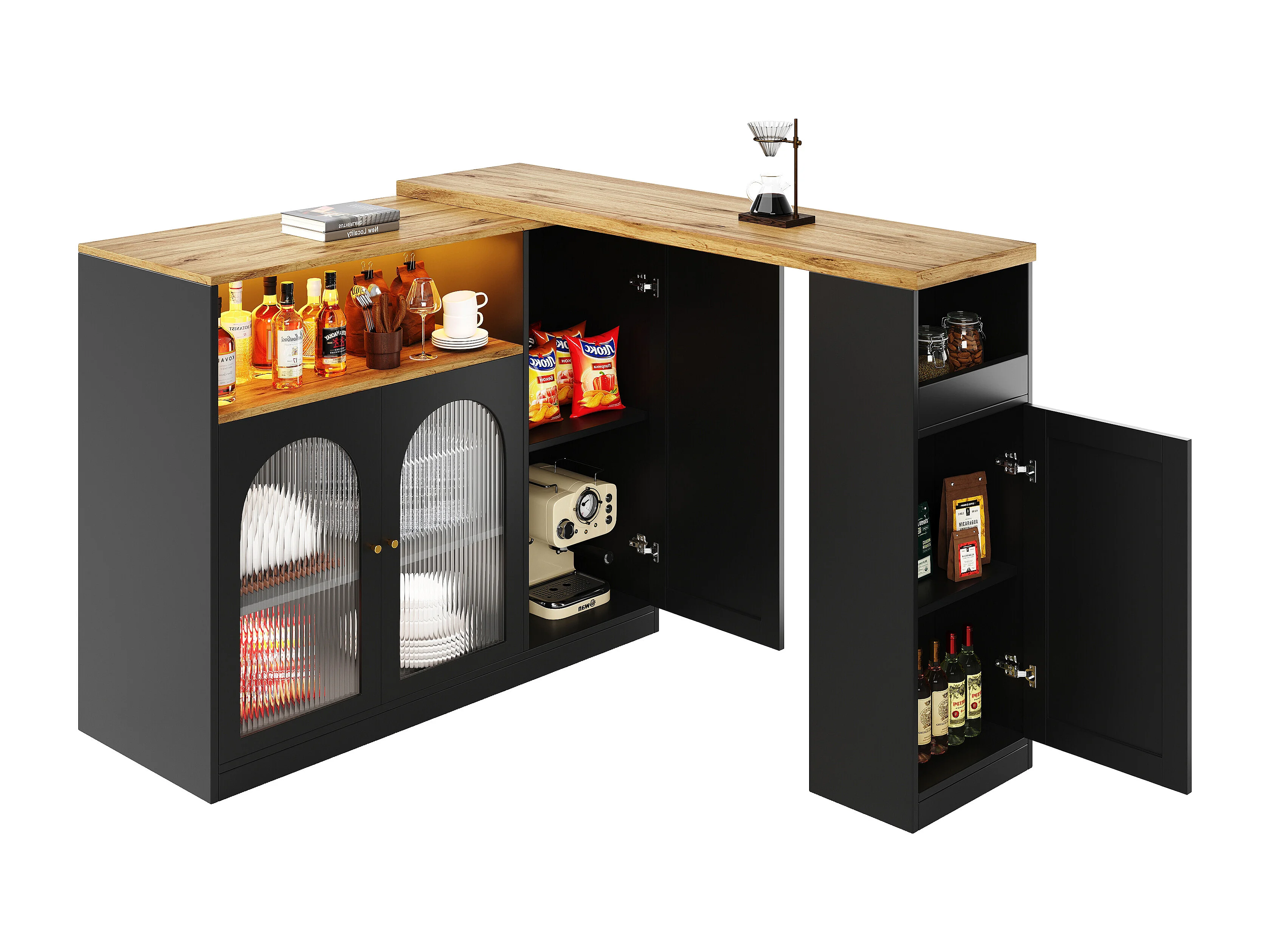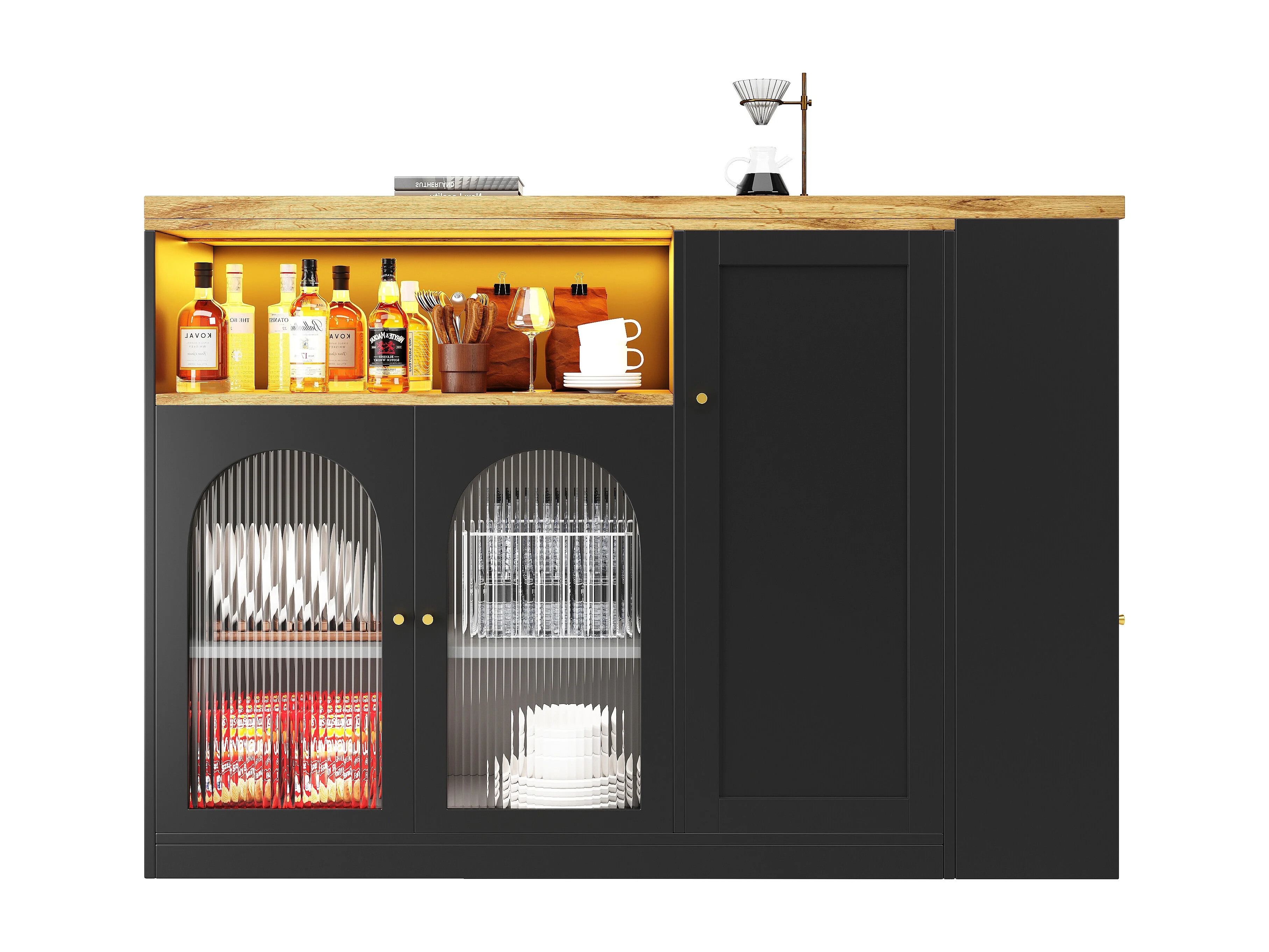 Meuble de bar pivotante avec 4 portes et LED - Portes vitrées -Plateau woodgrain - Noir