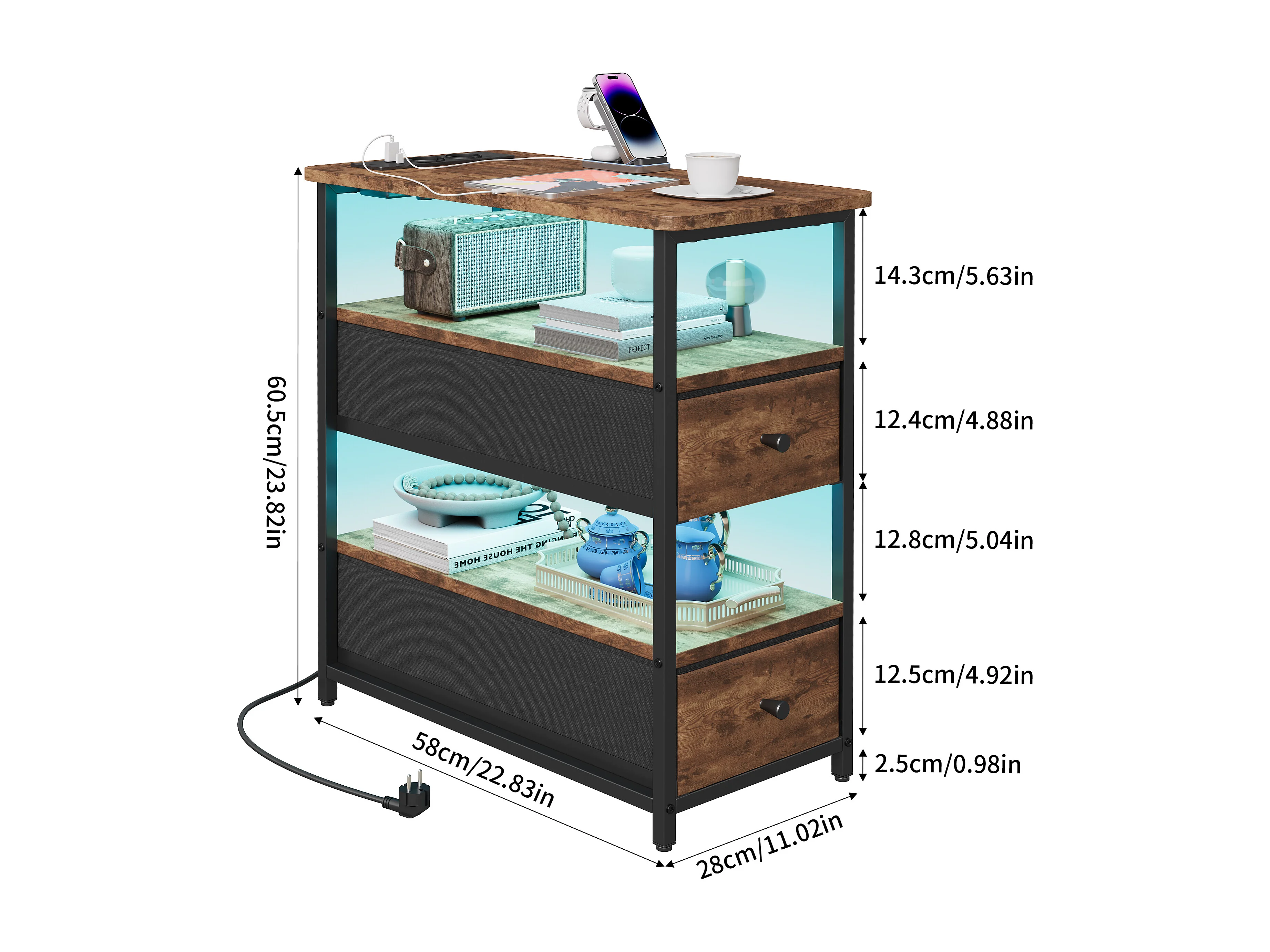 Meuble De Chevet Commode 2 Tiroirs et étagère, Table de Nuit Moderne avec LED et USB, Gris