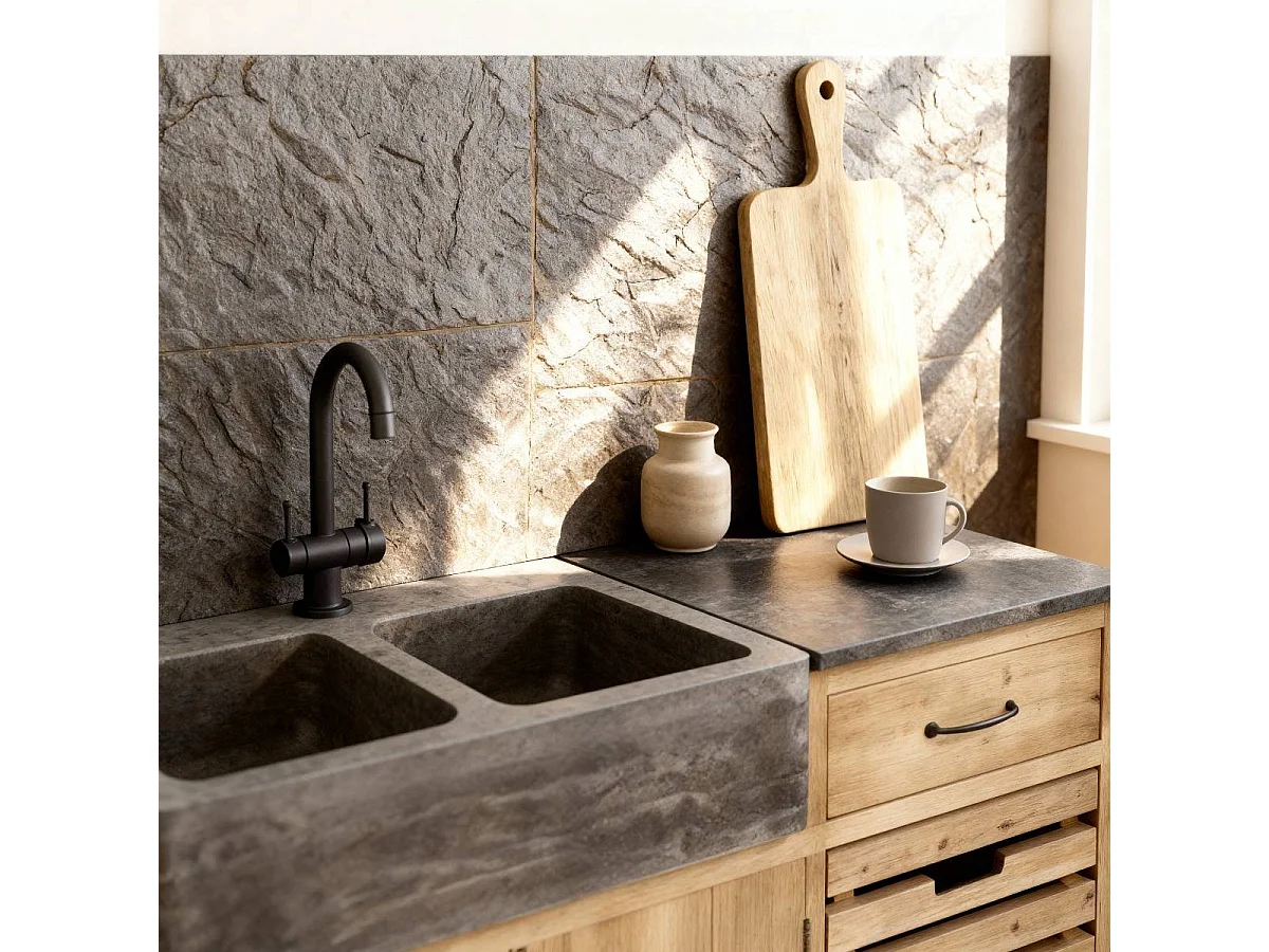 Meuble bas de cuisine en bois recyclé et pierre bleue Romain