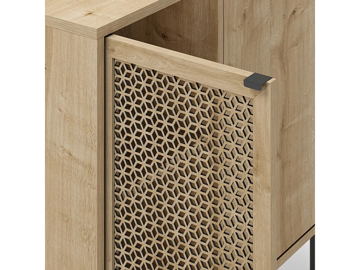 Meuble de rangement 2 portes en mélaminé imitation bois clair avec 1 porte sculptée piètement métal noir - MELISSA