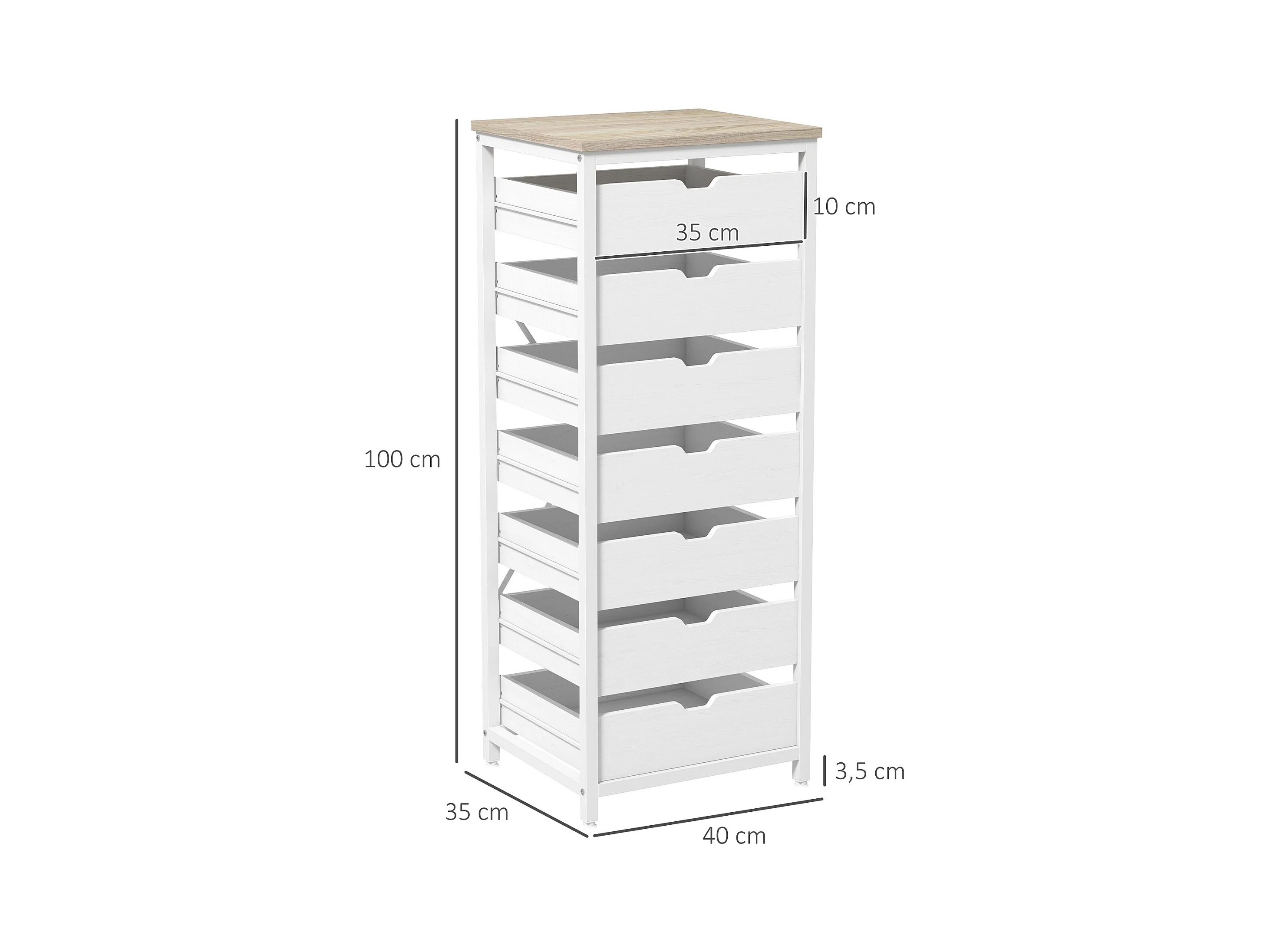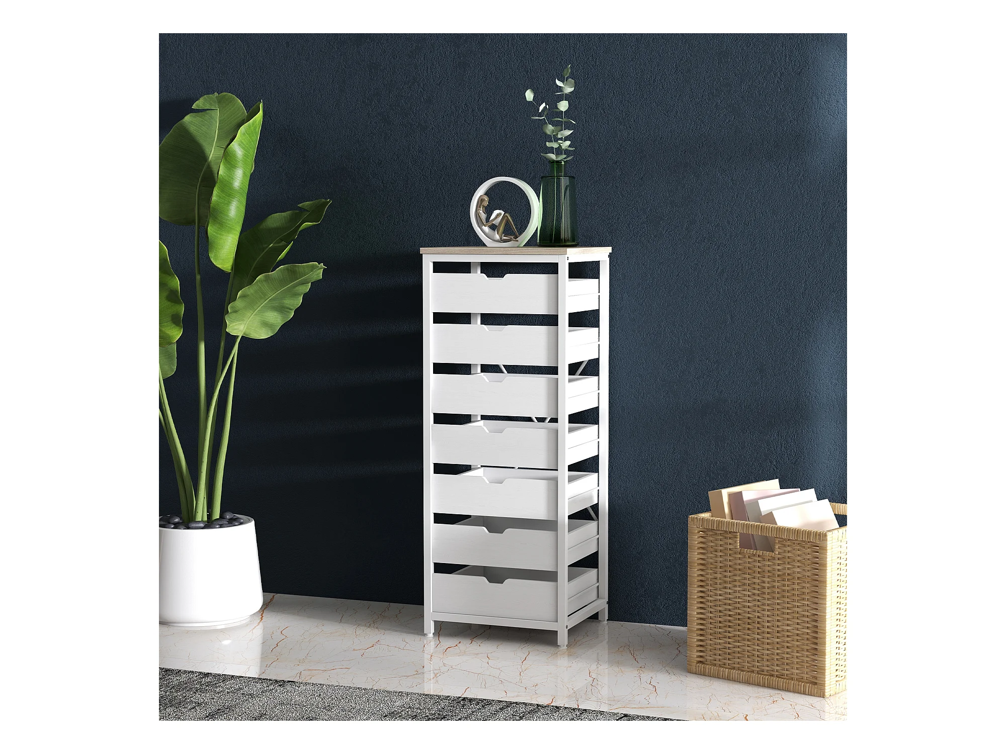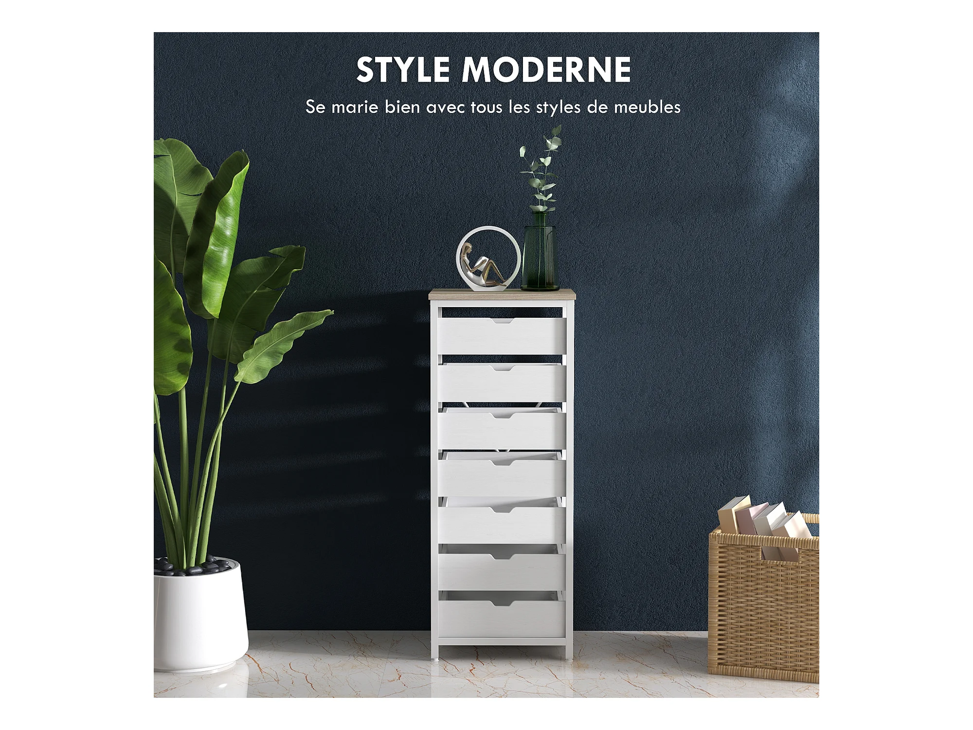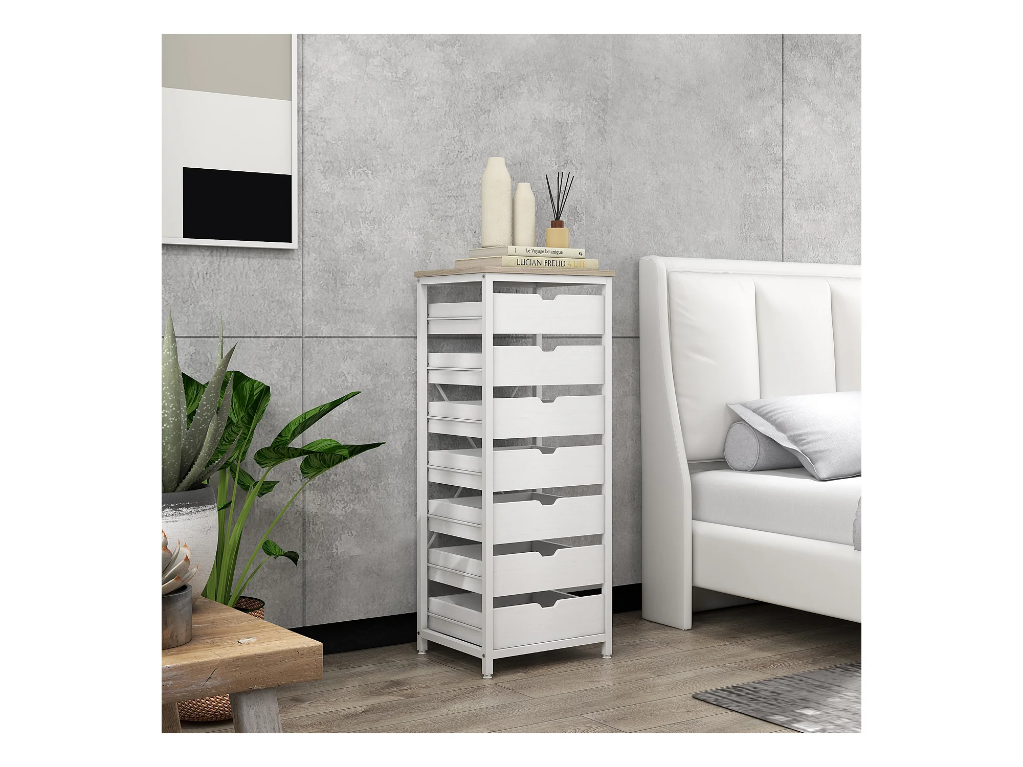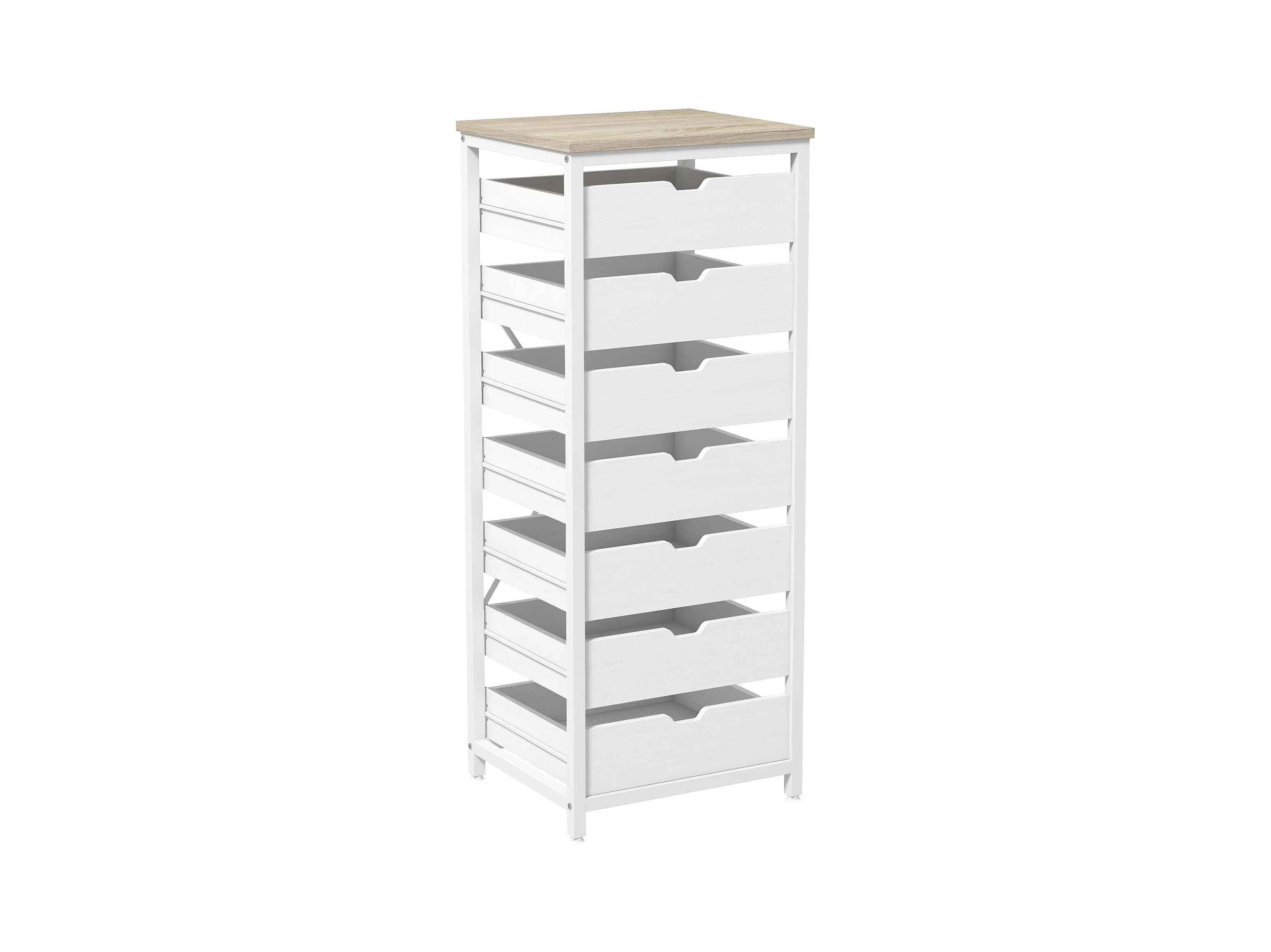 Meuble de rangement chiffonnier moderne 7 tiroirs poignées invisibles acier panneaux blanc chêne clair