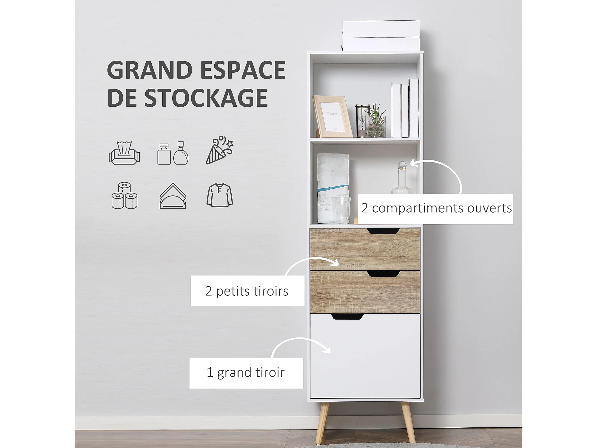 Meuble de rangement colonne design scandinave - 3 tiroirs et 2 niches - piètement effilé incliné bois pin panneaux particules blanc