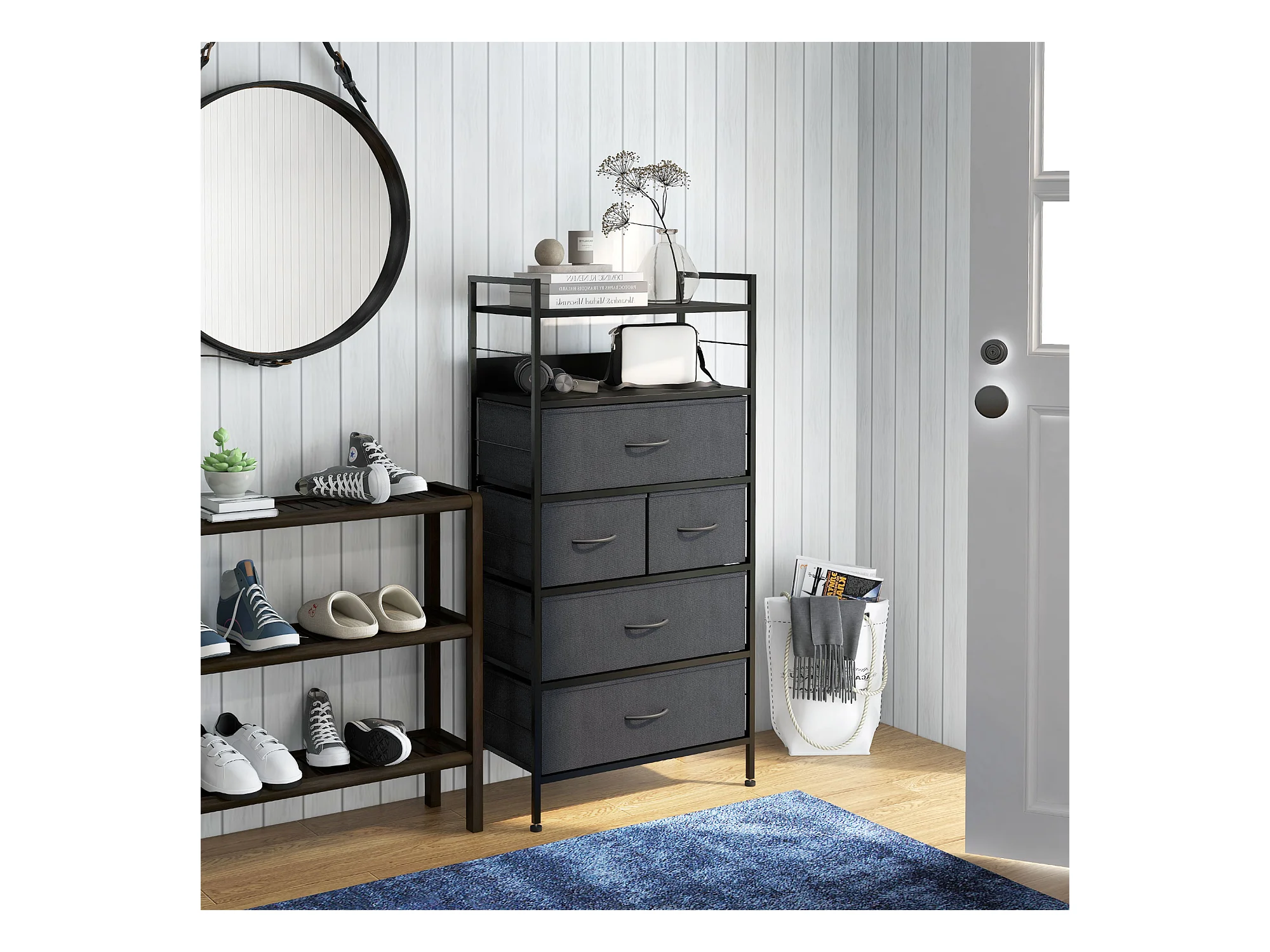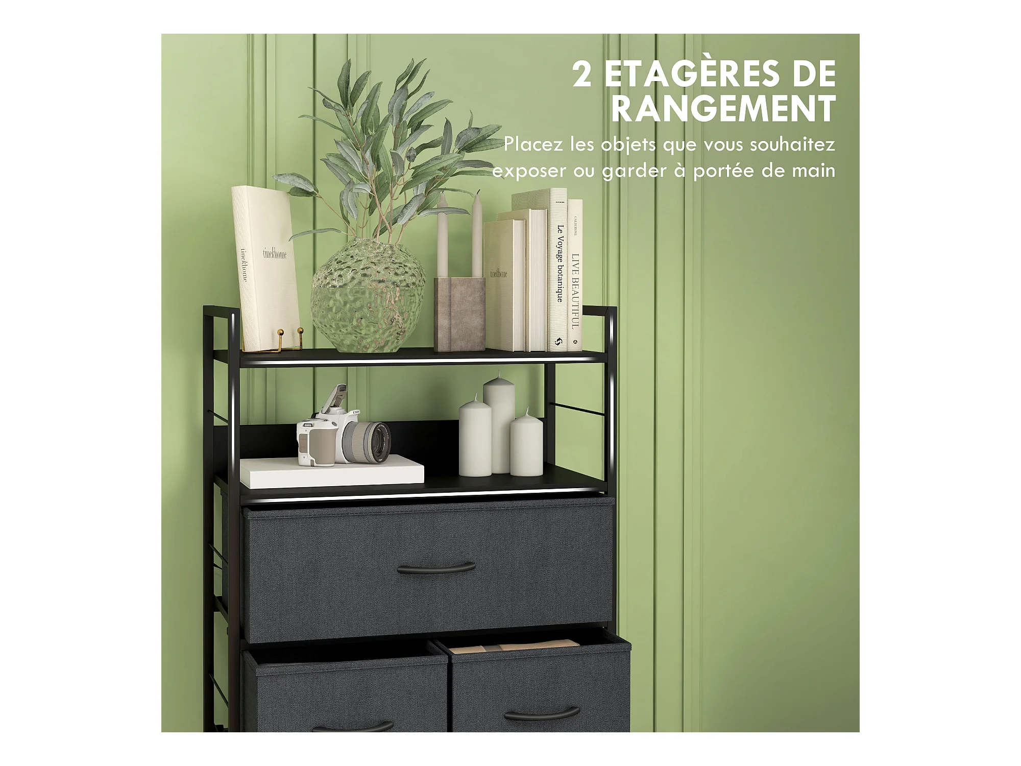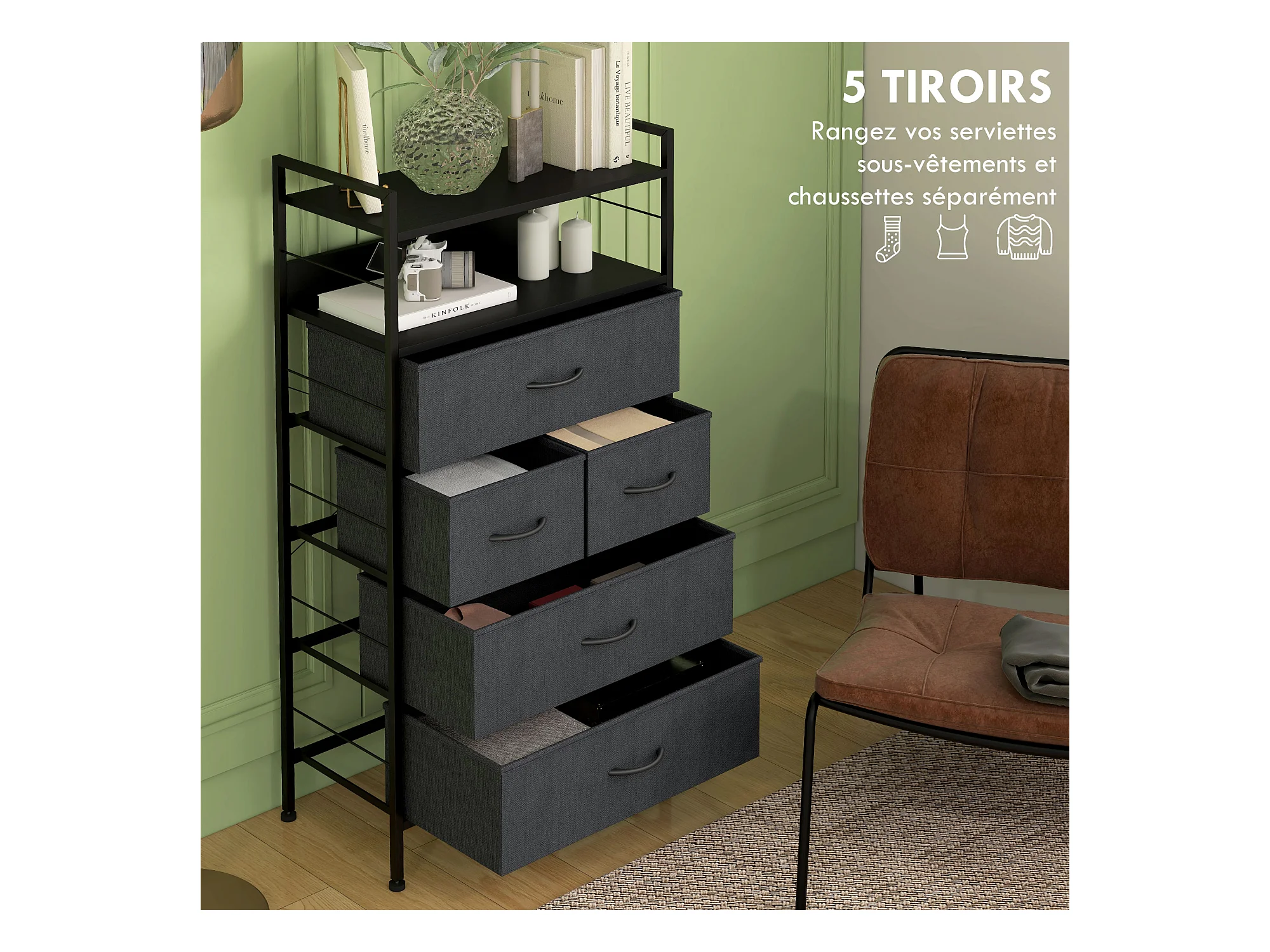 Meuble de rangement commode 5 tiroirs 2 étagères acier MDF non tissé noir