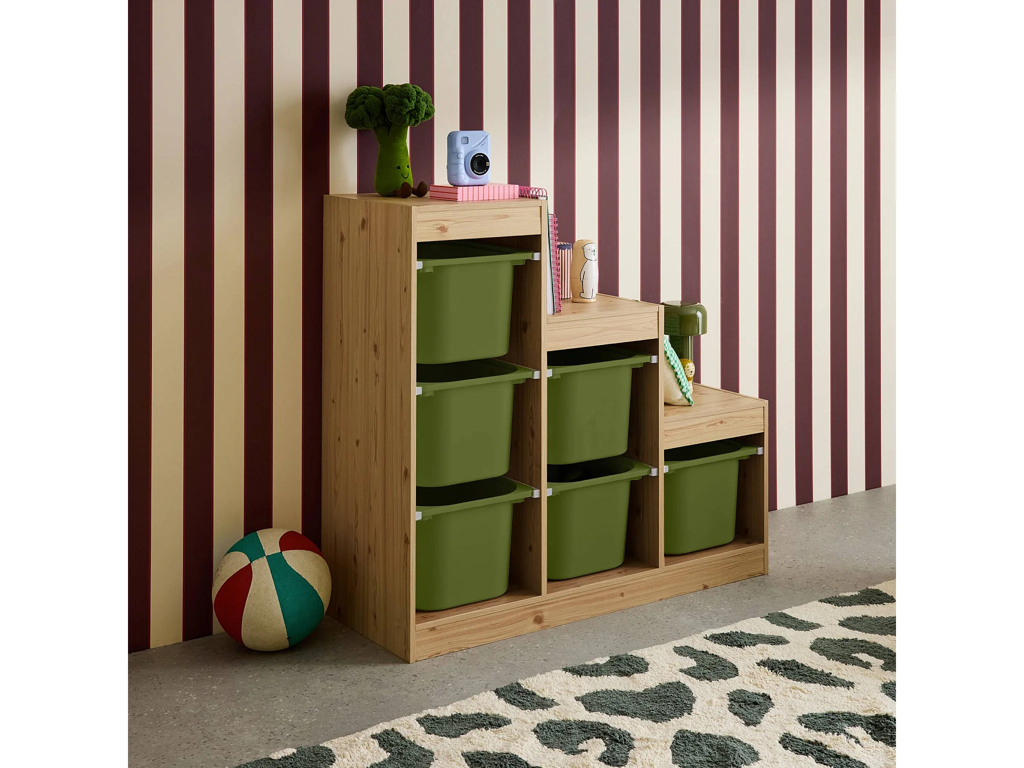 Meuble de rangement naturel pour enfant. 6 bacs en plastique vert olive taupe - Sora