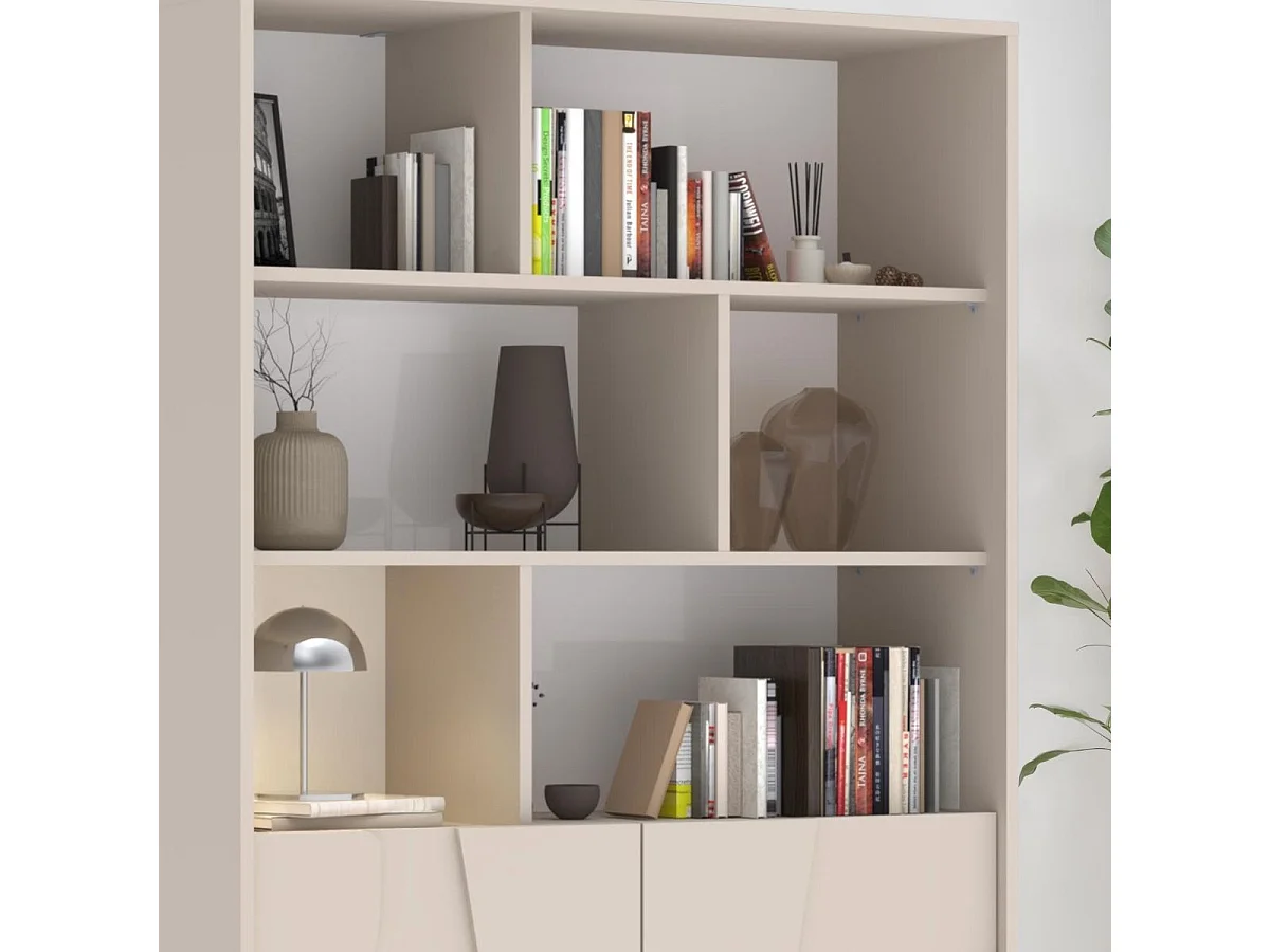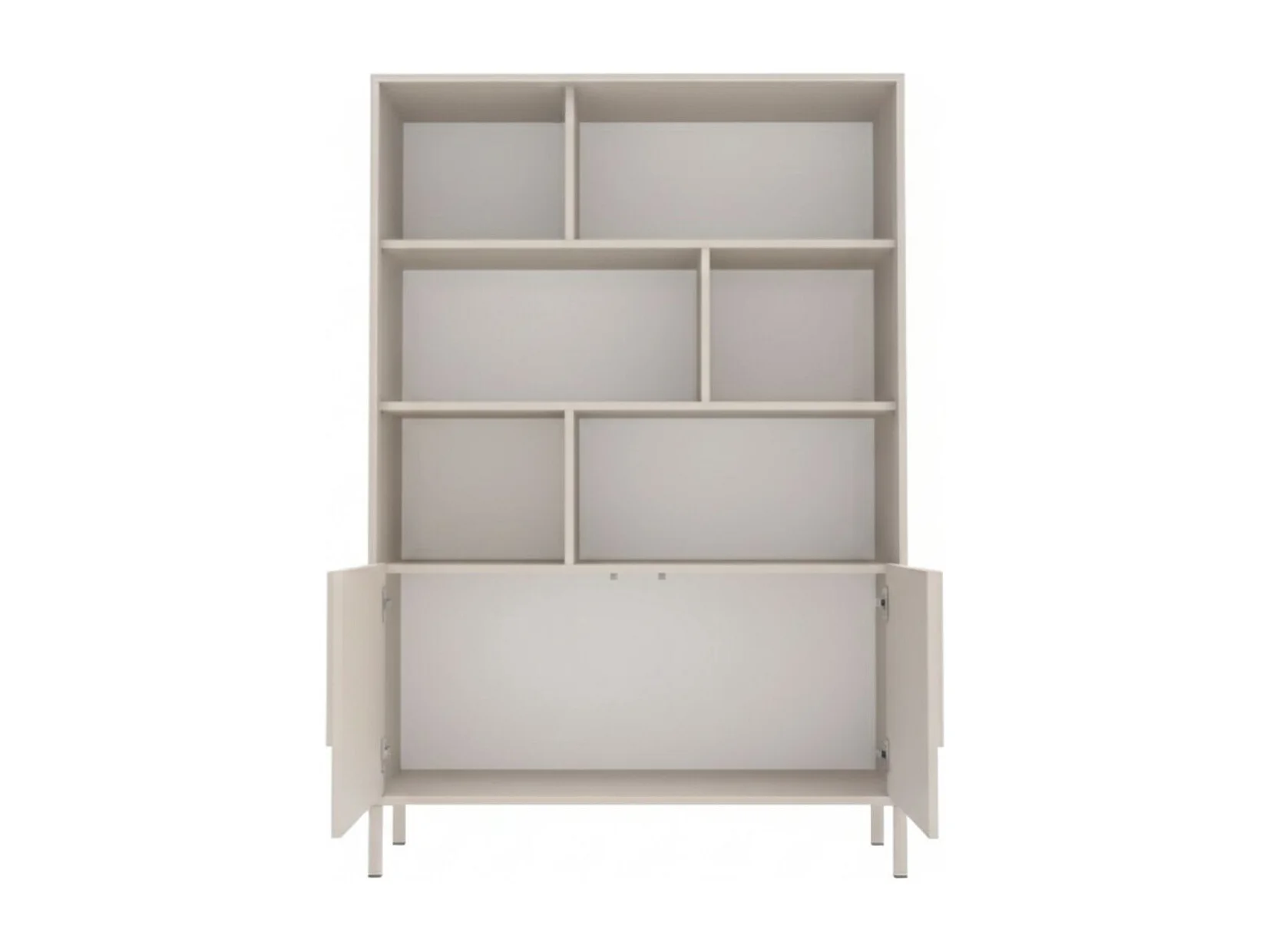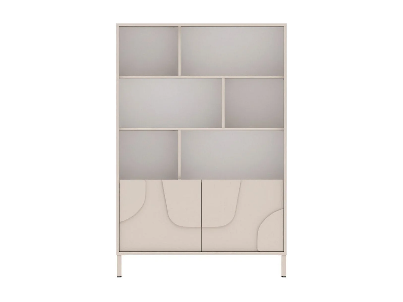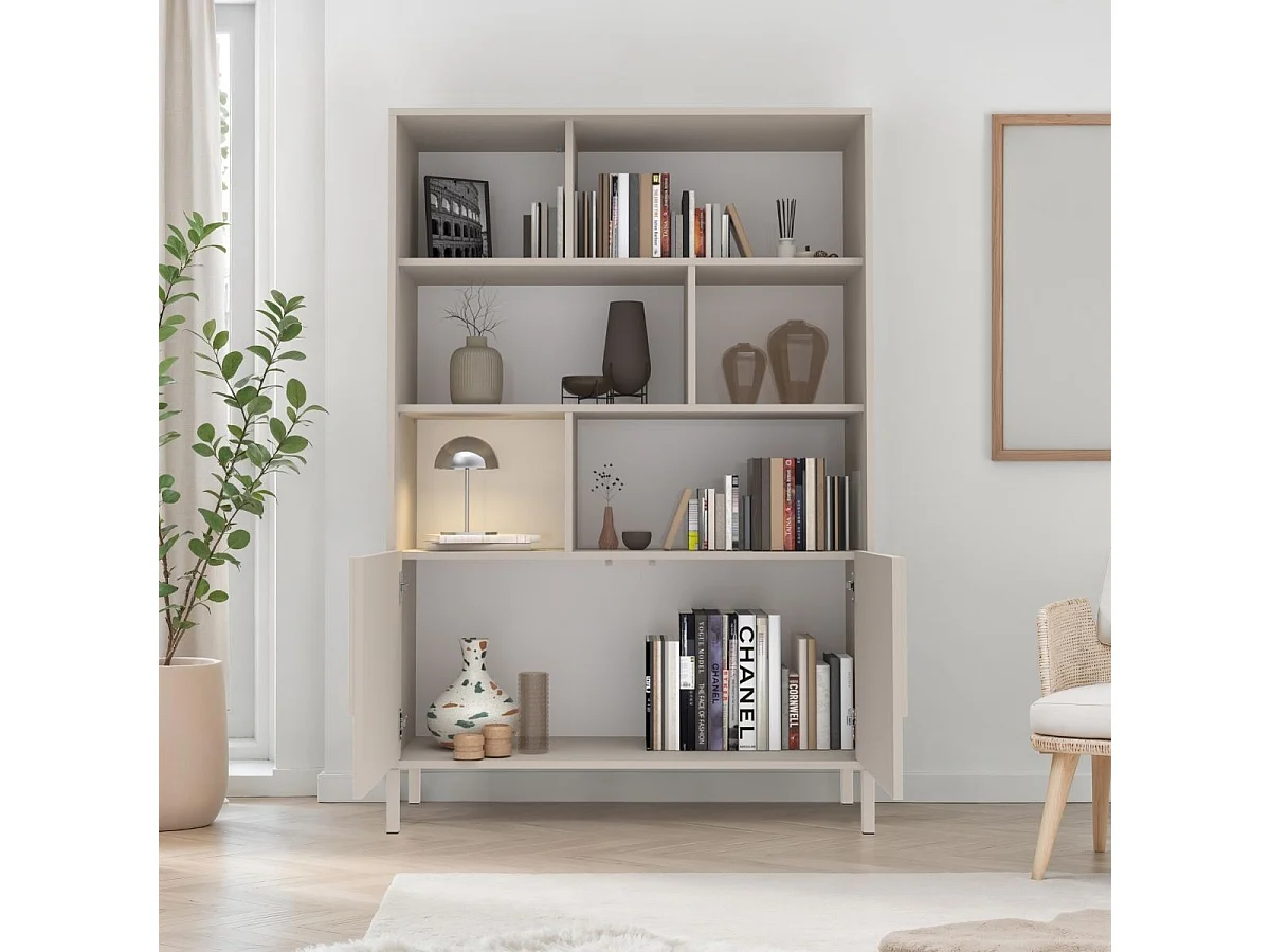 Meuble de rangement étagères 2 portes laqué beige façade relief piètement métal - EGERIE
