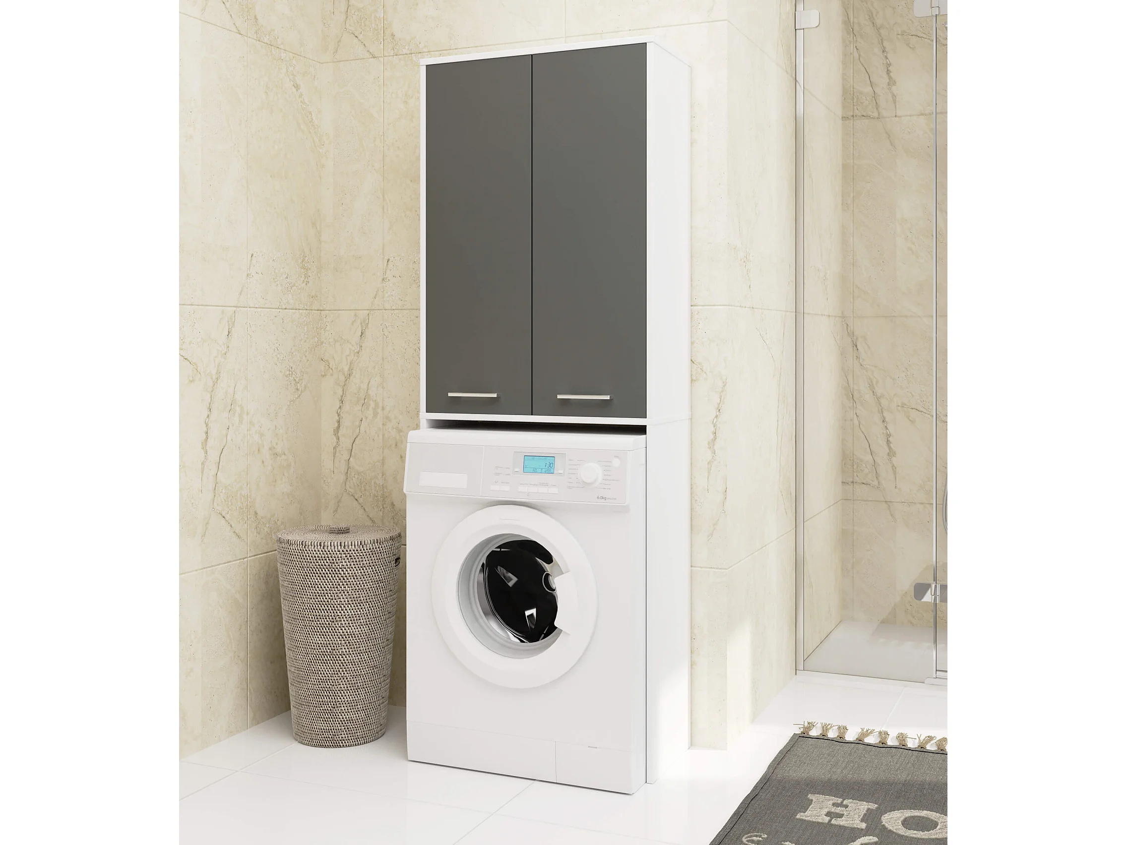 Meuble pour machine à laver FIN Blanche 64 cm 2 portes façade Gris Graphite niche 4 étagères 64x30x180 cm