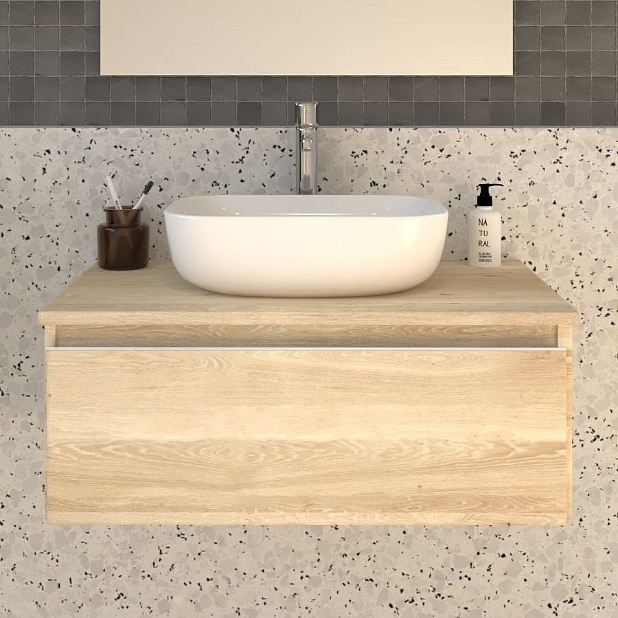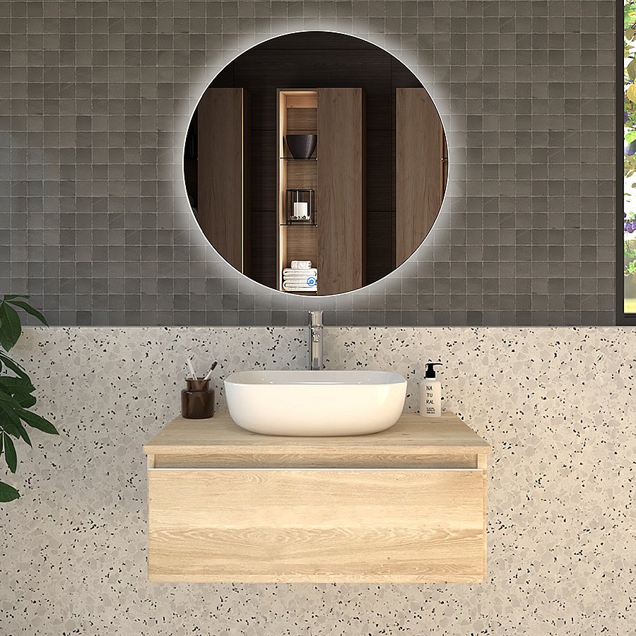 Meuble de salle de bain 1 tiroir avec vasque à poser arrondie PENA et miroir Led SOLEN - Bambou (chêne clair) - 80cm