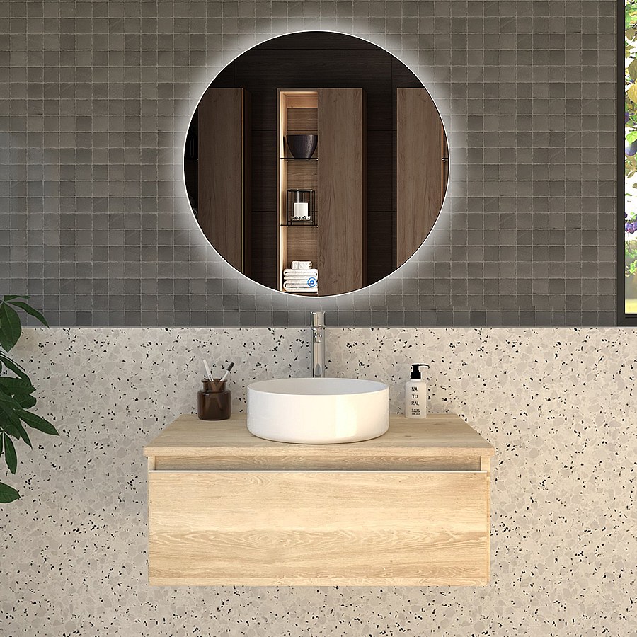 Meuble de salle de bain 1 tiroir avec vasque à poser ronde PENA et miroir Led SOLEN - Bambou (chêne clair) - 80cm