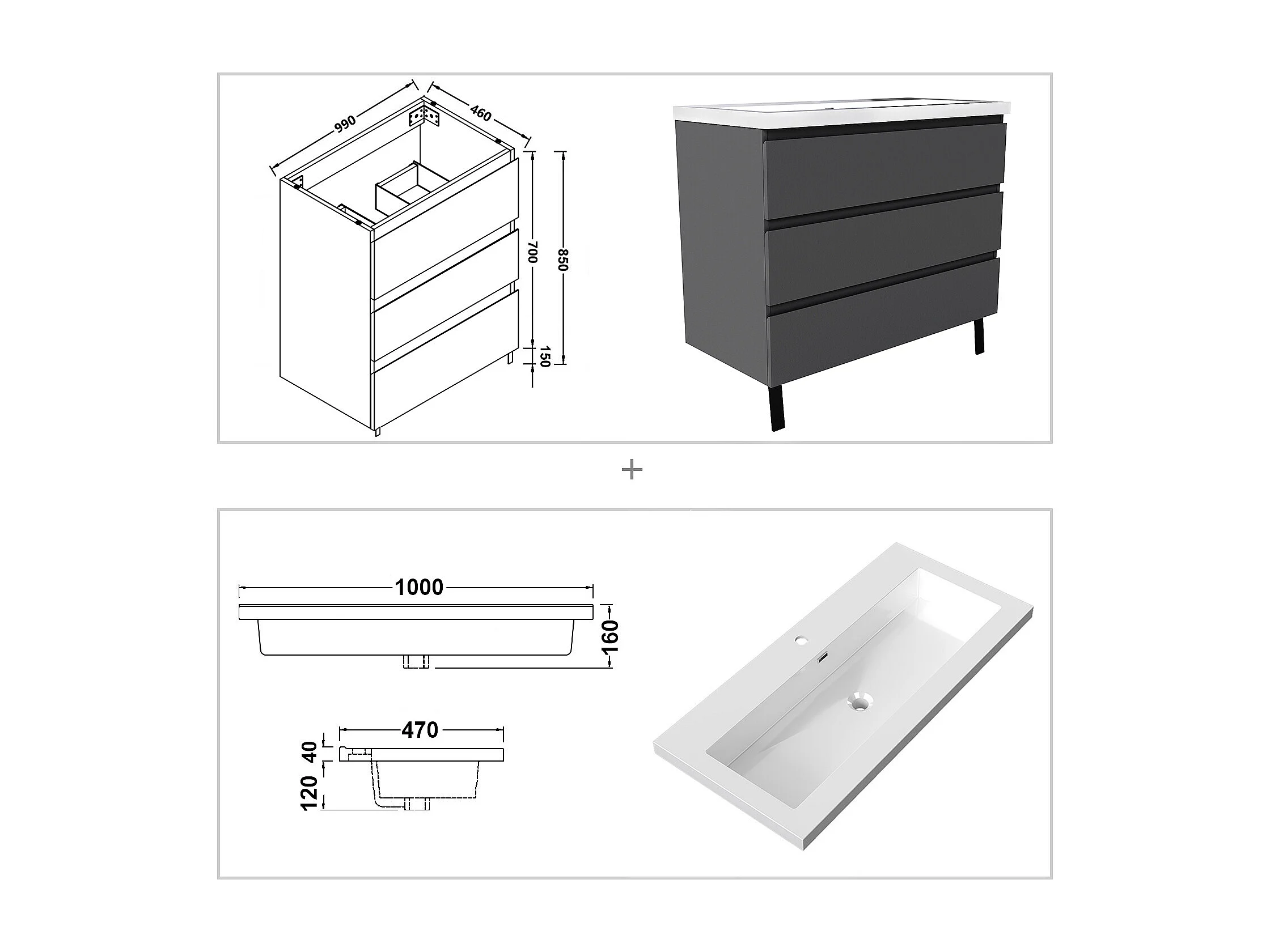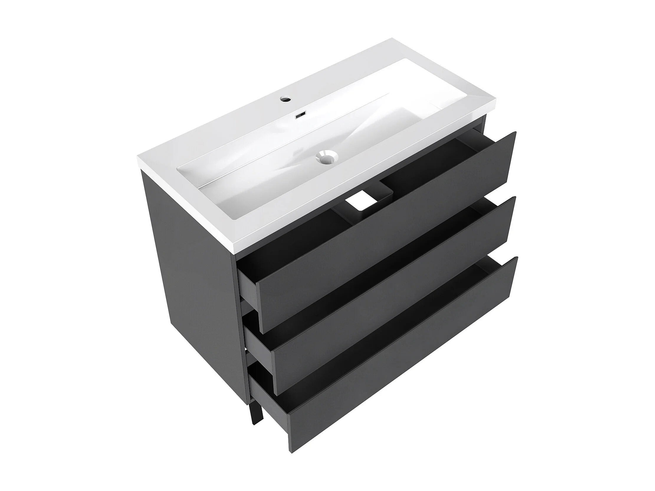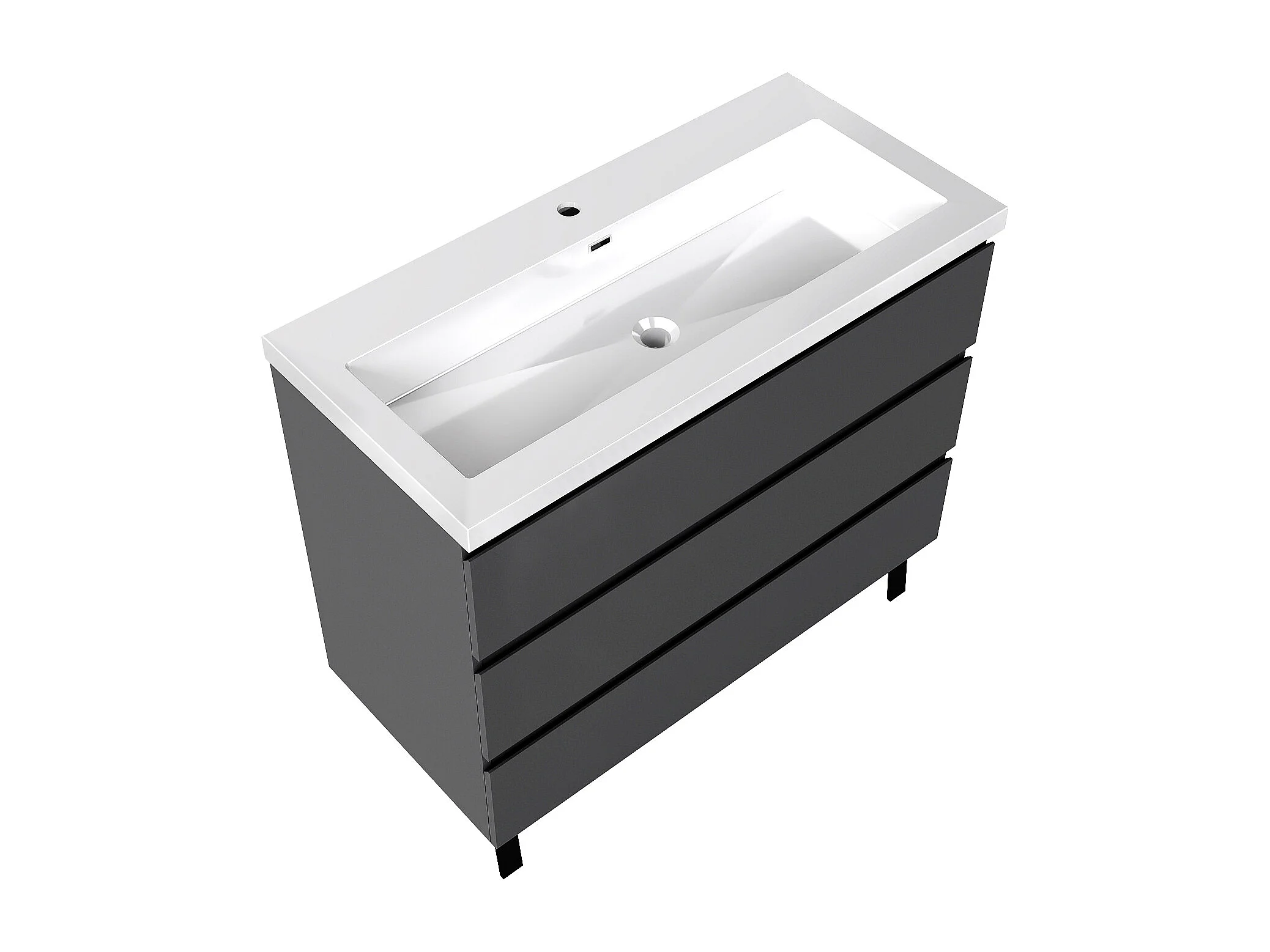 Meuble de Salle de Bain 100cm avec 3 tiroirs + 2 Pieds, Meuble simple vasque, Anthracite