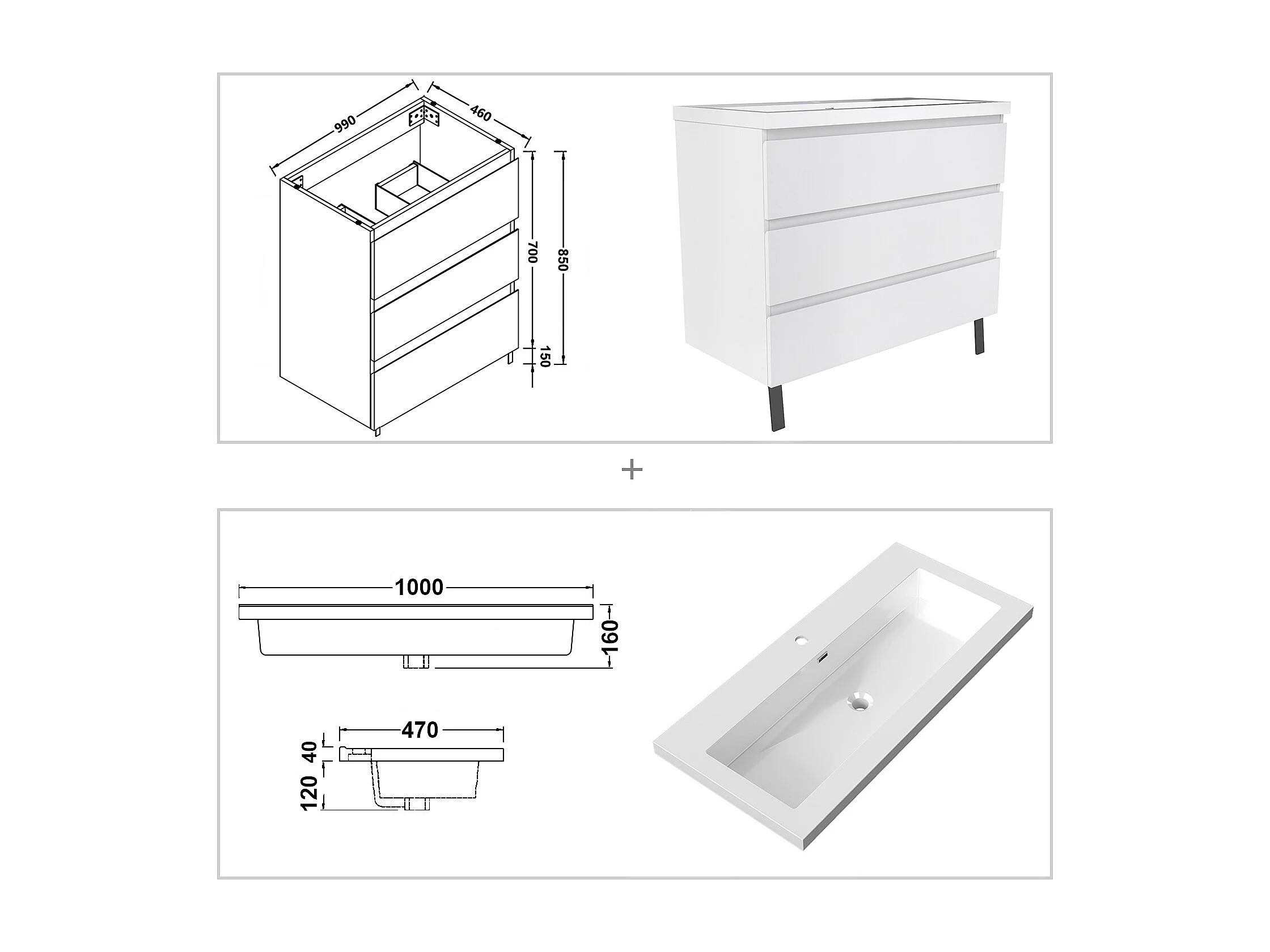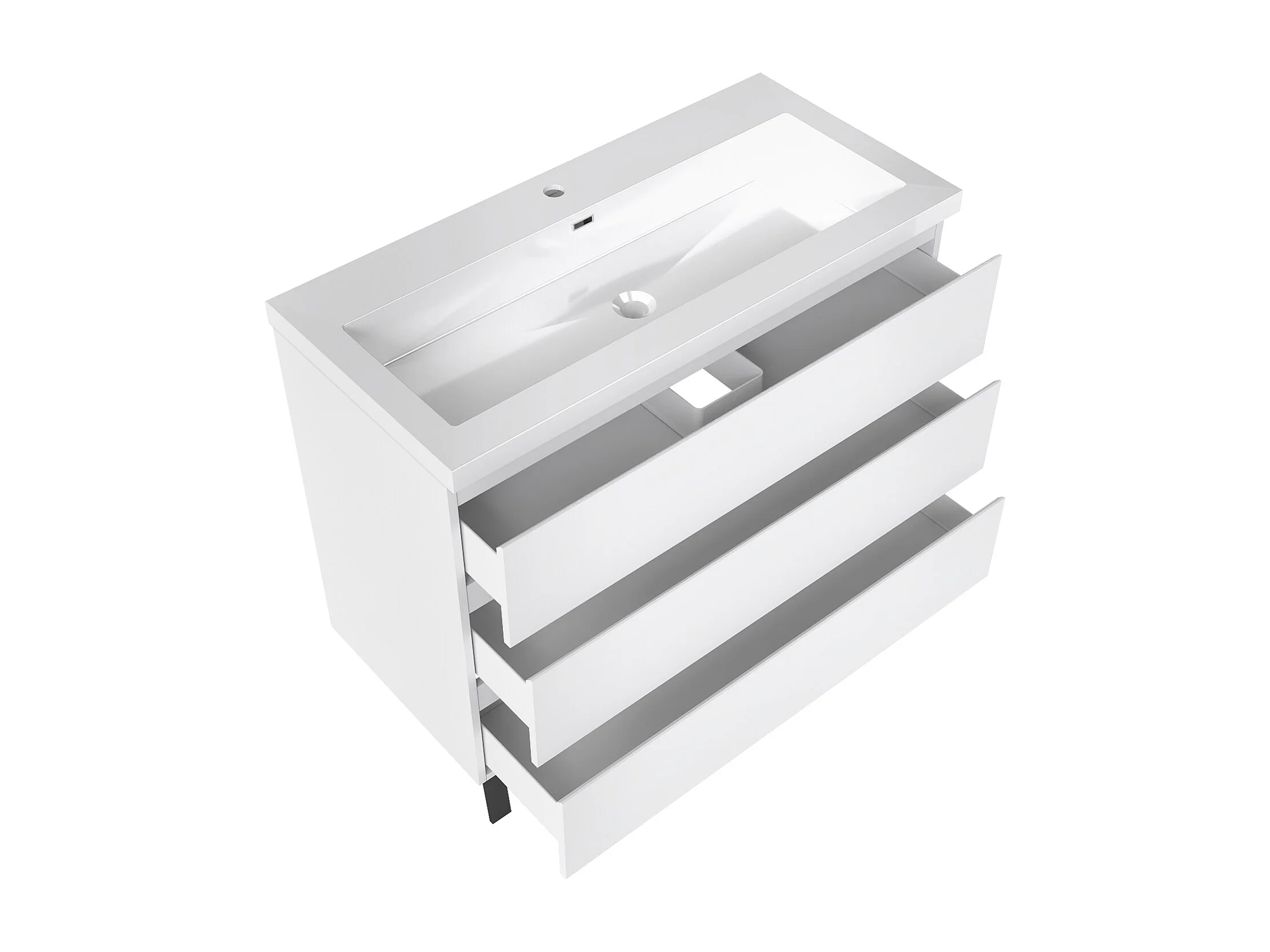 Meuble de Salle de Bain 100cm avec 3 tiroirs + 2 Pieds, Meuble simple vasque, Blanc