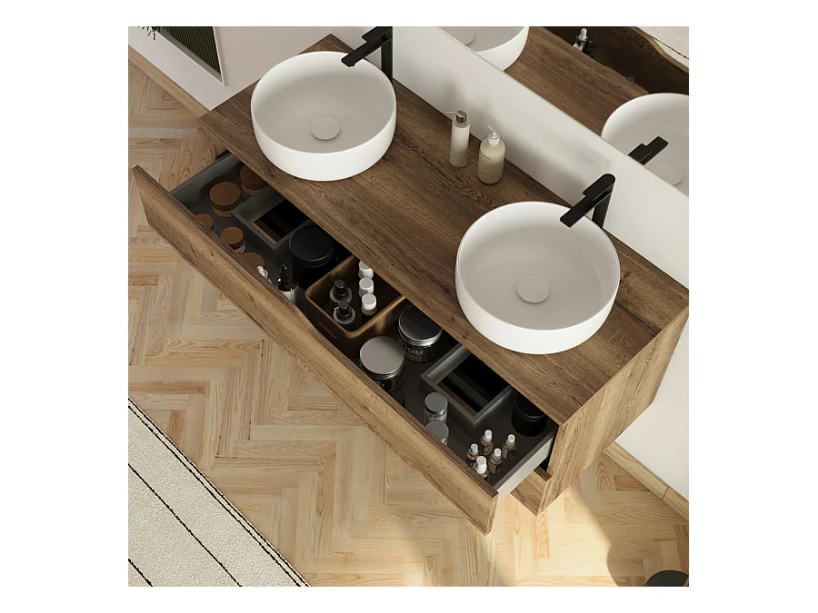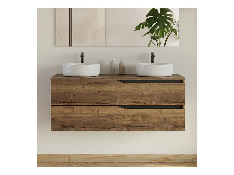 Meuble de salle de bain 120cm avec plateau et 2 vasques à poser Ares - 2 tiroirs - sans miroir - tabaco (chêne foncé) - LUNA