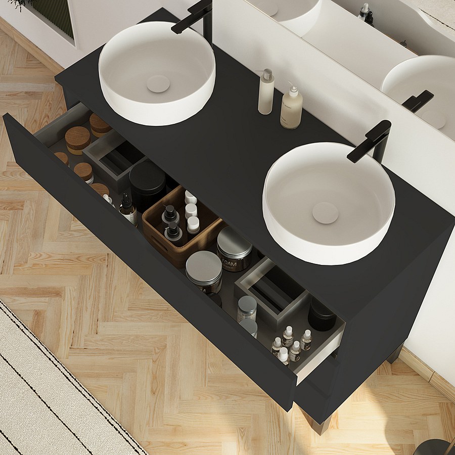Meuble de salle de bain 120cm avec plateau et 2 vasques à poser Ares - 3 tiroirs - sans miroir - noir - MATA