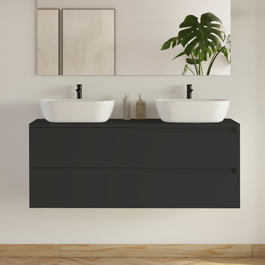 Meuble de salle de bain 120cm avec plateau et 2 vasques à poser Zeus - 2 tiroirs - noir - LUNA